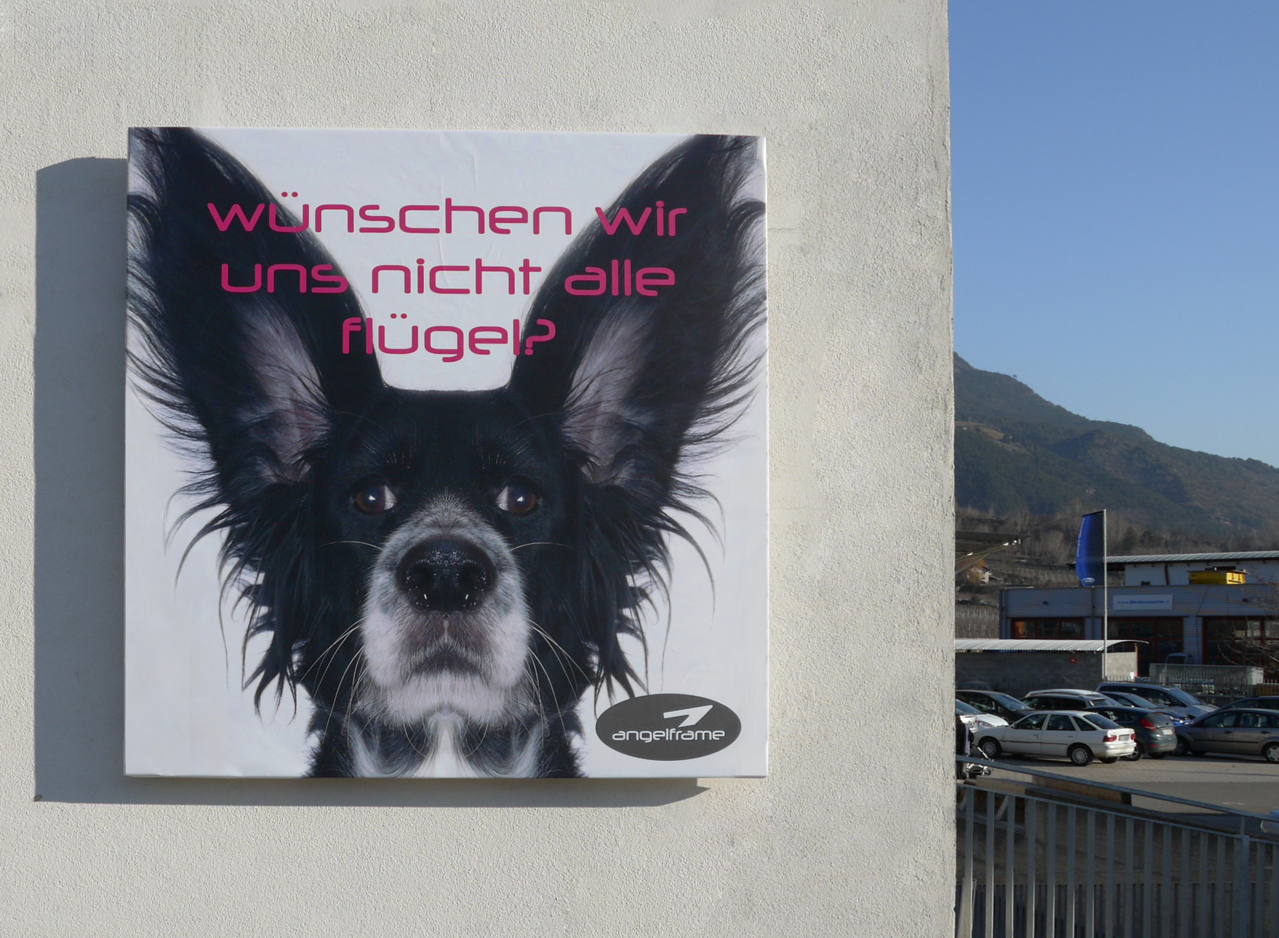 Das Angelframe Design erinnert an einen klassischen Keilrahmen für Leinwände: Der Werbebanner wird um den Rahmen geschlagen, was für eine saubere, faltenfreie Präsentation sorgt. Dank der Wandbefestigung mit Abstand zur Fassade entsteht der Eindruck, dass das Banner frei schwebt – ideal für eine besonders moderne und ansprechende Optik.