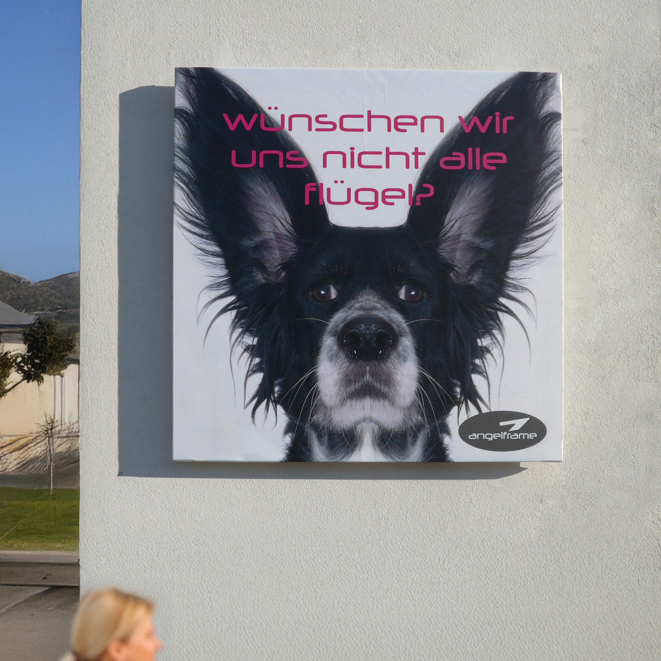 Unsichtbarer, schwebender Large Format Rahmen Angelframe. Der Rahmen kann individuell an die Größe Ihres Banners angepasst werden, egal ob kleine Banner oder riesige Werbeflächen – alles ist möglich! Dank des modularen Aufbaus lassen sich auch besonders große Werbeflächen problemlos umsetzen.Das Angelframe Design erinnert an einen klassischen Keilrahmen für Leinwände: Der Werbebanner wird um den Rahmen geschlagen, was für eine saubere, faltenfreie Präsentation sorgt. Dank der Wandbefestigung mit Abstand zur Fassade entsteht der Eindruck, dass das Banner frei schwebt – ideal für eine besonders moderne und ansprechende Optik. Dabei ist Angelframe robust und wetterbeständig und auch bei widrigen Witterungsbedingungen ist sein sicherer Halt garantiert. Perfekt für langfristige Außenwerbung an Fassaden und Gebäuden. Durch das durchdachte Montagesystem ist der Aufbau des Rahmens besonders einfach und schnell – auch bei größeren Projekten. Für Werbetechniker und Druckprofis ist Angelframe die praktische und zeitsparende Lösung mit dem besonderen Look.