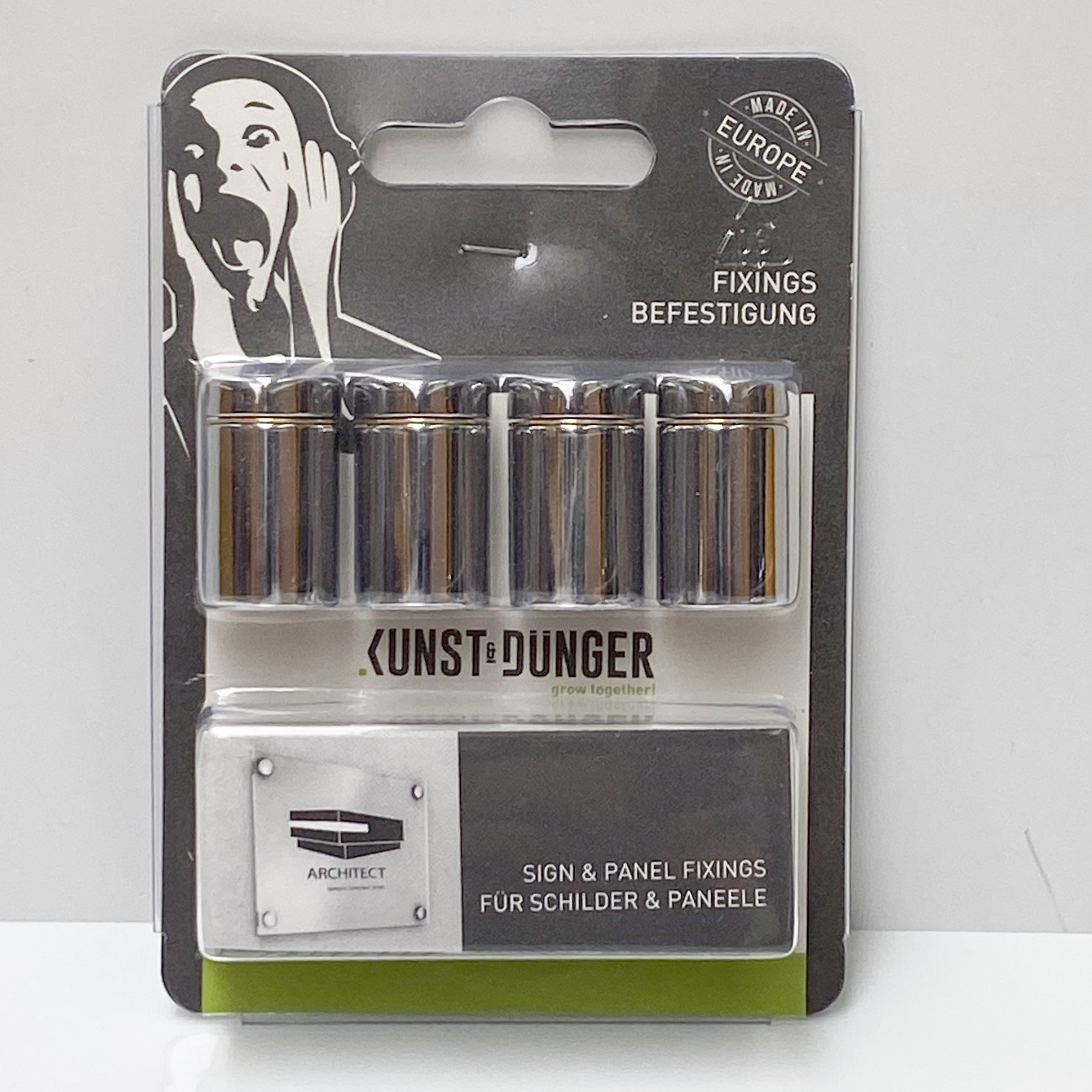 Schild vor Ort anschrauben, Dekokappe aufdrücken.
