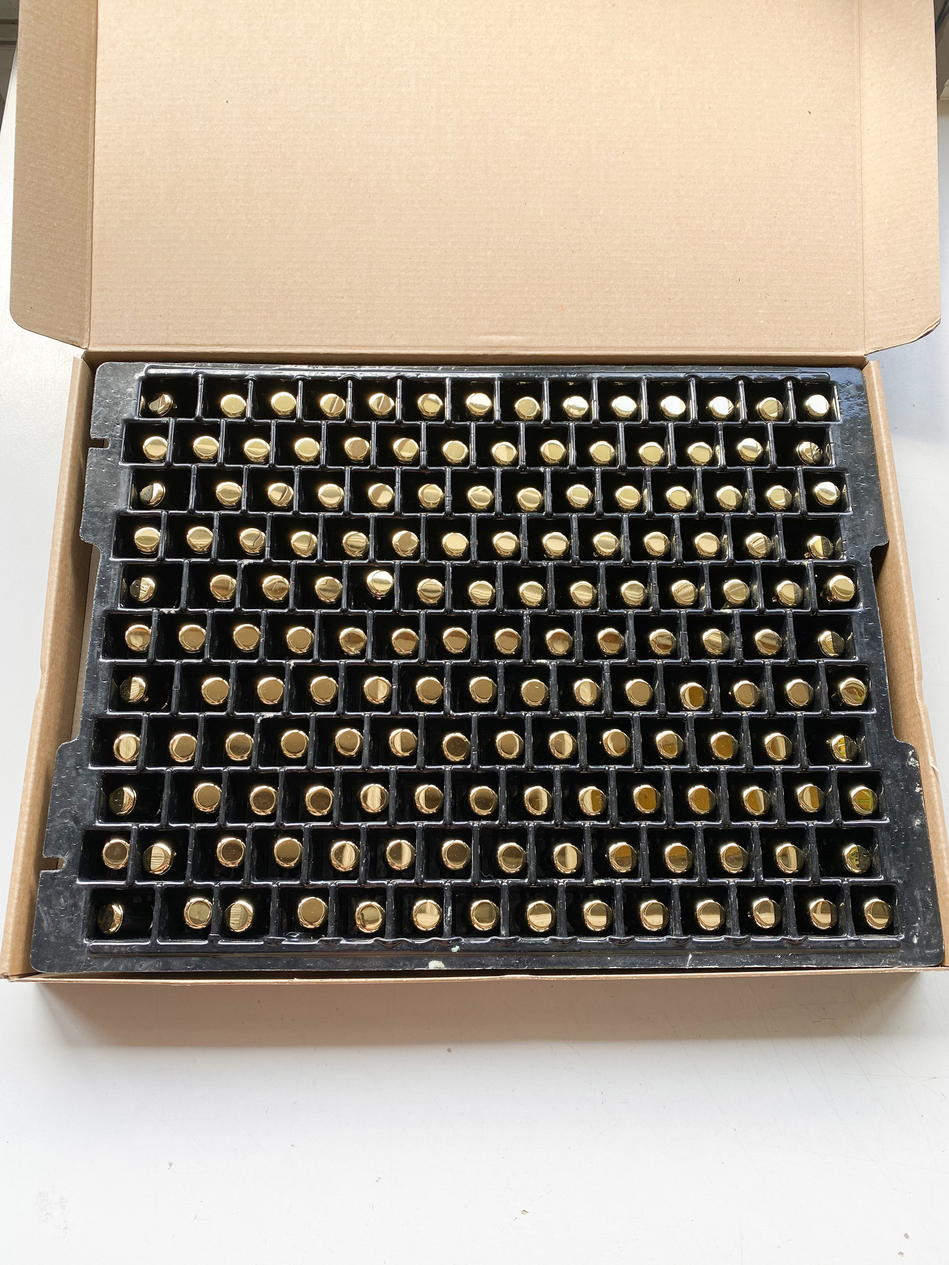 Material: Messing, Hülse vernickelt, Dekokappe glanz vergoldet.