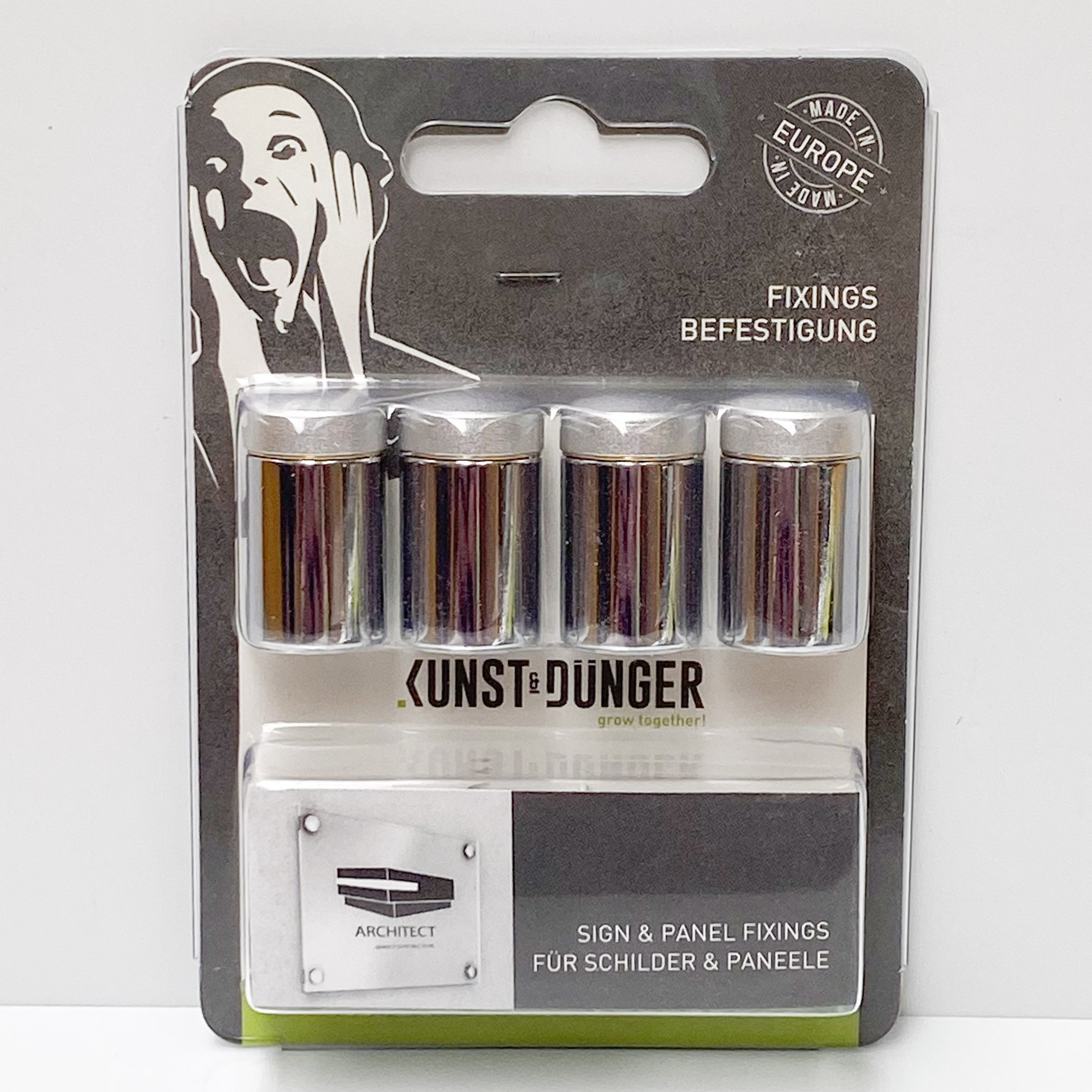 Schild vor Ort anschrauben, Dekokappe aufdrücken.