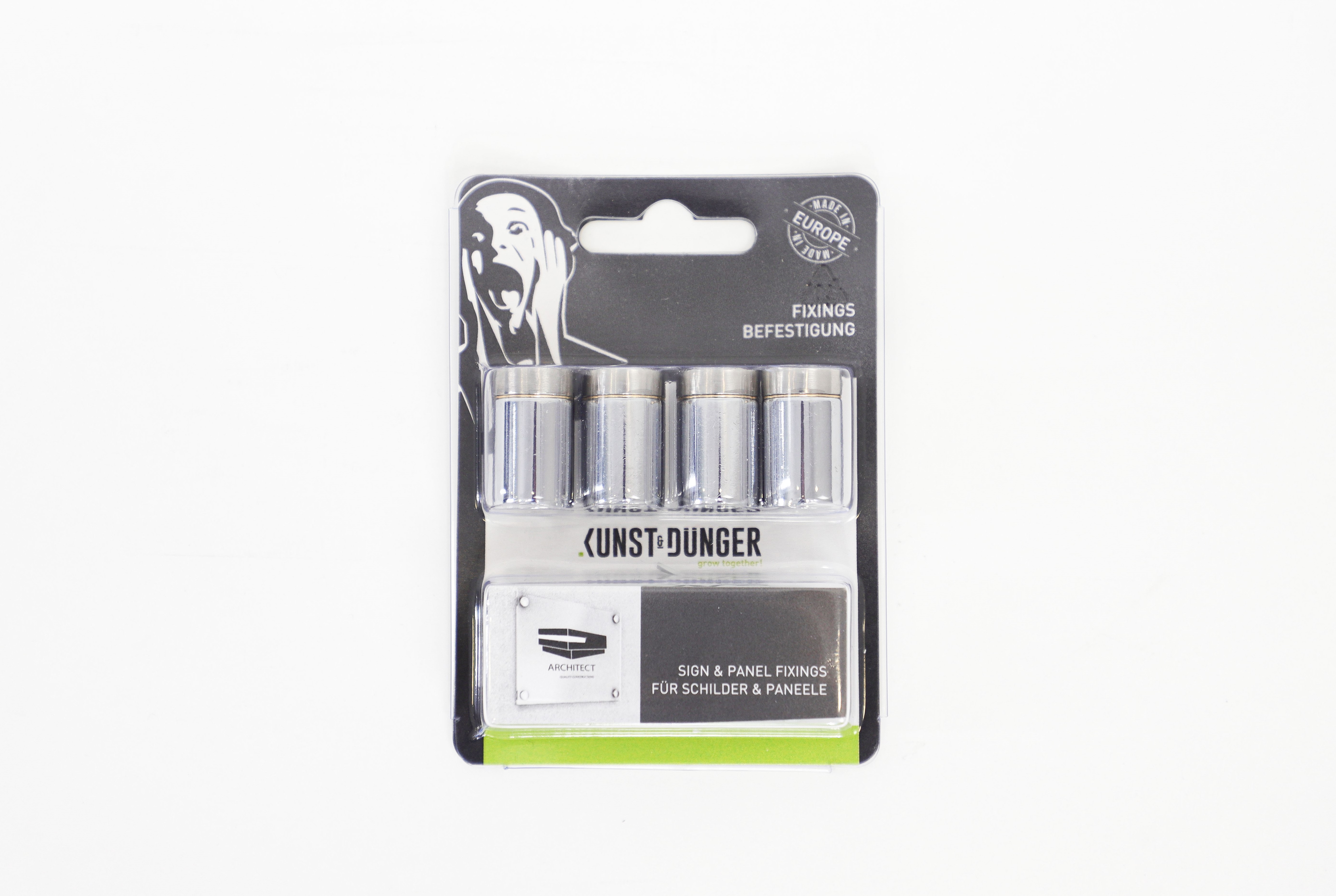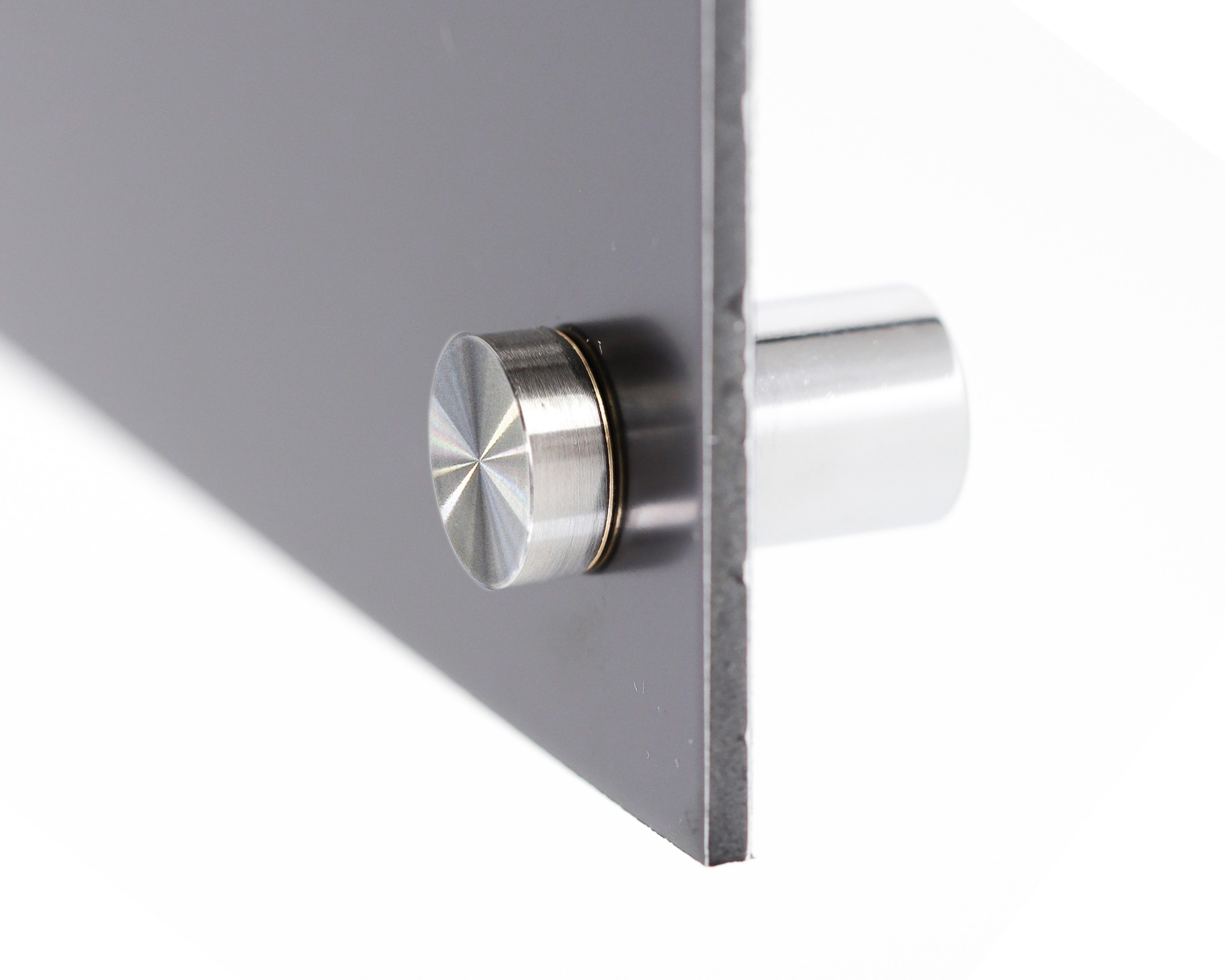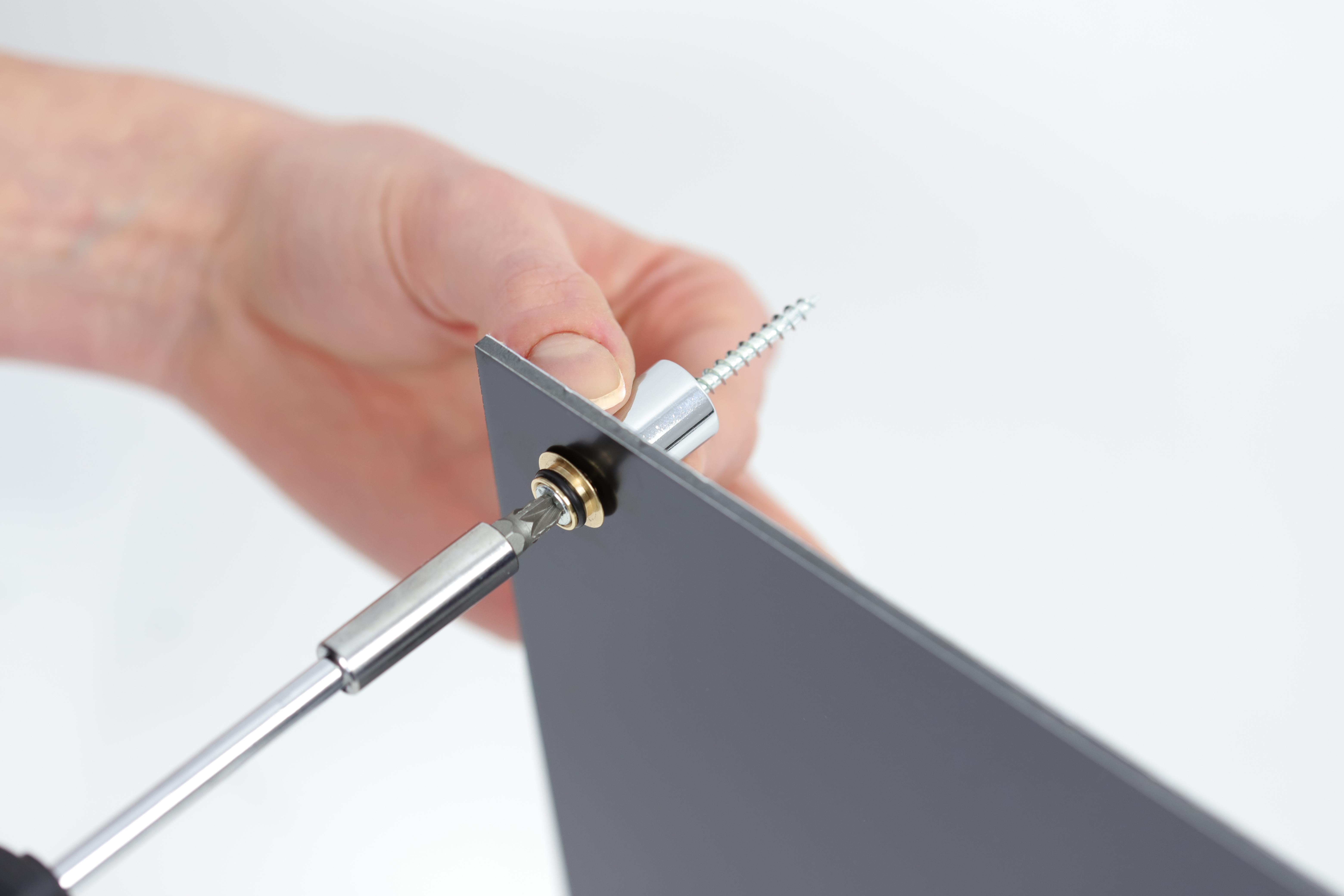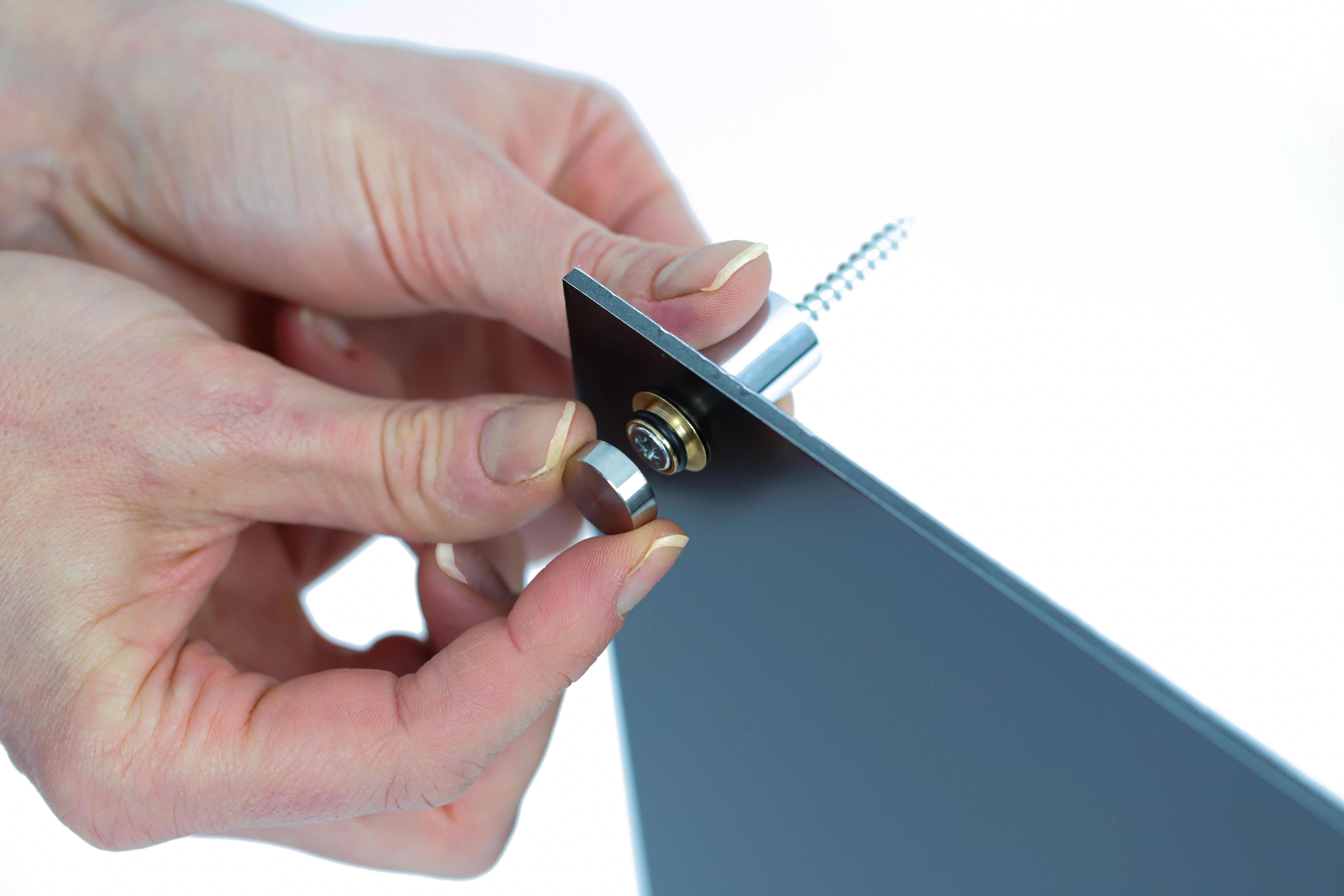 Schild vor Ort anschrauben, Dekokappe aufdrücken.