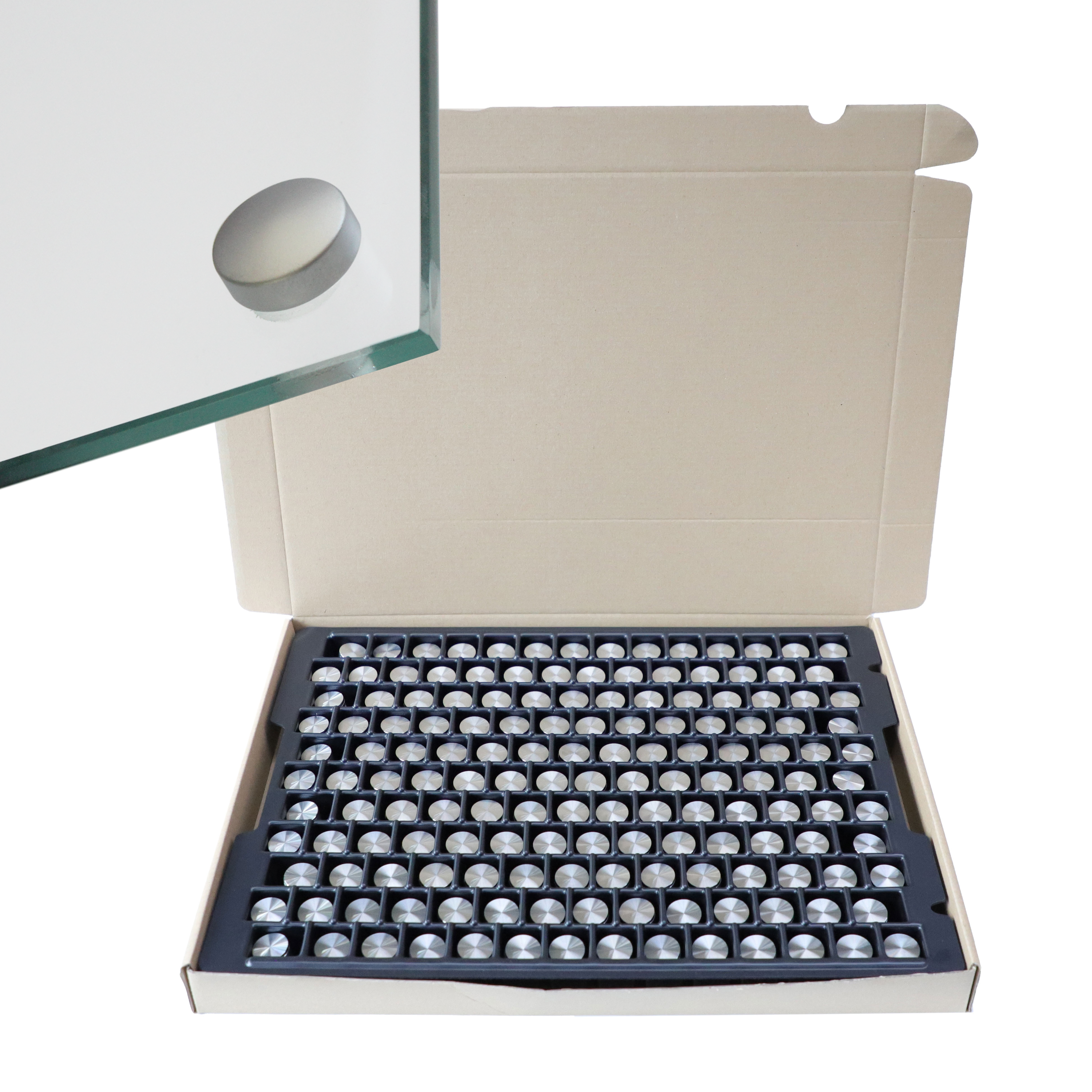 Für die Paneelmontage ohne Wandabstand: Messing-Fixierung mit Gummiring auf das Paneel legen, Paneel und Fixierung wandmontieren, Dekokappe aufklicken, fertig. Material: silbermatt veredeltes Aluminium.