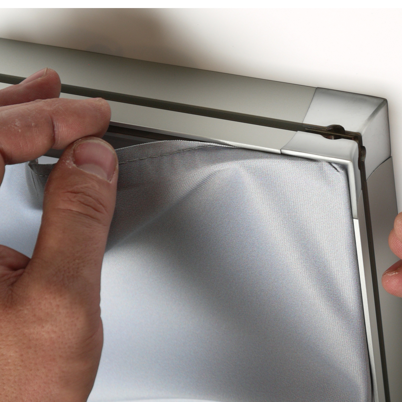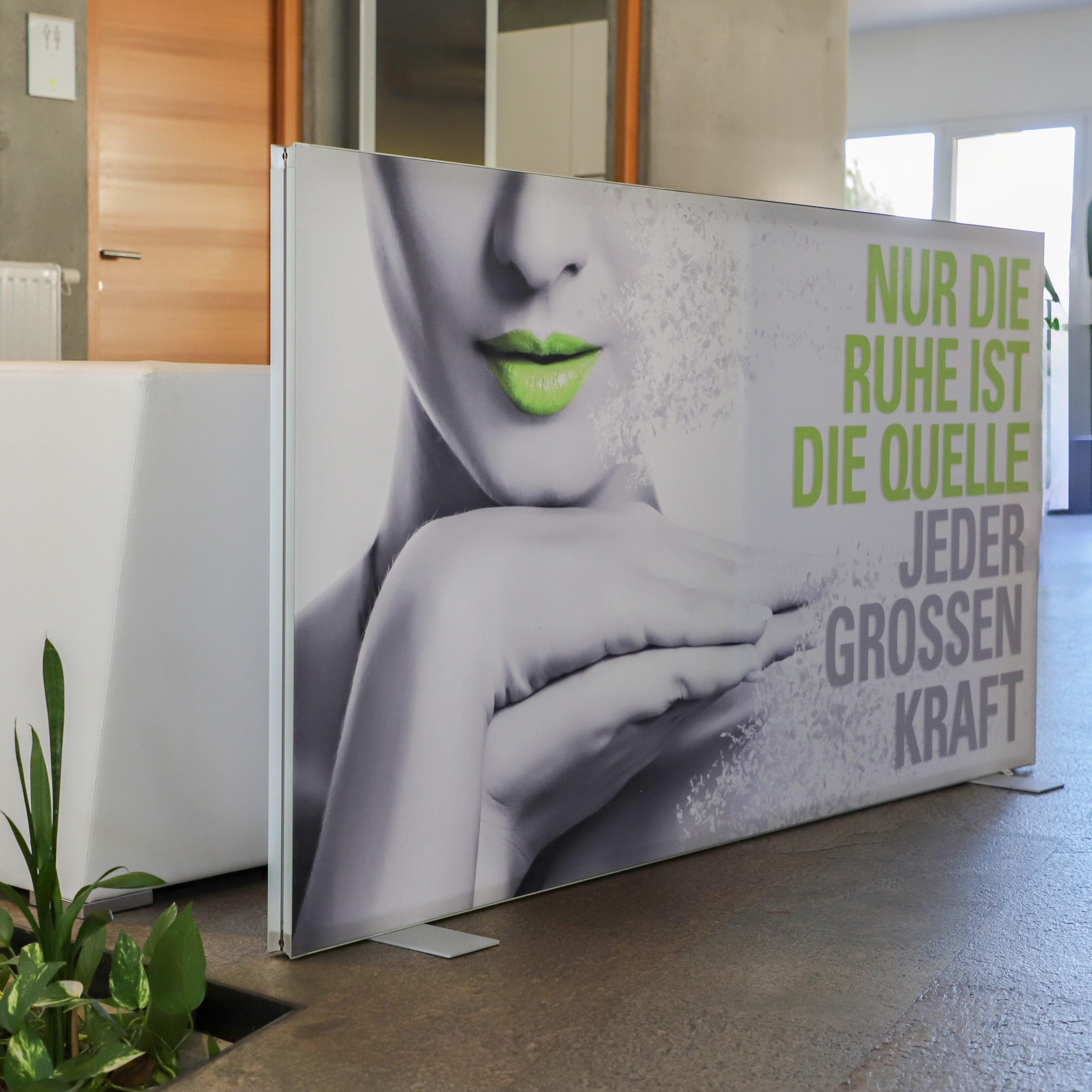 Unser doppelseitiges System für Textilkeder freistehend, wandmontiert oder abgehängt - die perfekte Lösung für individuelle Werbe- und Präsentationsflächen. Der modulare Rahmen wird auf Wunschmaß gefertigt. Das schlanke Design sorgt dafür, dass der Rahmen selbst im Hintergrund bleibt und nur ein schmaler Rand um den Druck sichtbar ist.