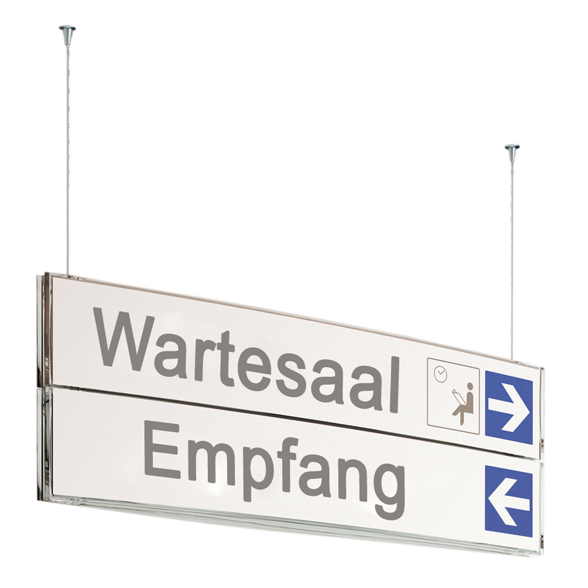 Ihre Wegleitsysteme mit dem Beschilderungssystem Pixquick werden durch die doppelseitigen, deckenabgehängten Pixquick Suspension Schilder perfekt ergänzt. Transparenter Polycarbonatspritzguss präsentiert die auf Papier gedruckte Info rahmenlos und staubgeschützt. Der Austausch der Info ist jederzeit ohne Werkzeug ganz einfach möglich. Die Deckenbefestigung ist für maximal fünf Deckenschilder ausgelegt.