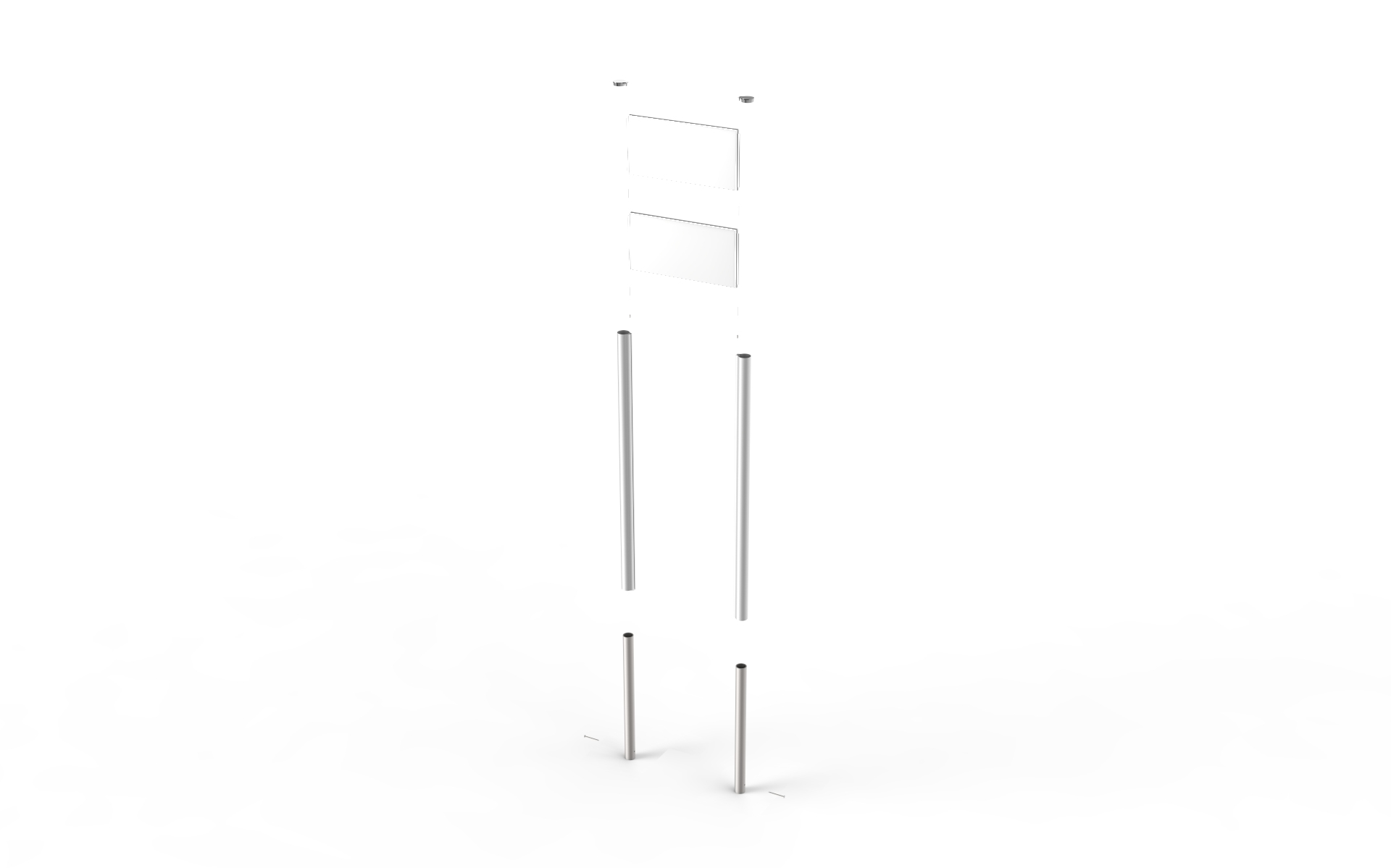 Das System besteht aus einem silber eloxierten Aluminium-Profilrahmen mit matt versilberten Metall-Druckgussecken sowie weiß beschichteten Aluminiumplatten. Die Tafeln sind vormontiert und verklebt, sodass sie sofort einsatzbereit sind. Wählen Sie zwischen einseitigen Lösungen für Außenbegrenzungen oder doppelseitigen Optionen für eine mittige Positionierung.