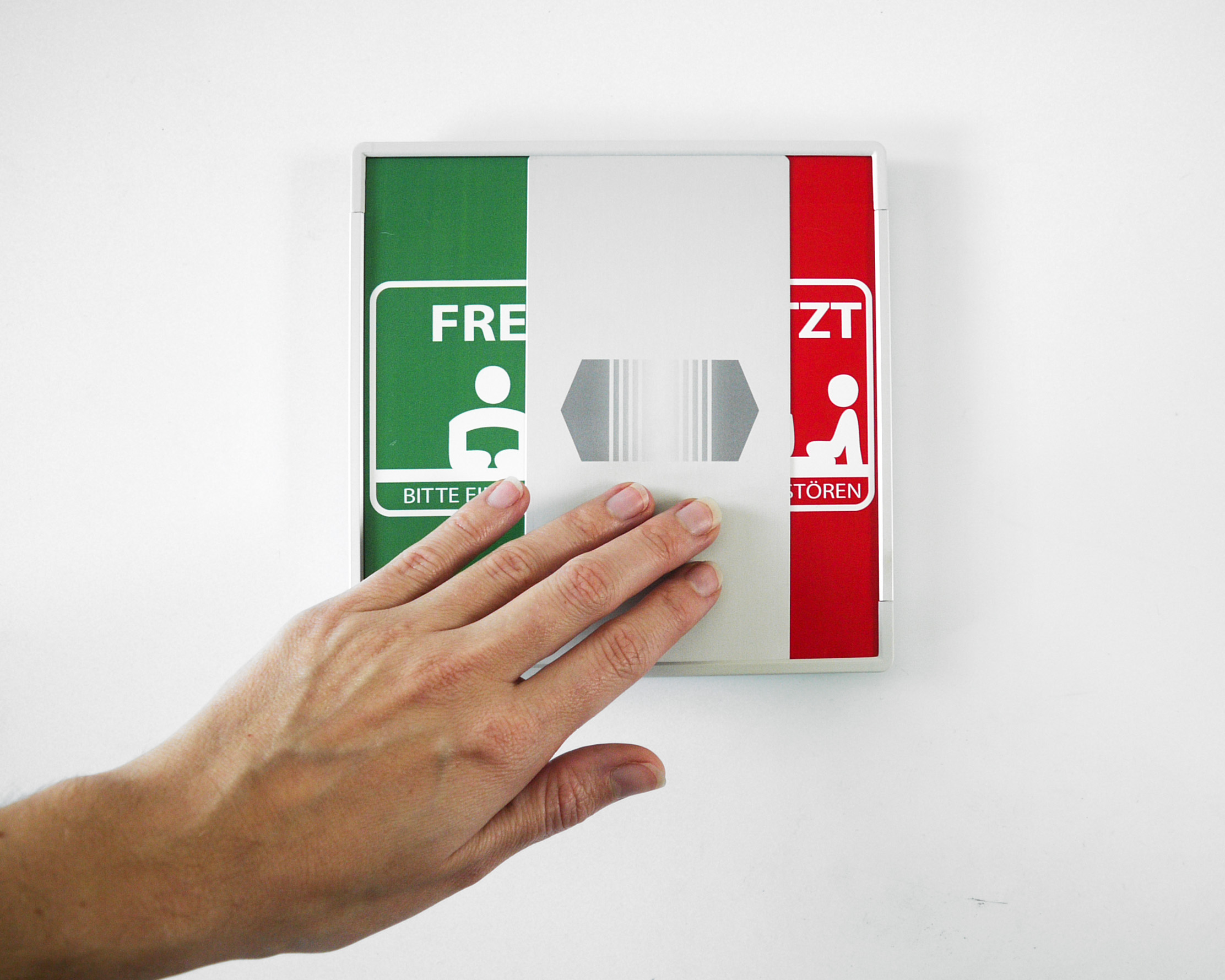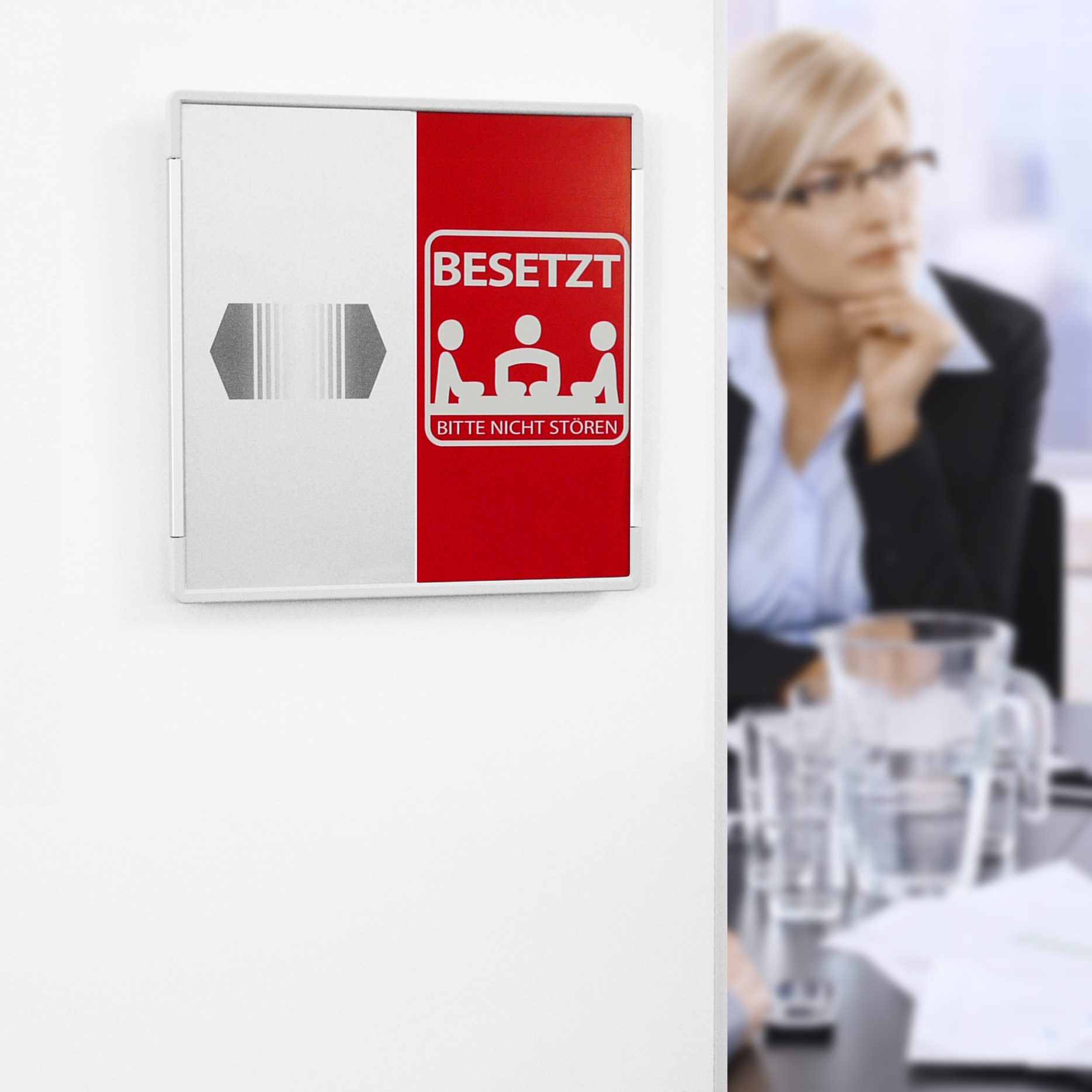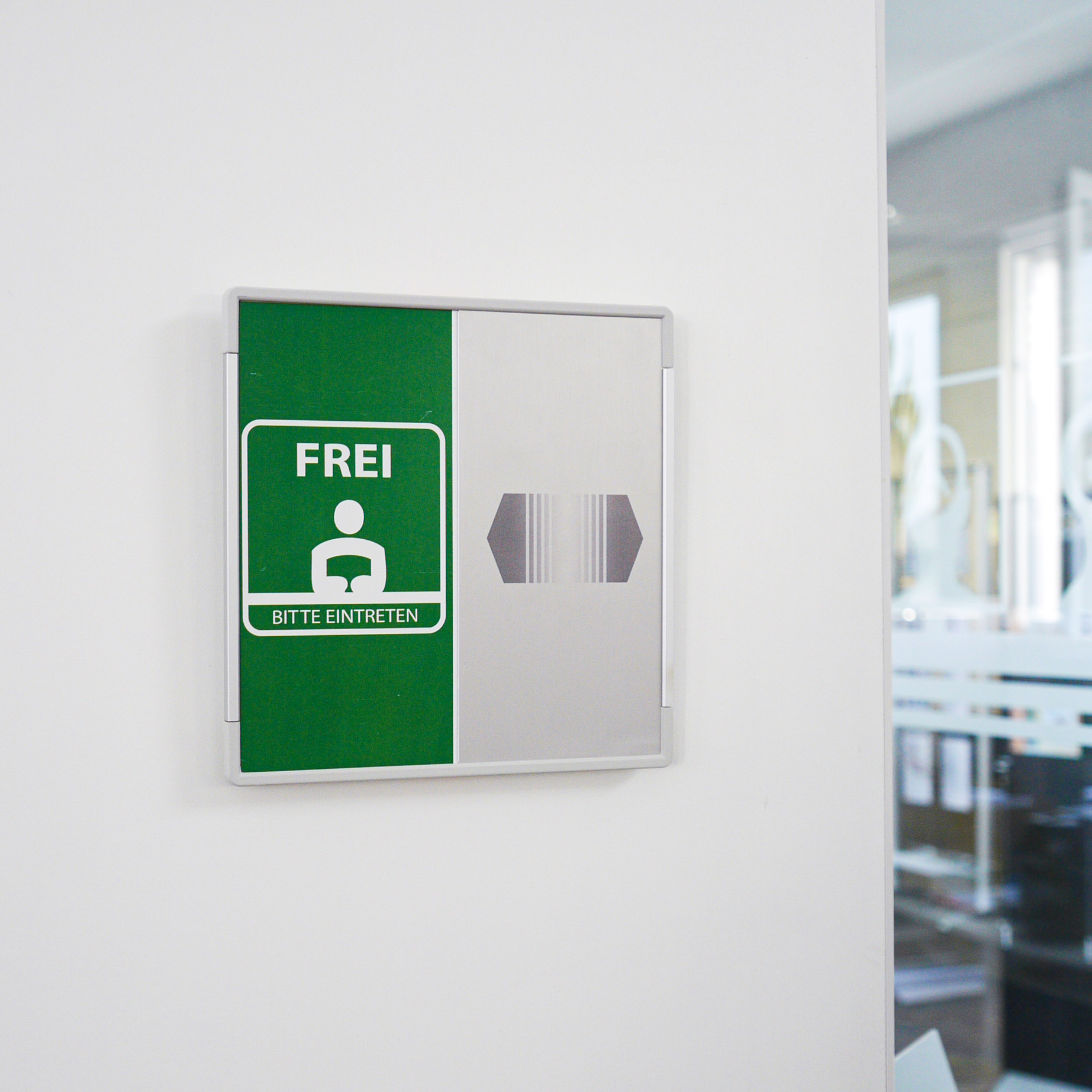Das hochwertige Signcode® In / Out Schild zeigt deutlich an, ob ein Raum frei oder besetzt ist.