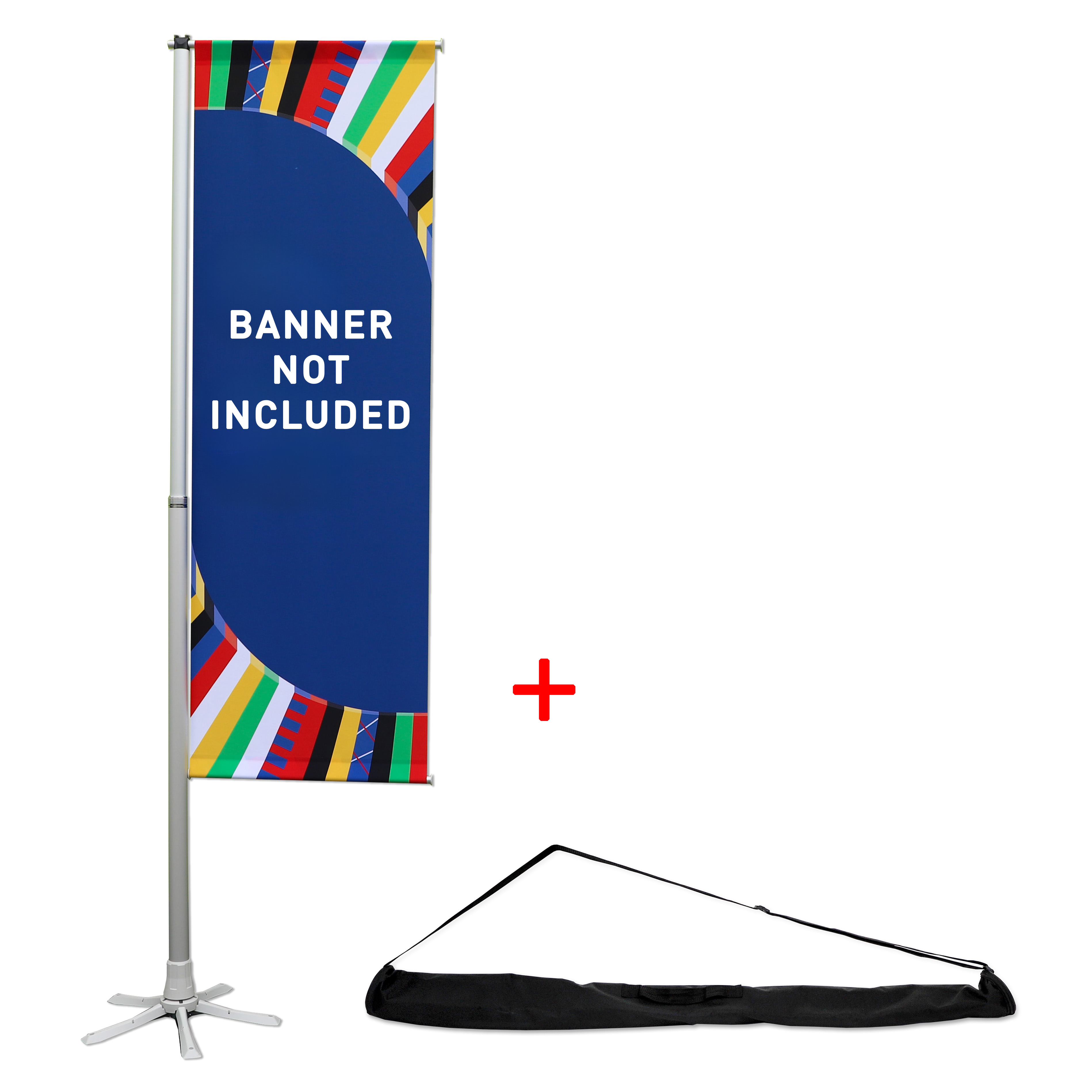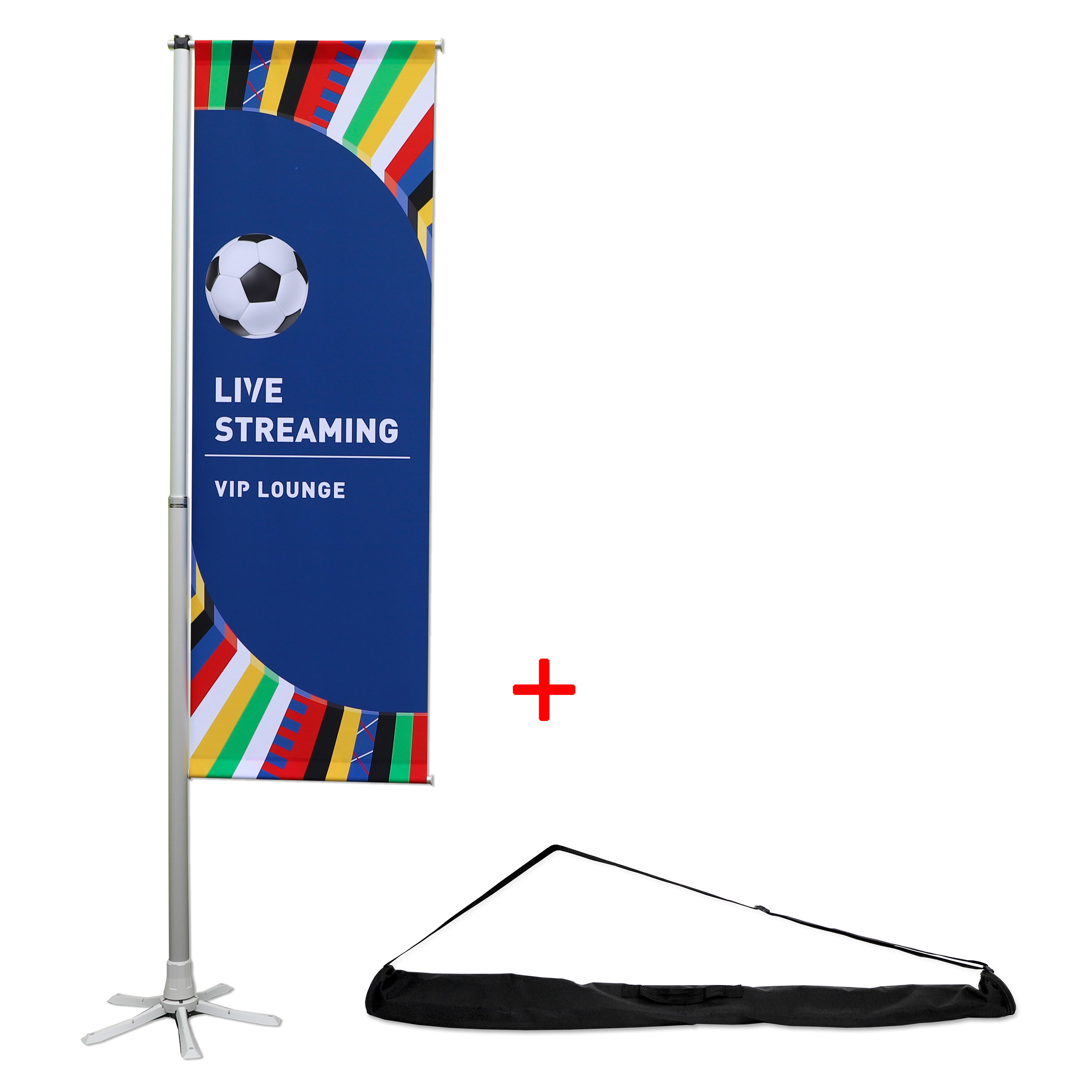 Die Fahne wird mit Saum befestigt, der obere Ausleger wird fest montiert und kann mit Rändelschrauben horizontal eingestellt werden.