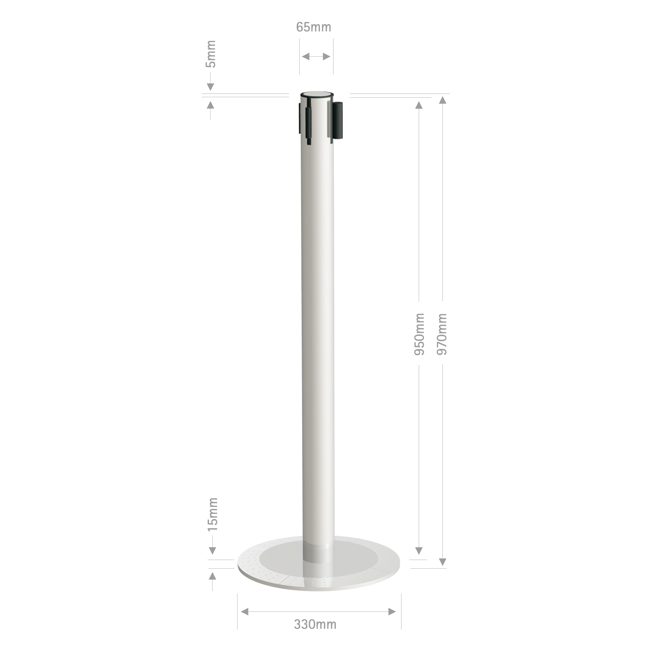 Begrenzungspfosten mit besonders stabilem Fuß bestehend aus gepulverten Stahlplatten mit Abdeckung und Dekorplatte. Das abgeflachte Design mit einer der niedrigsten Kanten garantiert barrierefreie Bewegung für Kinderwagen, Rollstuhl und Rollkoffer. Ringförmig aufgesetzte Noppen am Fuß geben Halt bei versehentlichem Auftreten. Mit den unten aufgeklebten Anti-Rutsch-Pads bleibt der Absperrständer an seinem Platz.