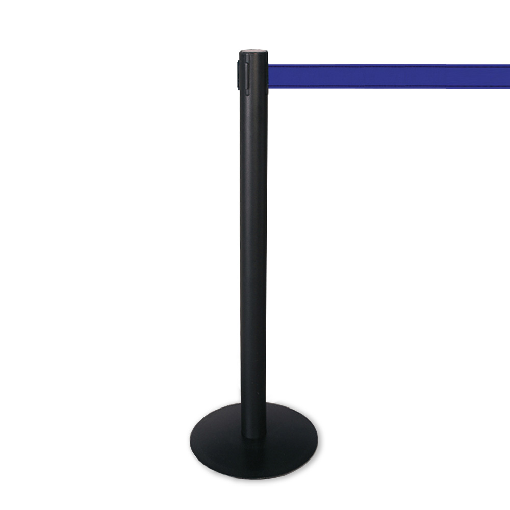 Absperrständer in matt schwarz mit Gurt in verschiedenen Farben - oder ohne Gurt als Gegenstück zum Einhängen des Gurtbands eines zweiten Pfosten.