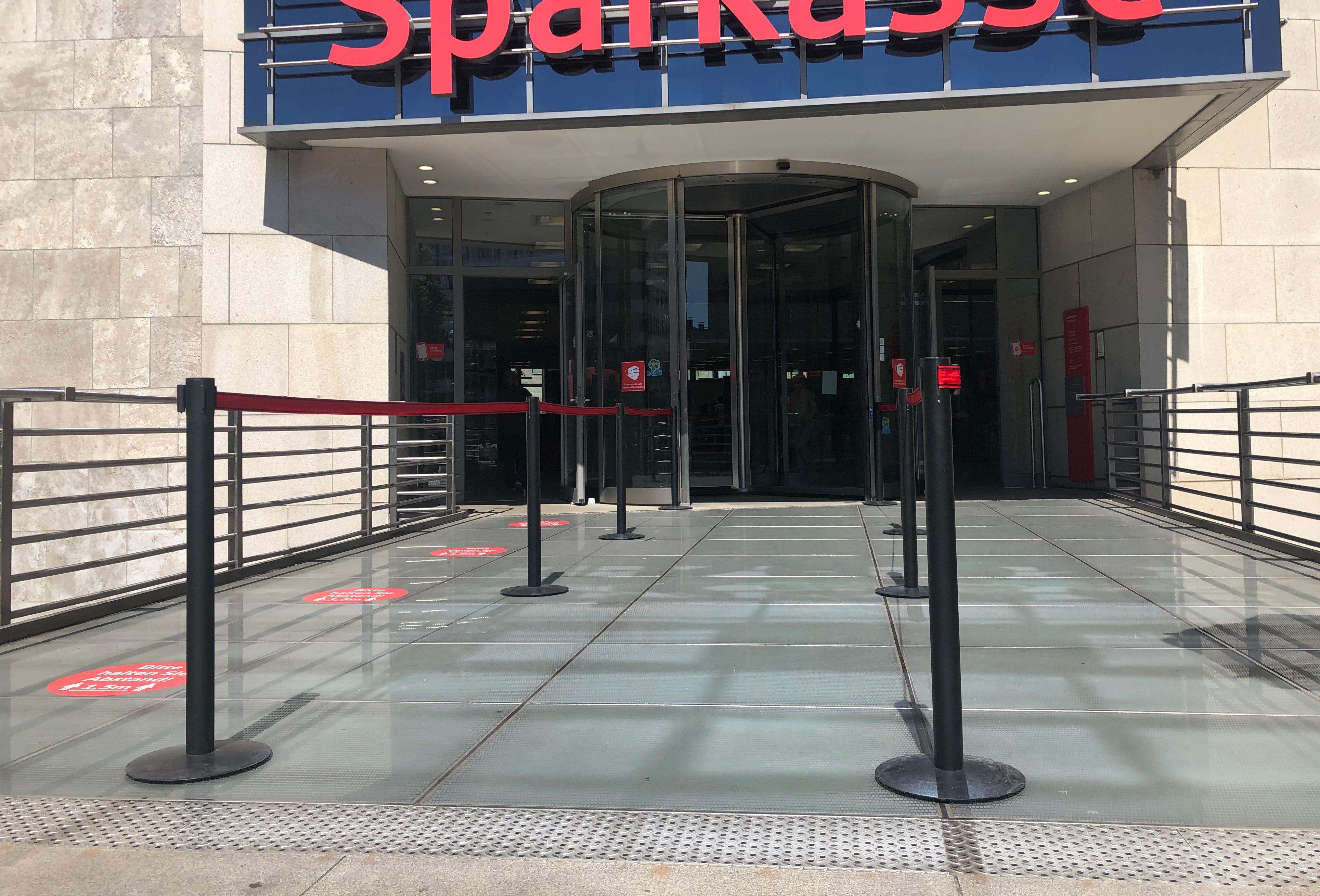 Sicheres Personenleit-System: Die Fliehkraftbremse sorgt für kontrollierten Gurteinzug ohne Verletzungsgefahr und erfüllt so den aktuell höchsten Stand der Sicherheits-Technik. Der Standfuss ist abgeflacht mit einer der niedrigsten Kanten und garantiert Zugänglichkeit auch für Rollkoffer, Kinderwagen und Rollstuhl.
