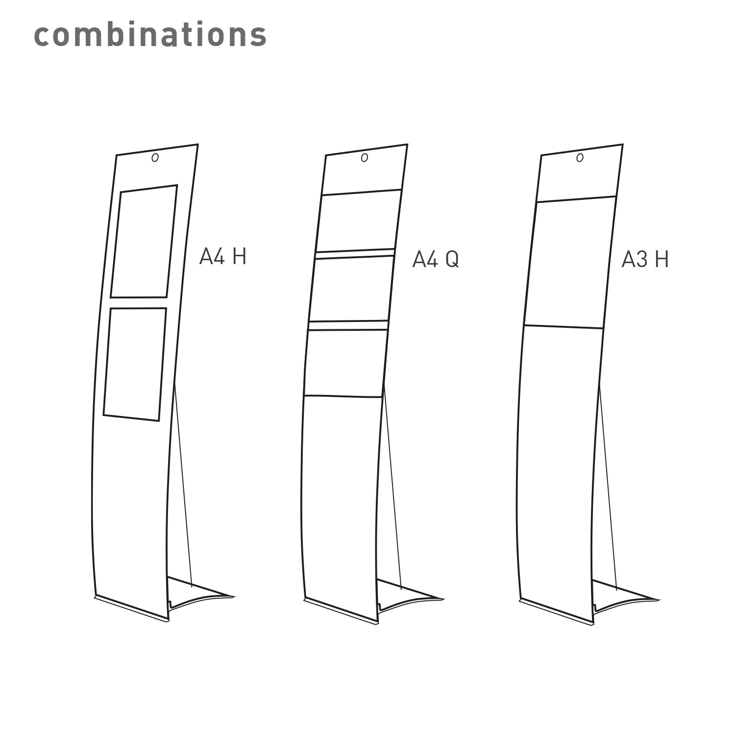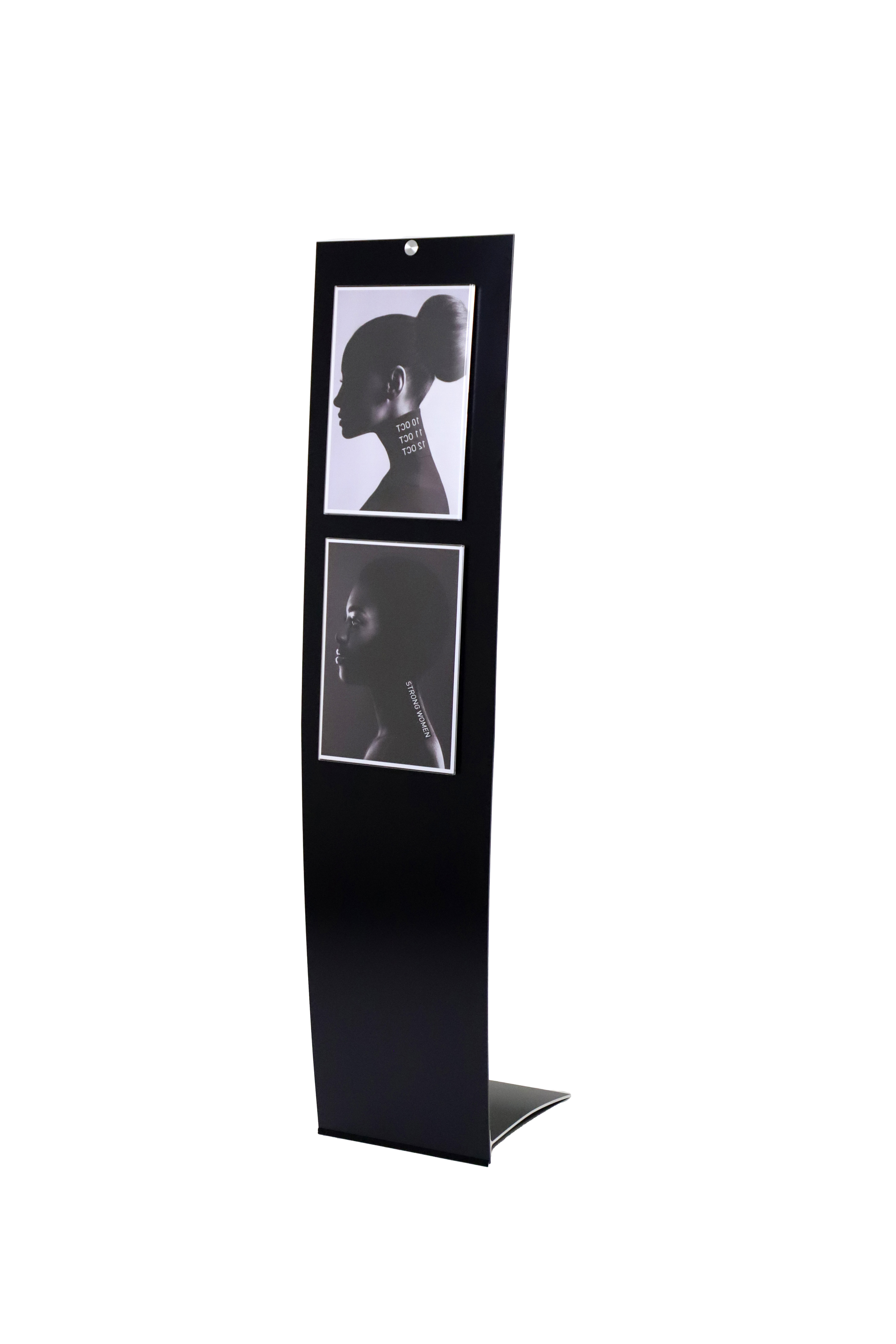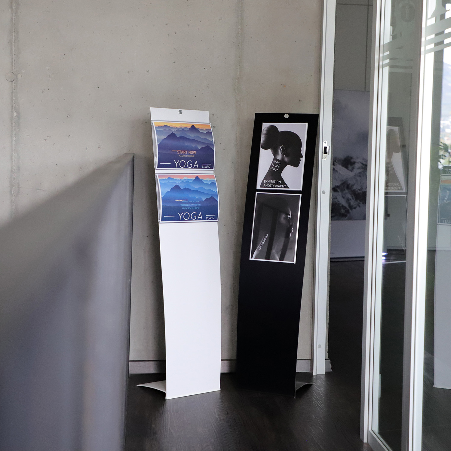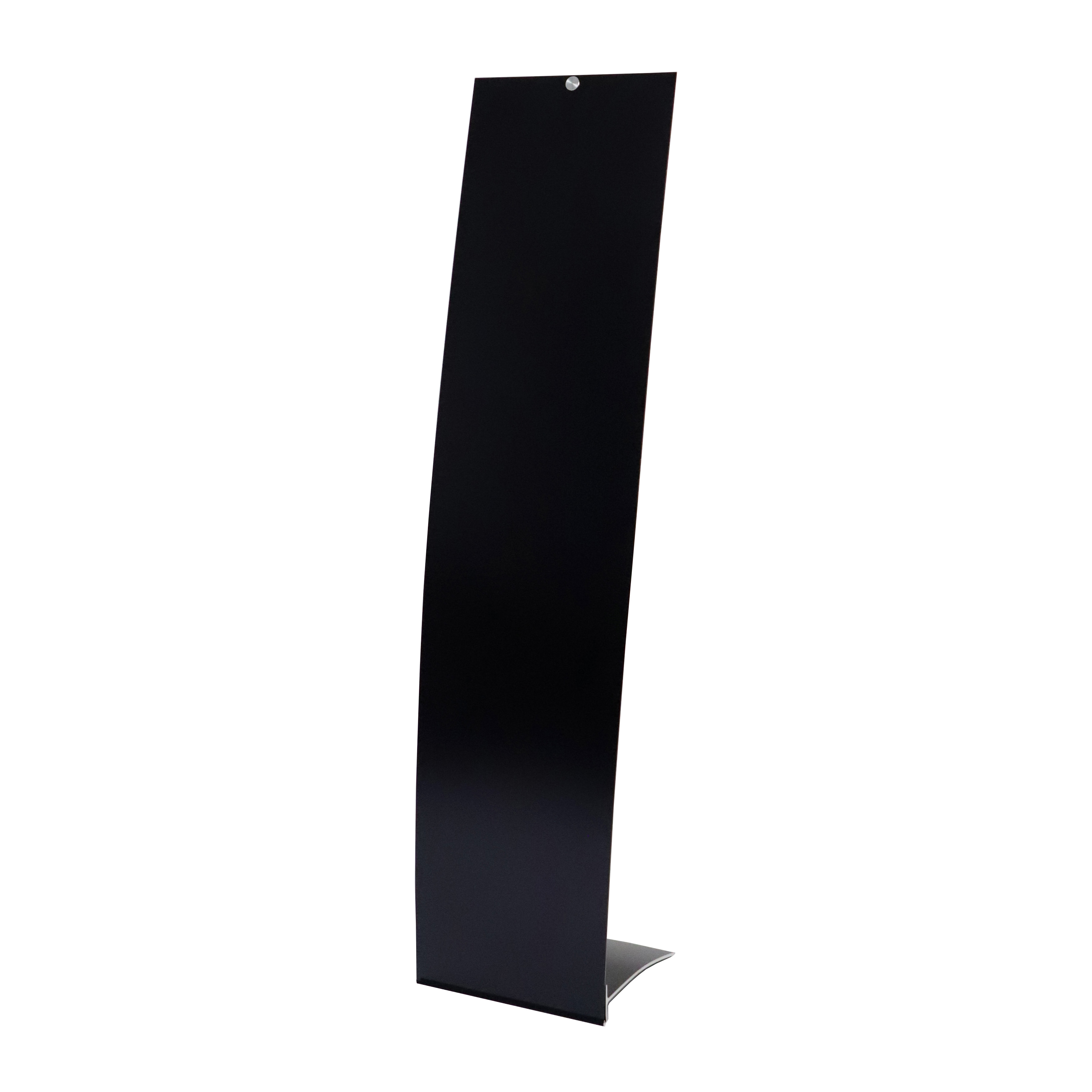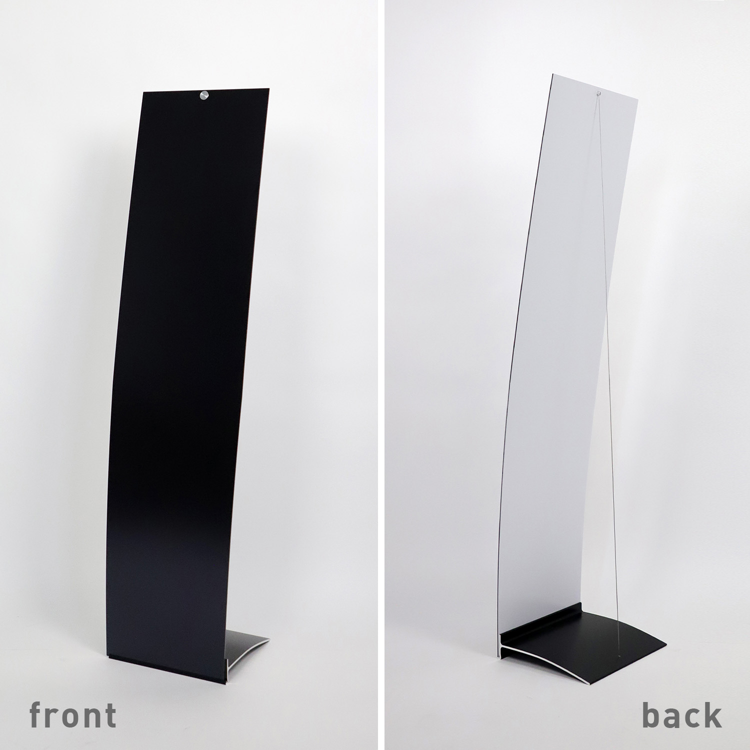 Freistehendes Bodendisplay Velo Easy. In schwarz oder weiß erhältlich. Pulverlackbeschichteter Fuß in Aluminium, Aluminium-Verbundpaneel mit Spannseil in Edelstahl.