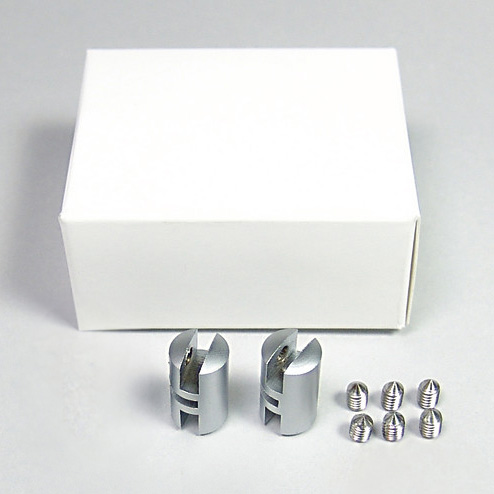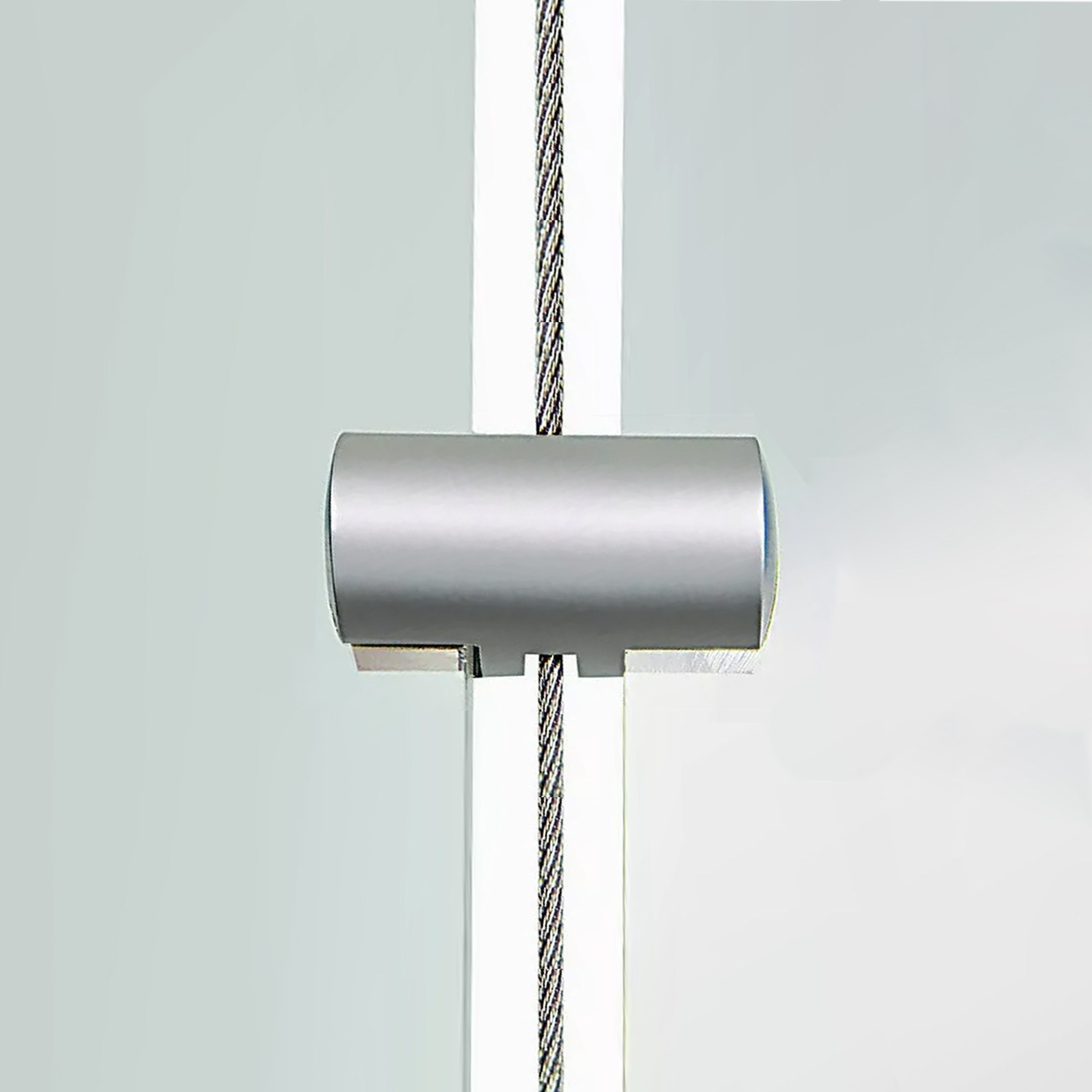 Paneelhalter für Seil, beidseitig. Seitlicher Halter für zwei Paneele am Stahlseil. Befestigung von Paneel und Seil mit Madenschrauben.
