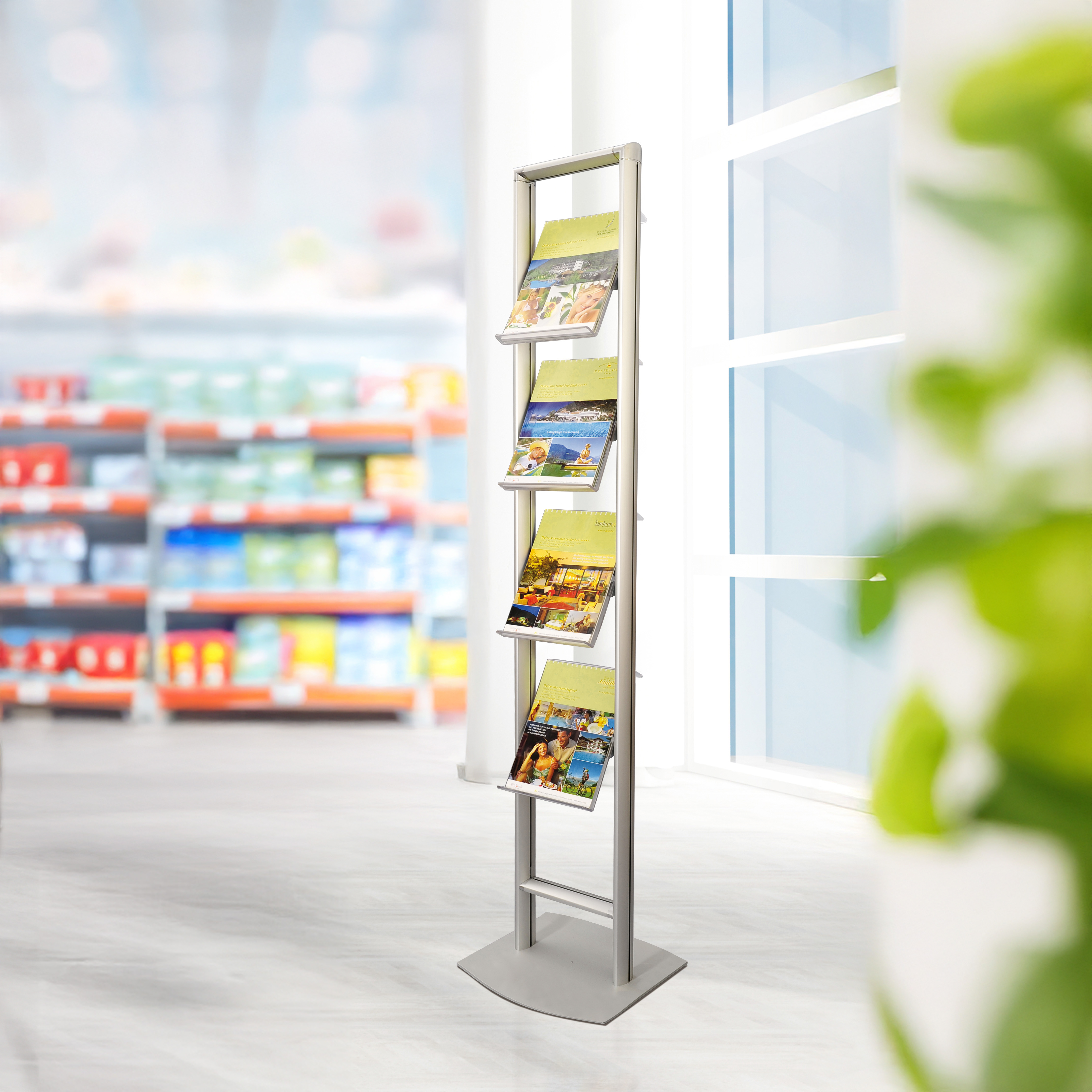 Compact das stabile Bodendisplay aus der Soistes Serie bietet Ihnen drei bzw. vier A4 Ablagen für Ihre Katalogpräsentation. Alle Ablagen sind vierfach neigbar und können in der Höhe stufenlos verstellt werden.