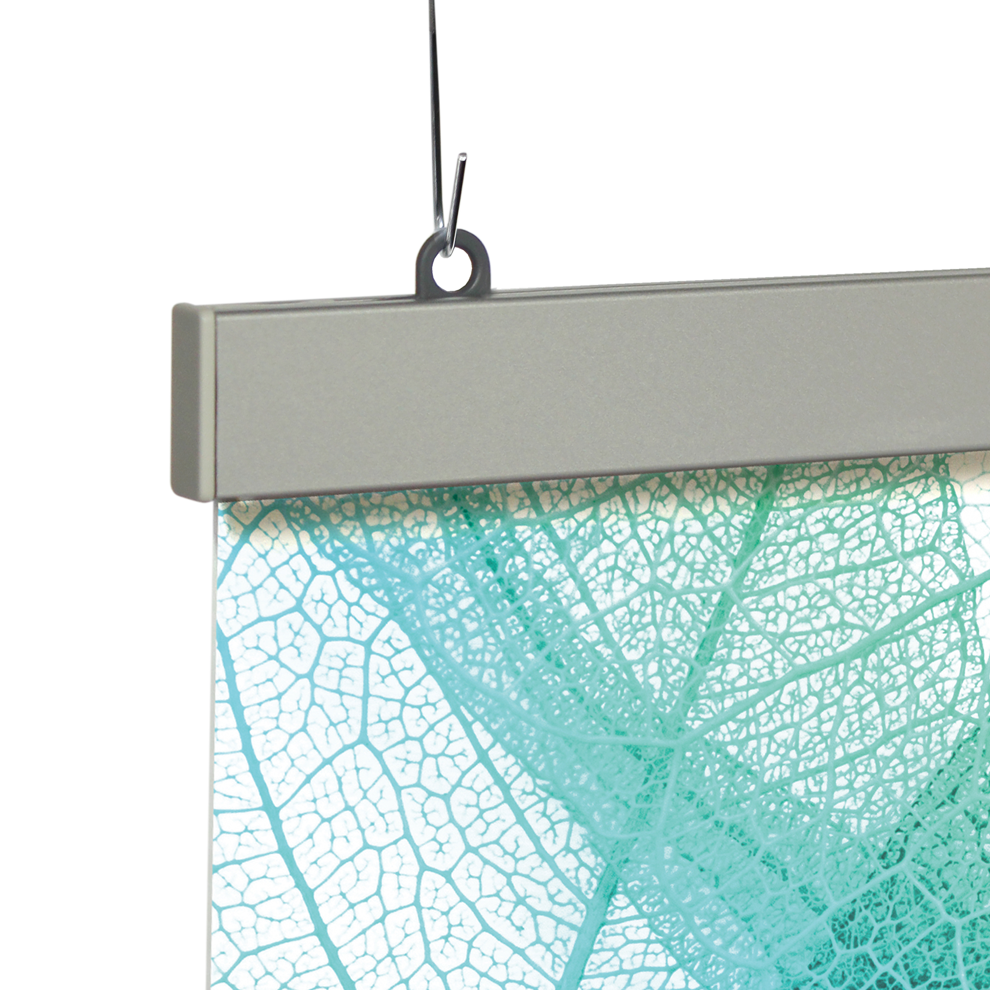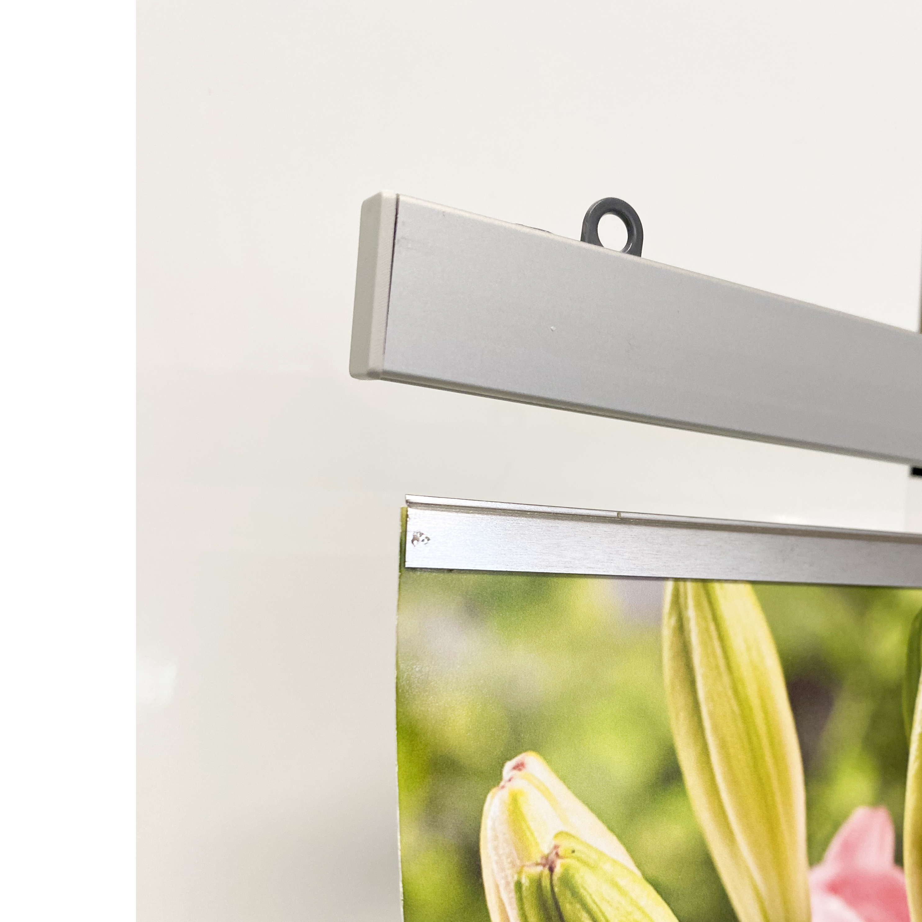 Das Klemmprofil für die deckenabgehängte Präsentation von schweren, großen Drucken. Silber eloxierte Aluminium Profile klemmen Drucke von 0,2 bis 0,7mm auf ganzer Länge sicher ein.Kunststoffösen für die Aufhängung sind im Lieferumfang dabei und werden an gewünschter Positione einfach eingeklipst. Das Klemmprofil Bannerblock für Drucke zur Abhängung gibt es in gängigen Längen als Doppel-Set inklusive Ösen und praktischem Profil-Öffner. Als Hersteller produzieren wir Deine Wunschlänge gerne auf Anfrage ab Stückzahl 1 in wenigen Tagen.