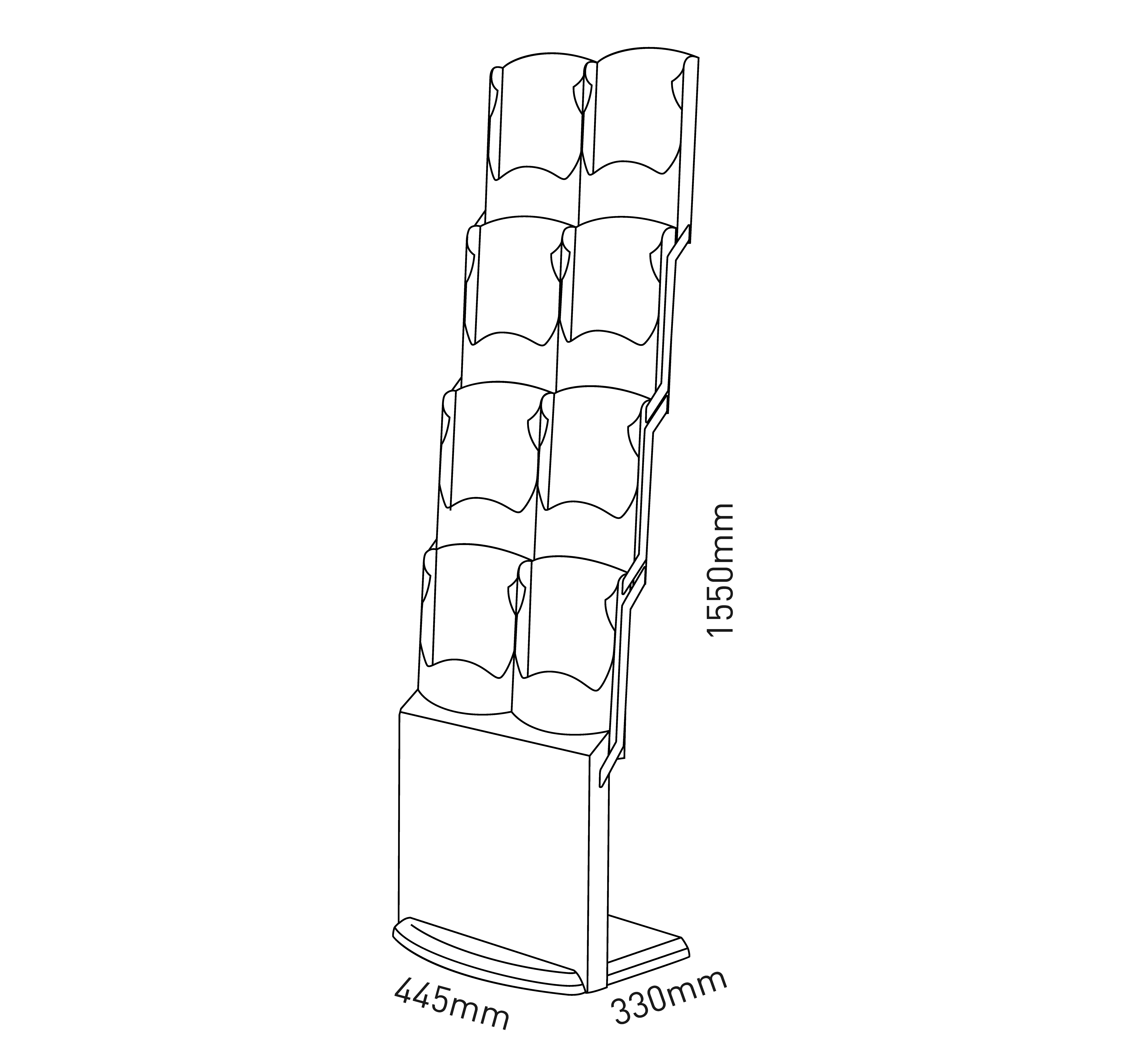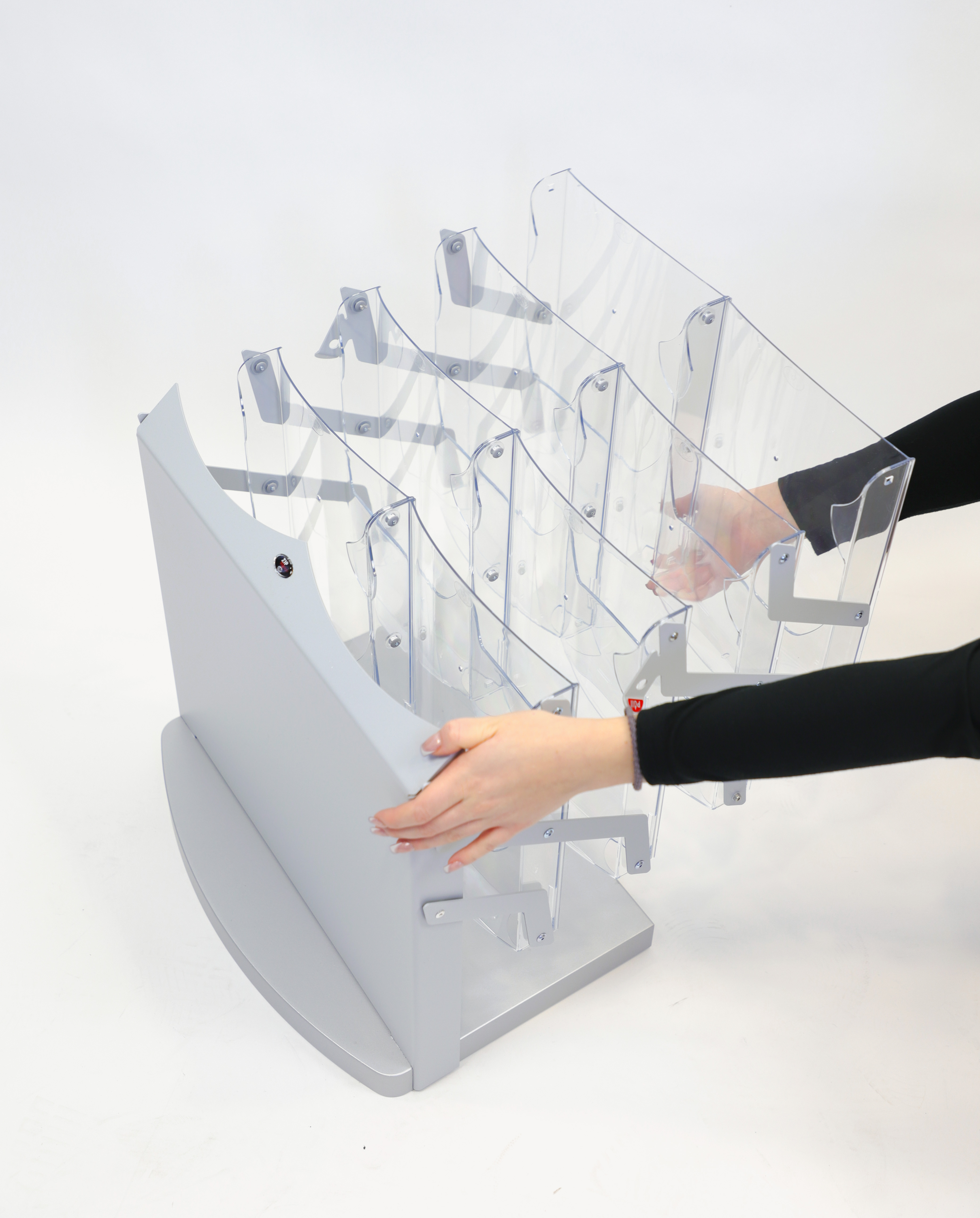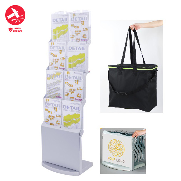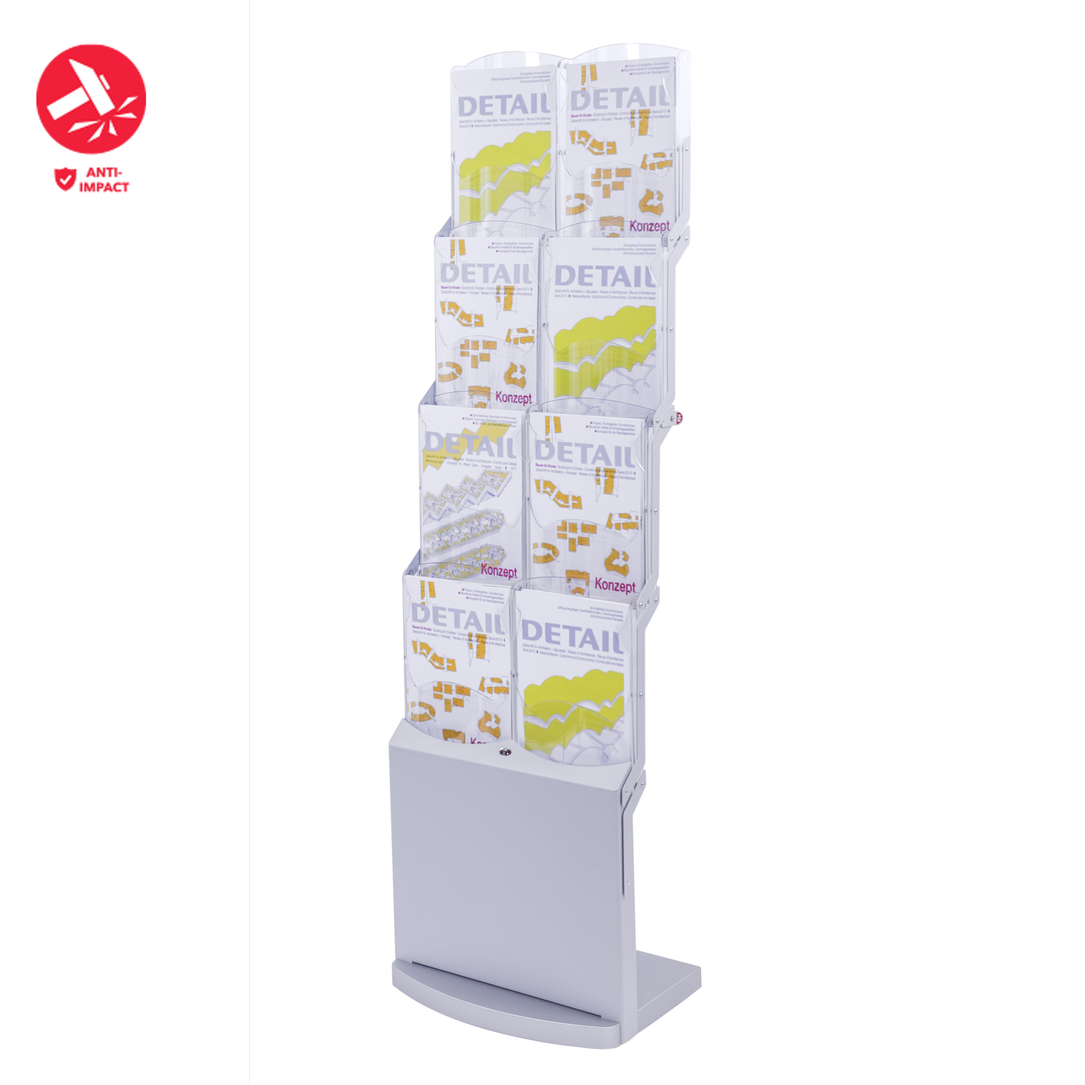 Klappbarer Prospektständer in silbermatt, acht schlag- und kratzfeste Polycarbonat-Taschen für A4 Format, Metallstreben pulverlackbeschichtet, stabiler Fuß aus lackiertem MDF.
