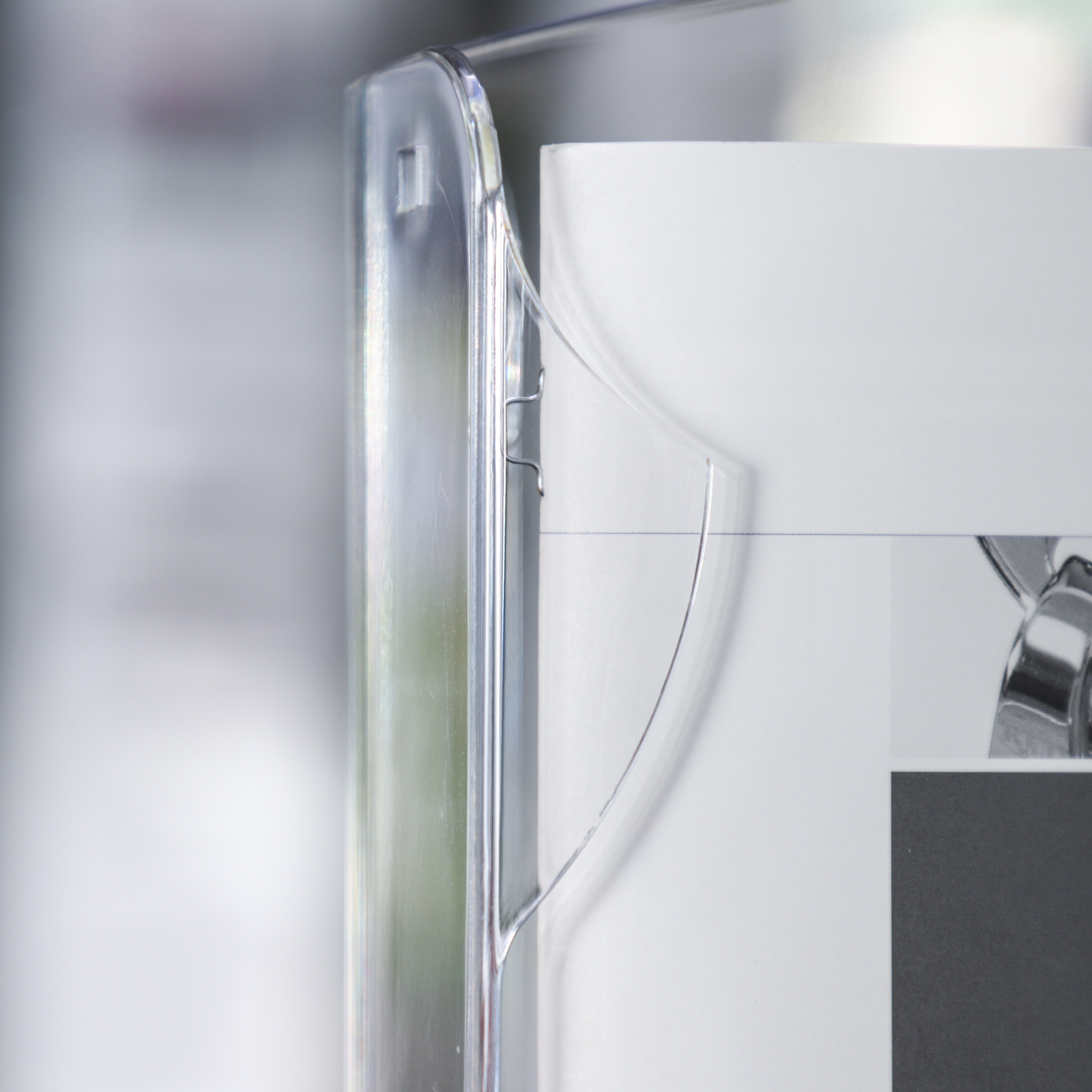 Nur bei uns: Einzelblatt-Kippschutz für perfekte Präsentation auch dünner Flyer.