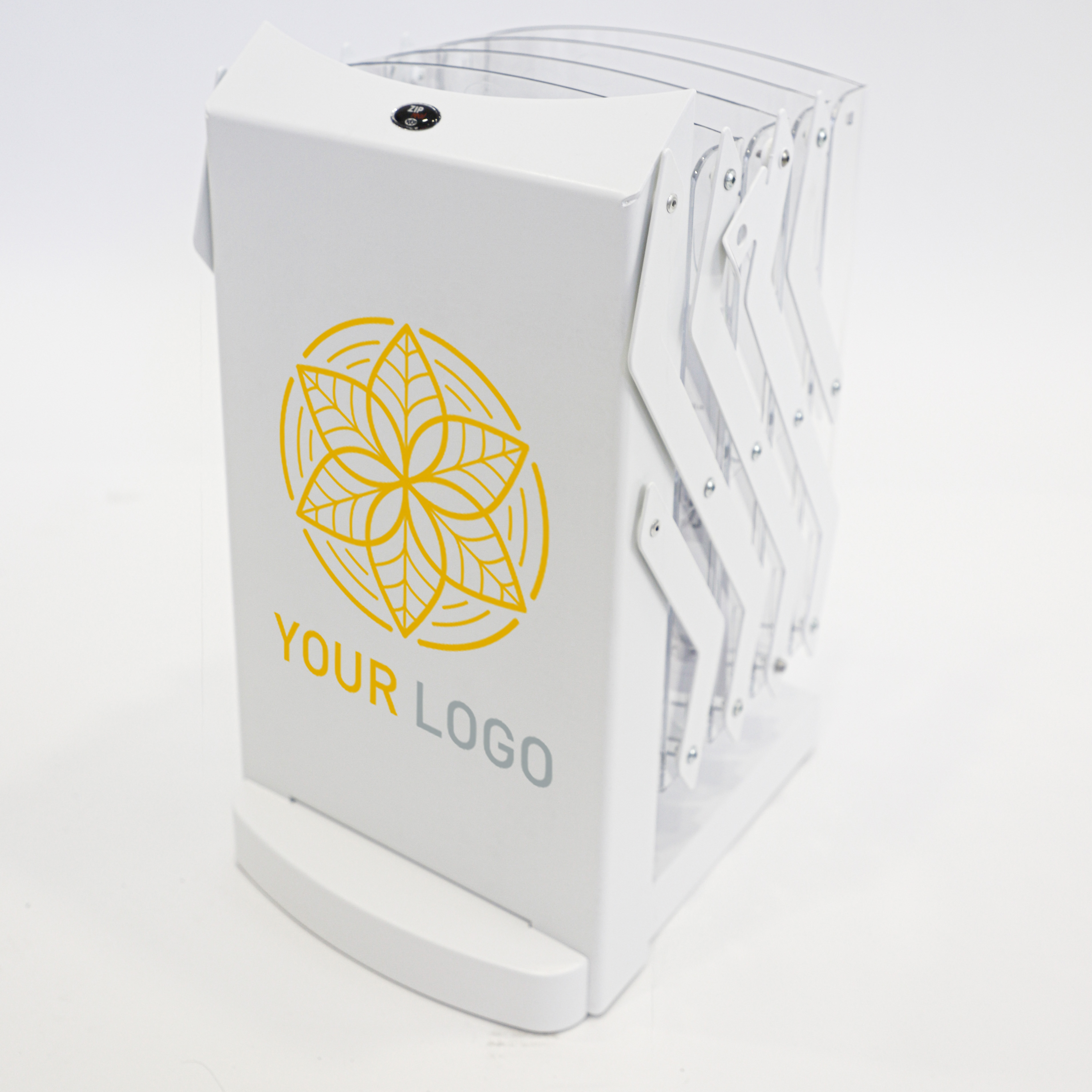 faltbarer Prospektständer in weiß, vier schlag- und kratzfeste Polycarbonat-Taschen für A4 Format, Metallstreben pulverlackbeschichtet, stabiler Fuß aus lackiertem MDF.