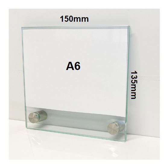 Glasschild für Raumbeschilderung: 2 temperierte Sicherheitsgläser mit gefasten Ecken mit V2A Edelstahl-Abstandhalter.