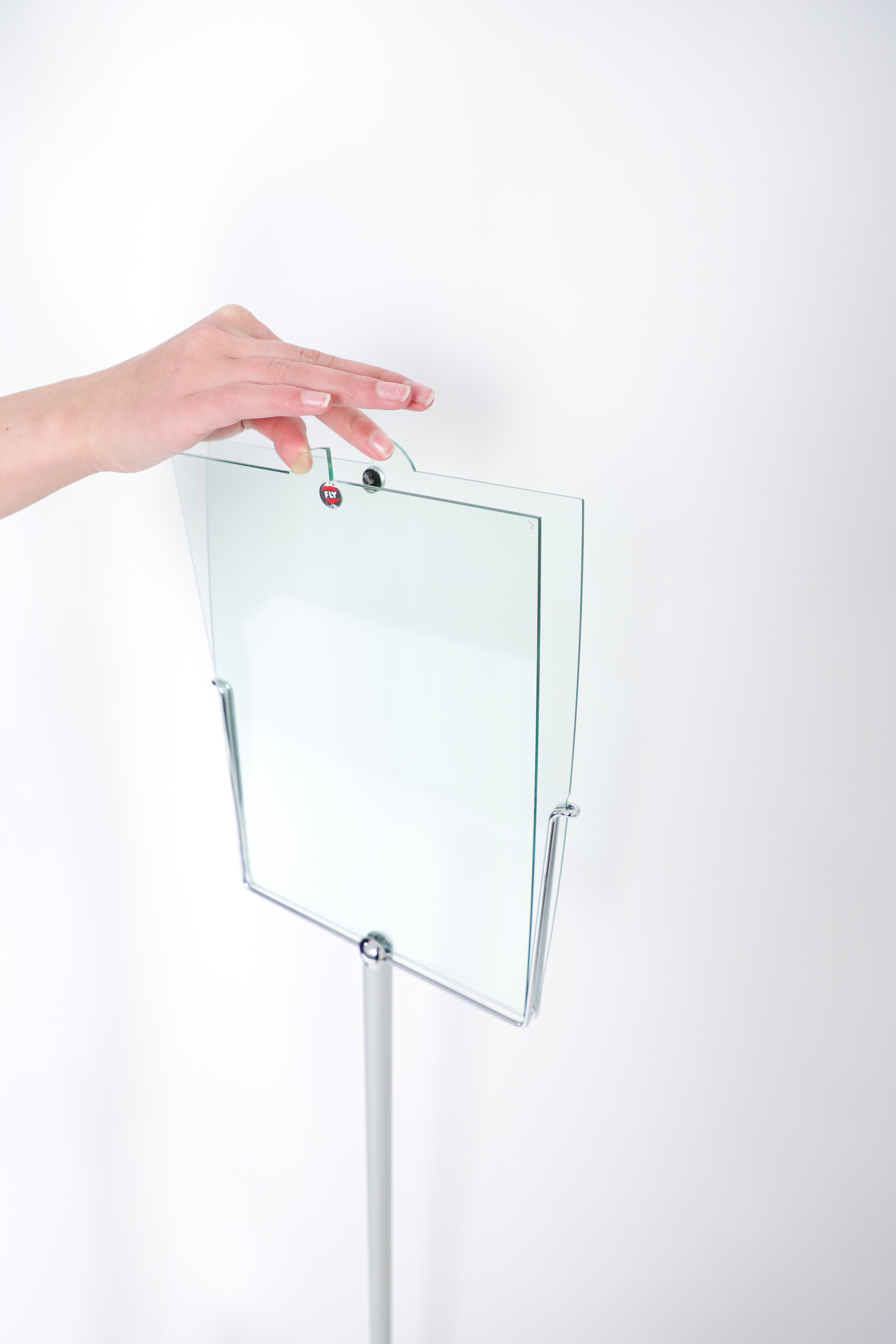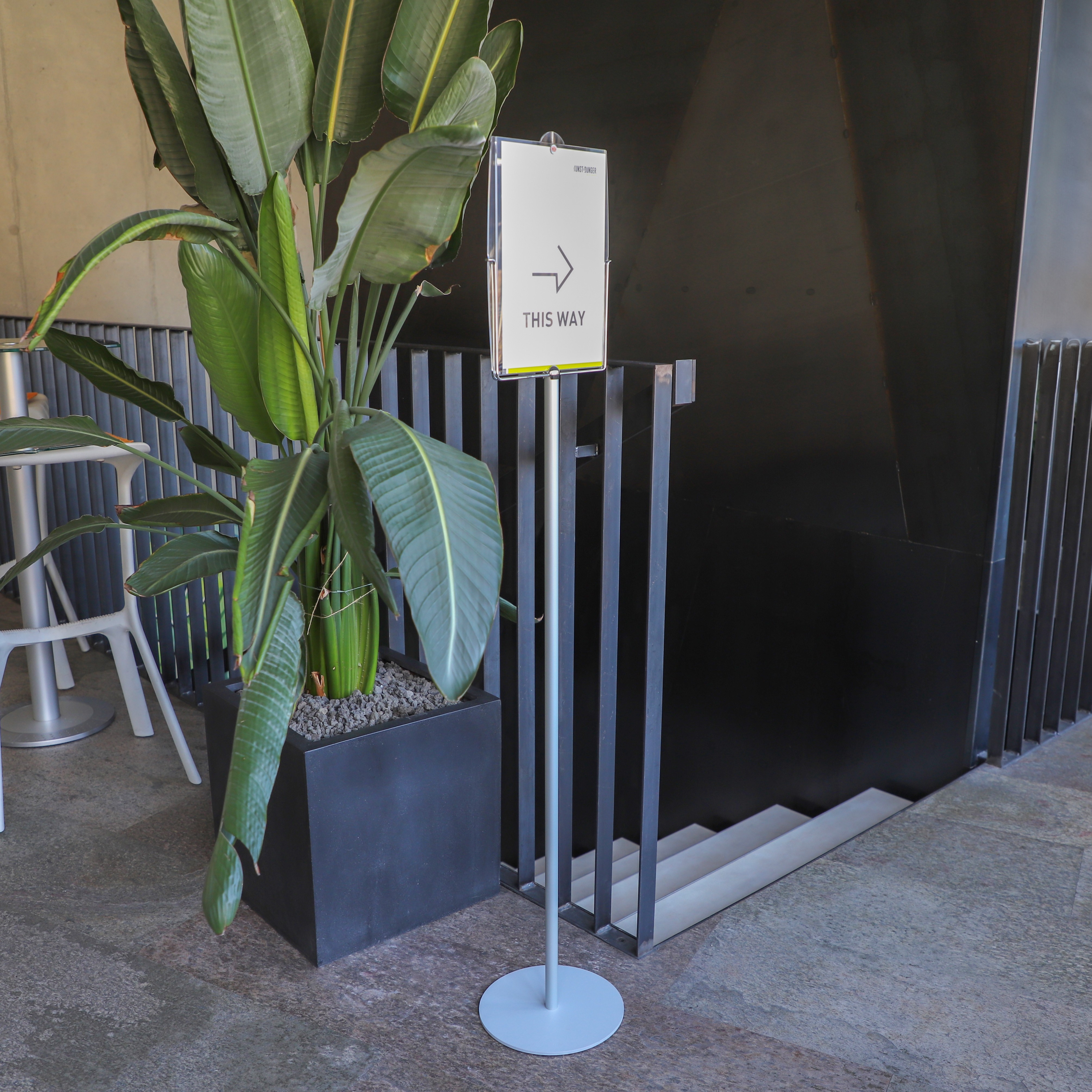 Praktisches freistehendes Bodendisplay mit doppelseitiger Infotasche aus hochwertigem, glasgrünem Acrylglas. Basis anschrauben und mit passender Info bestücken. Schon ist Flippy im Einsatz als Ihr Wegweiser oder Infopräsenter.