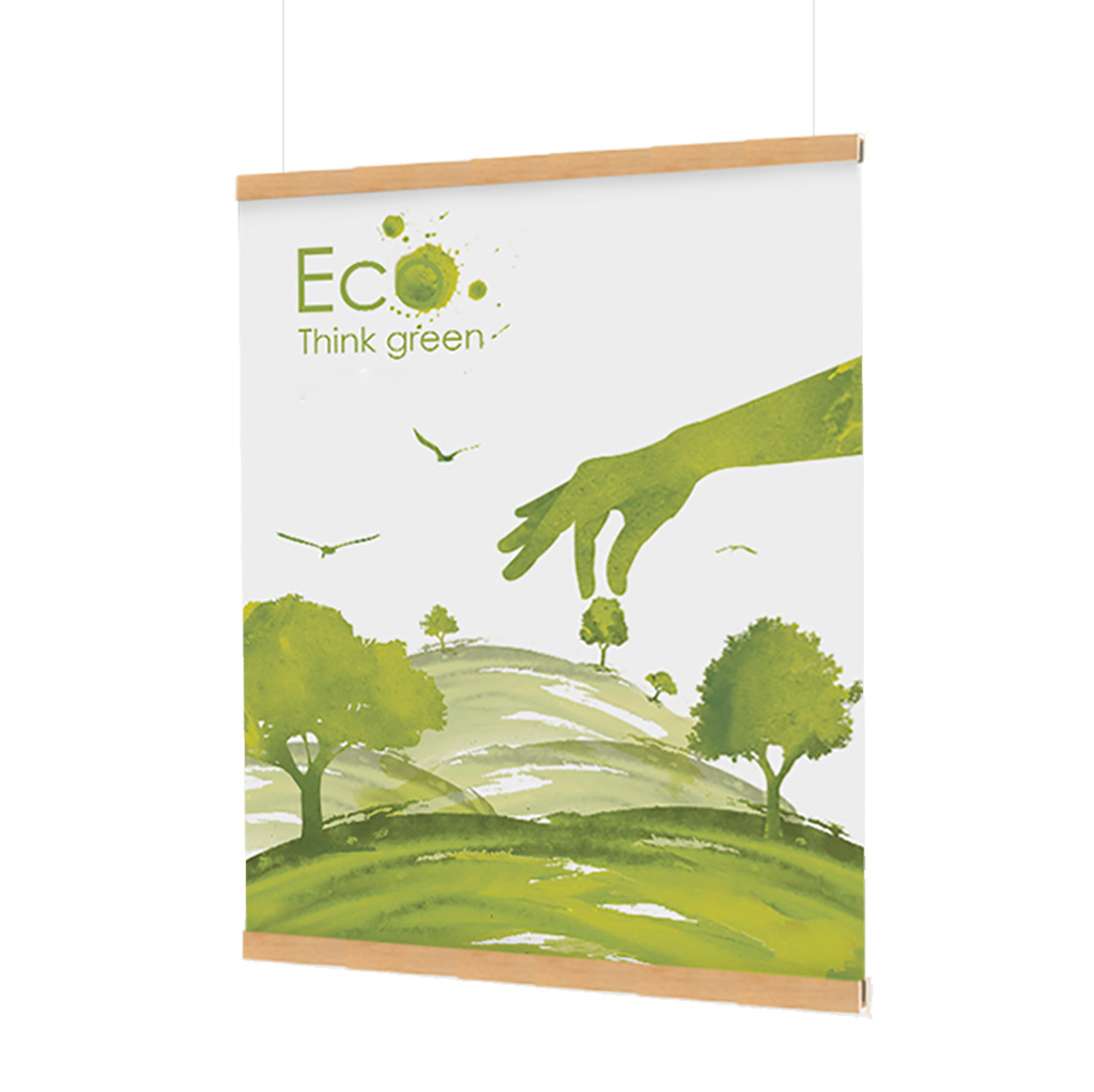 Im Lieferumfang enthalten ist eine Holzleiste mit integrierten Magneten. Du kannst das Holzprofil zur Abhängung von Postern bei gut fallenden Materialien nur oben anbringen.