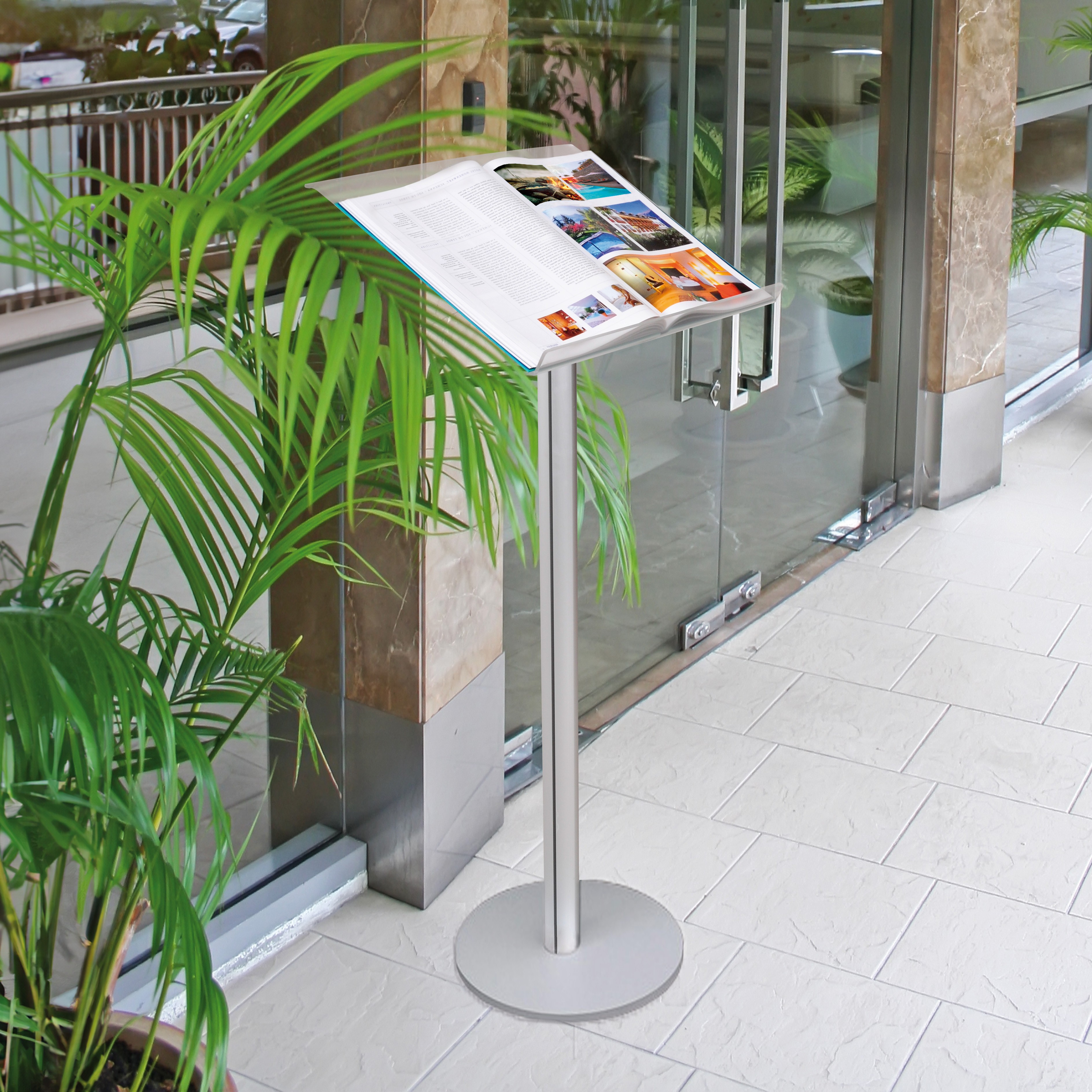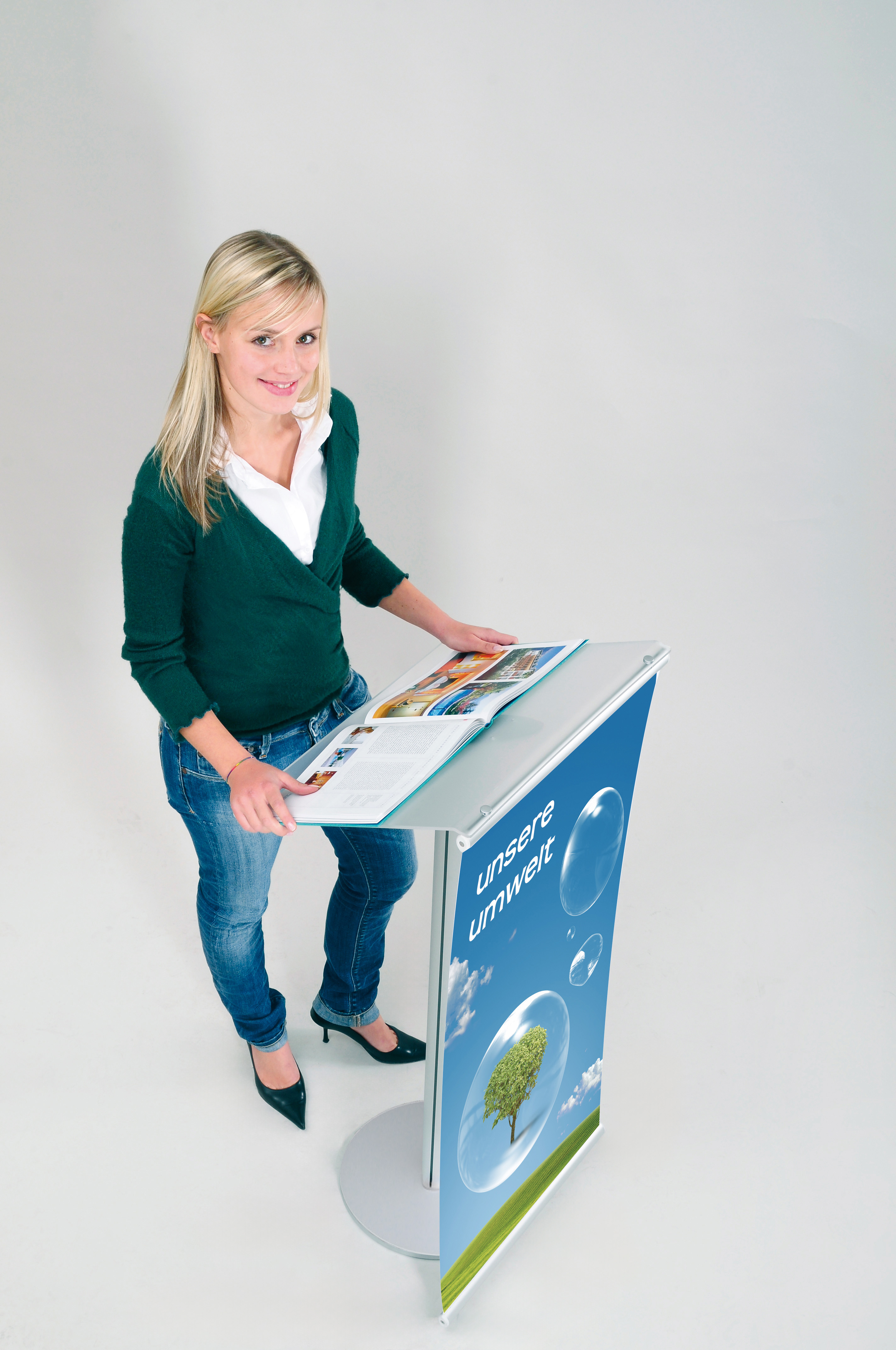 Der freistehende Bodenständer bietet mit seiner satinierten Acrylablage Platz für Menükarten, Kataloge, Gästebücher, Verzeichnisse und kann gleichzeitig als Pultständer genutzt werden. Zusätzlich kann die Vorderseite mit Druck personalisiert werden. Einfach den Bodenständer mit unserem Klemmprofil Bannerblock 500mm art. BBC500 erweitern.