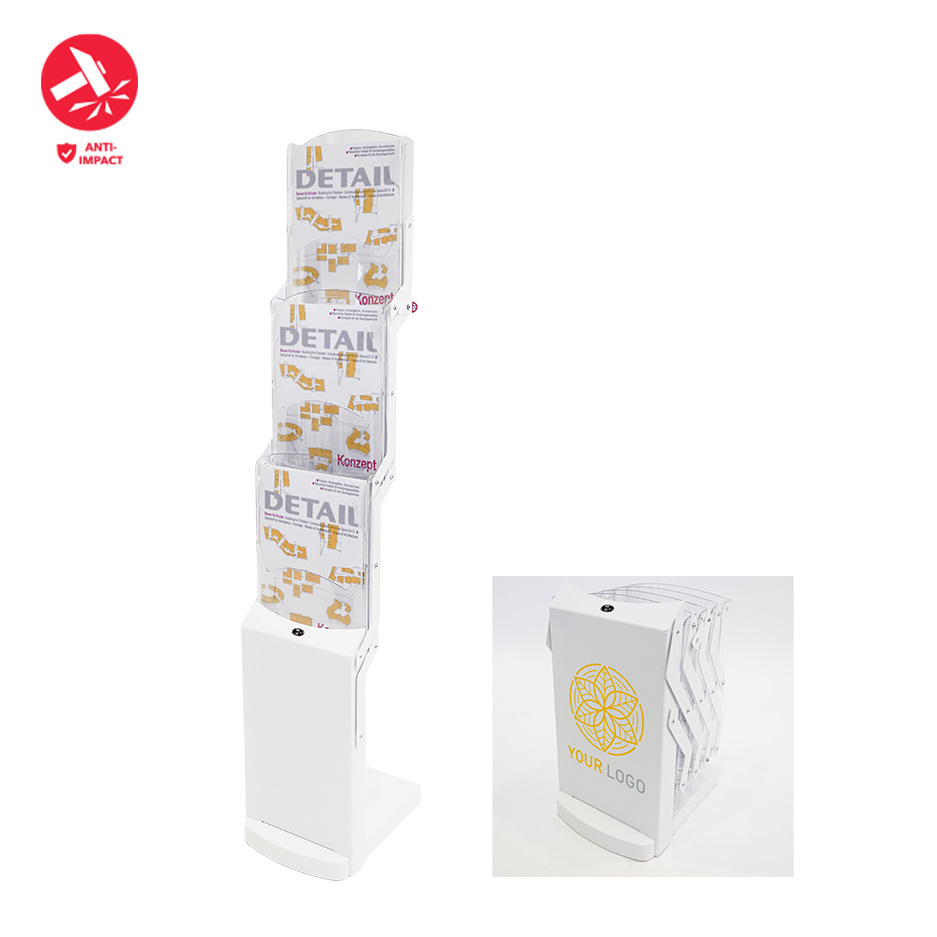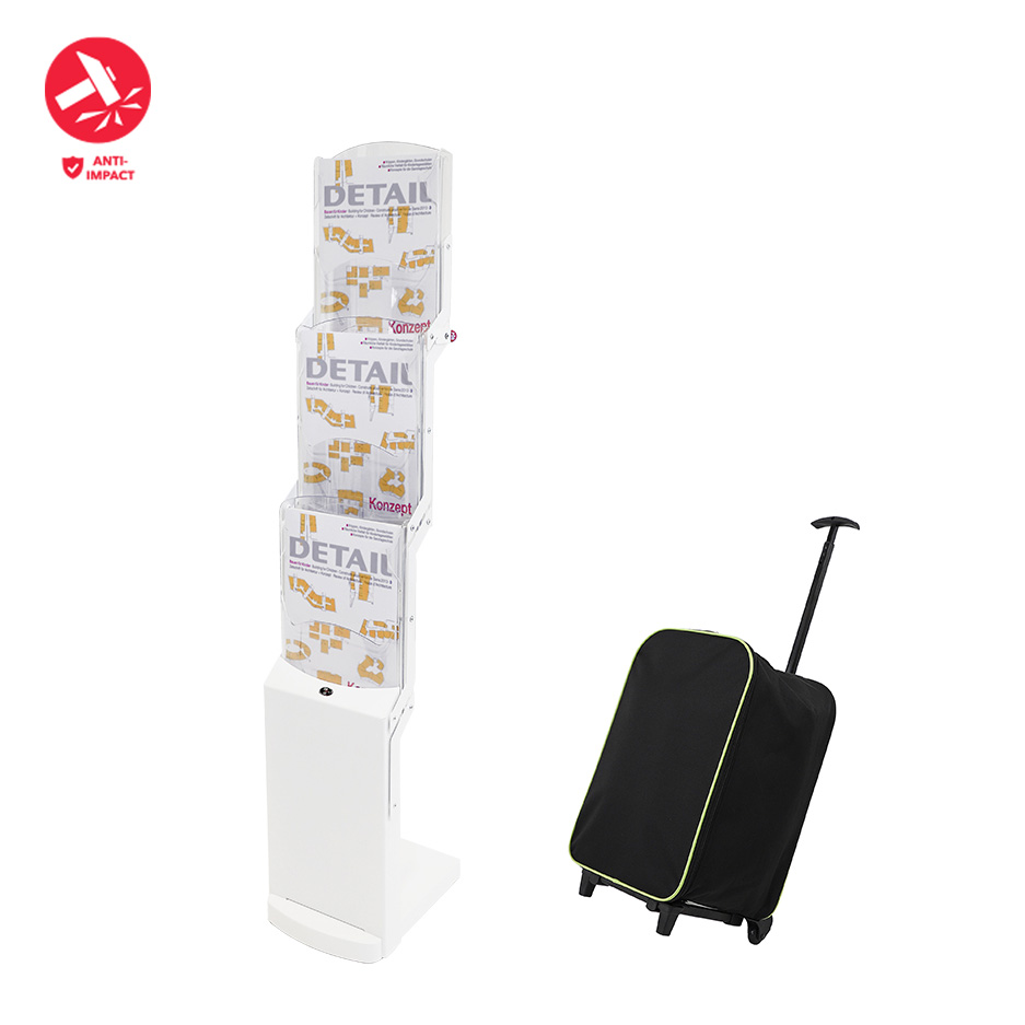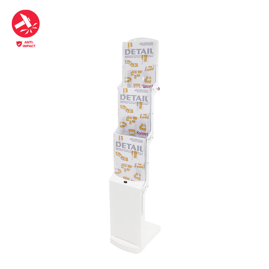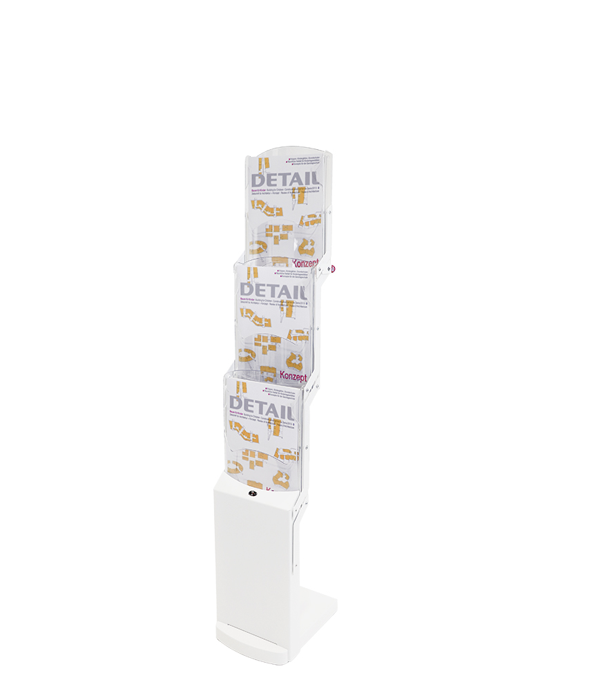 Foldable brochure stand in white, three impact- and scratch-resistant polycarbonate pockets for A4 format, powder-coated metal struts, sturdy base made of lacquered MDF.