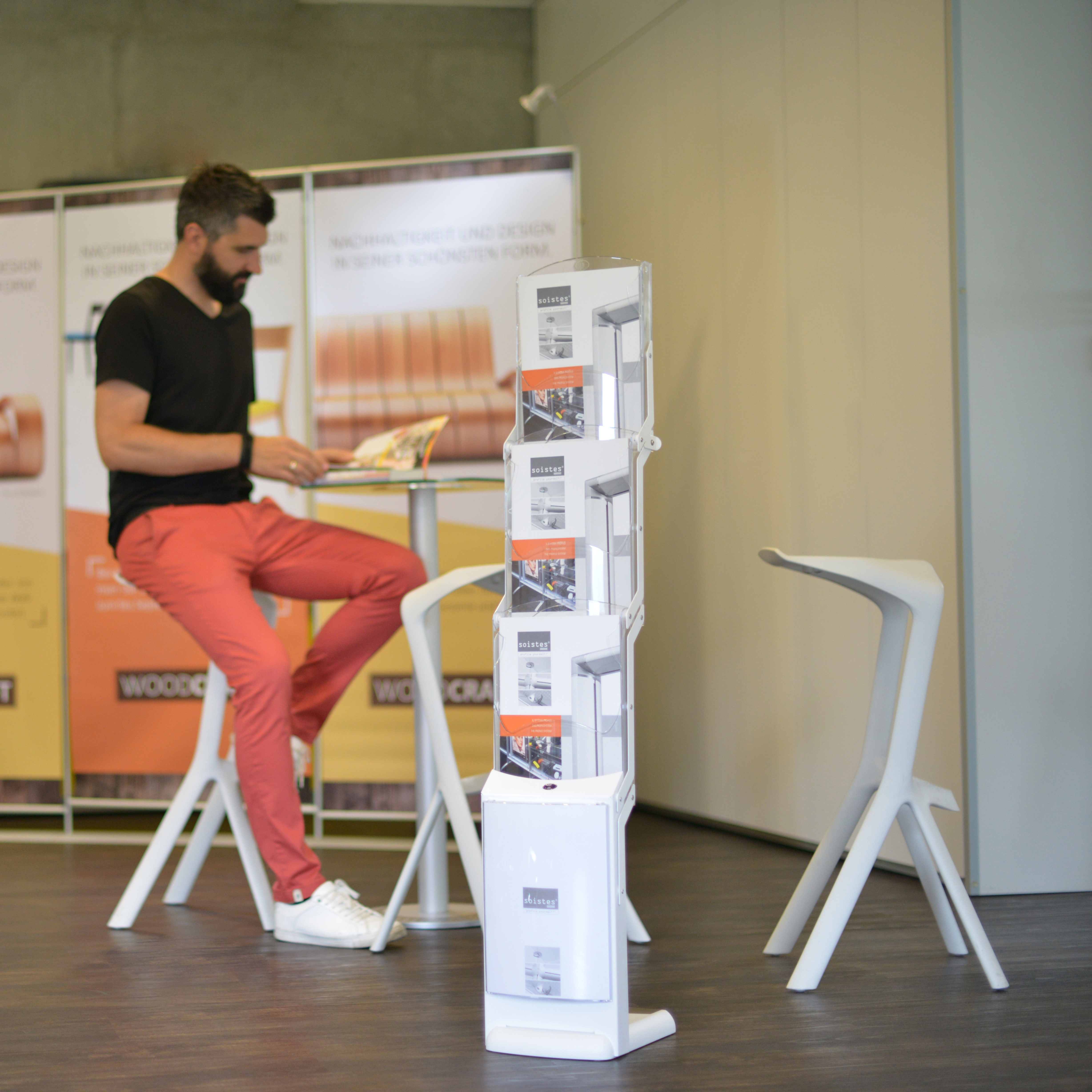 Only from us: single-sheet tilt protection for perfect presentation of even thin flyers.