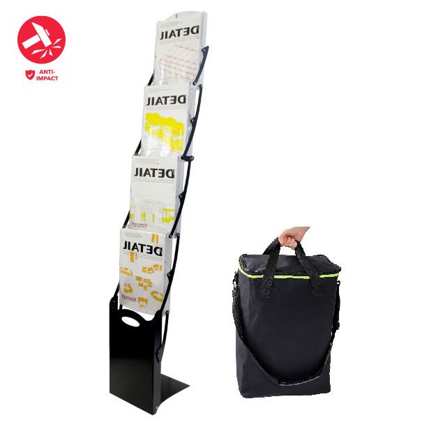 Foldable brochure stand in black, four impact and scratch-resistant polycarbonate pockets for A4 format, metal struts and stable base powder-coated, with integrated carrying handle.