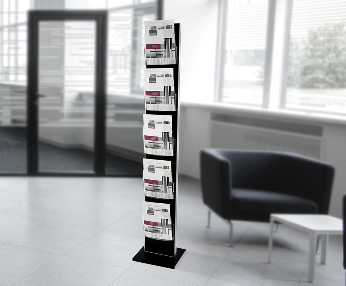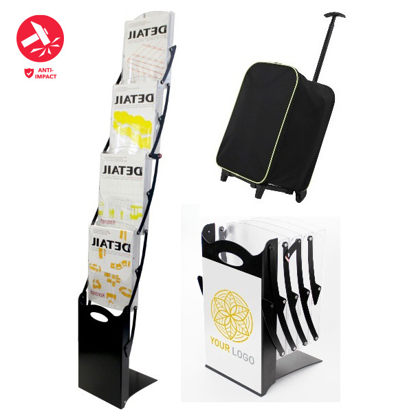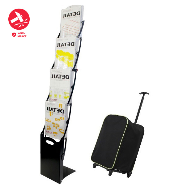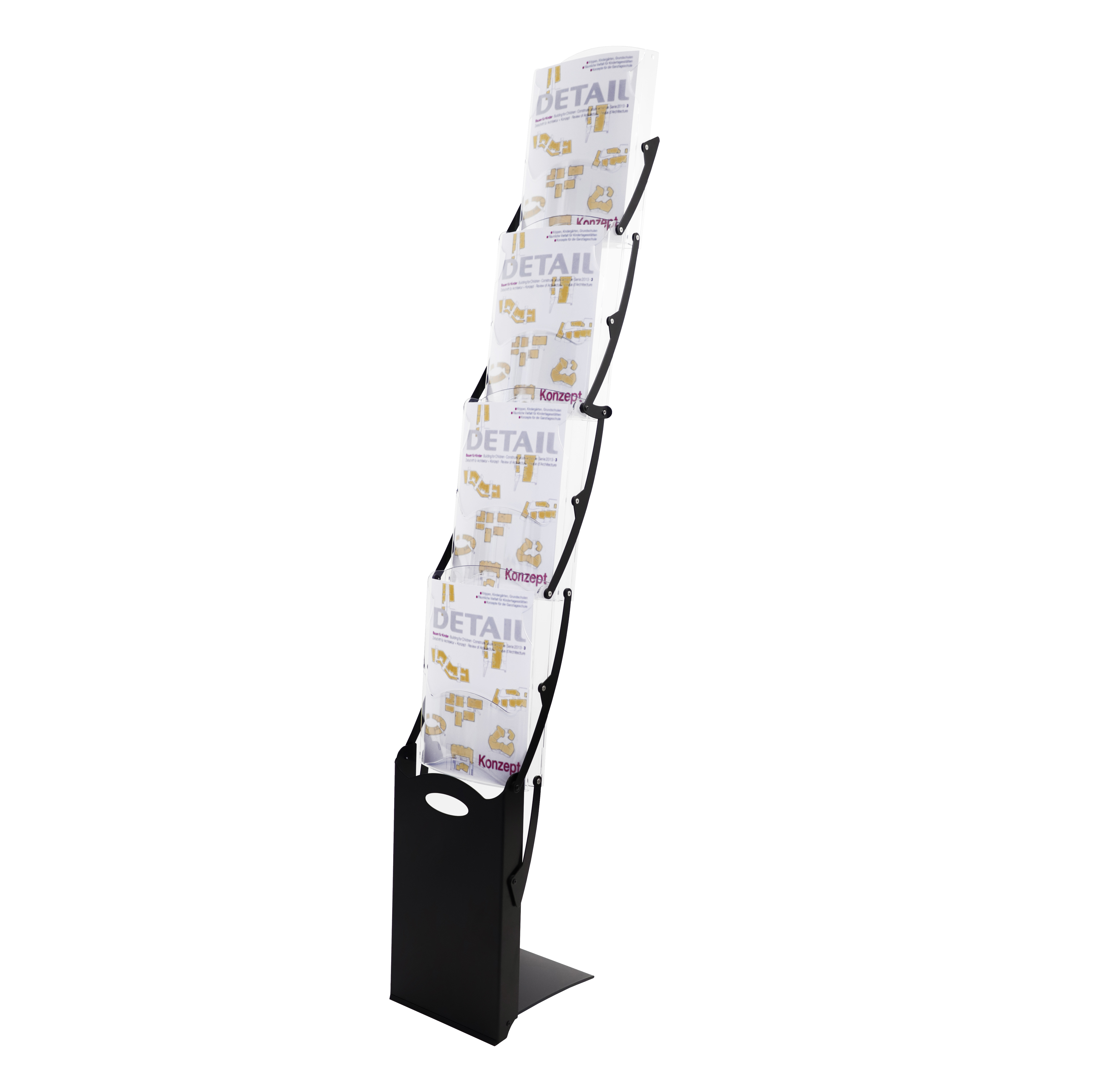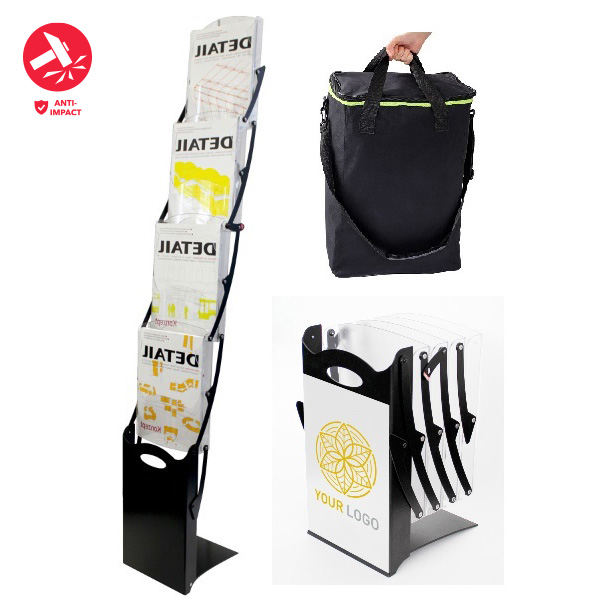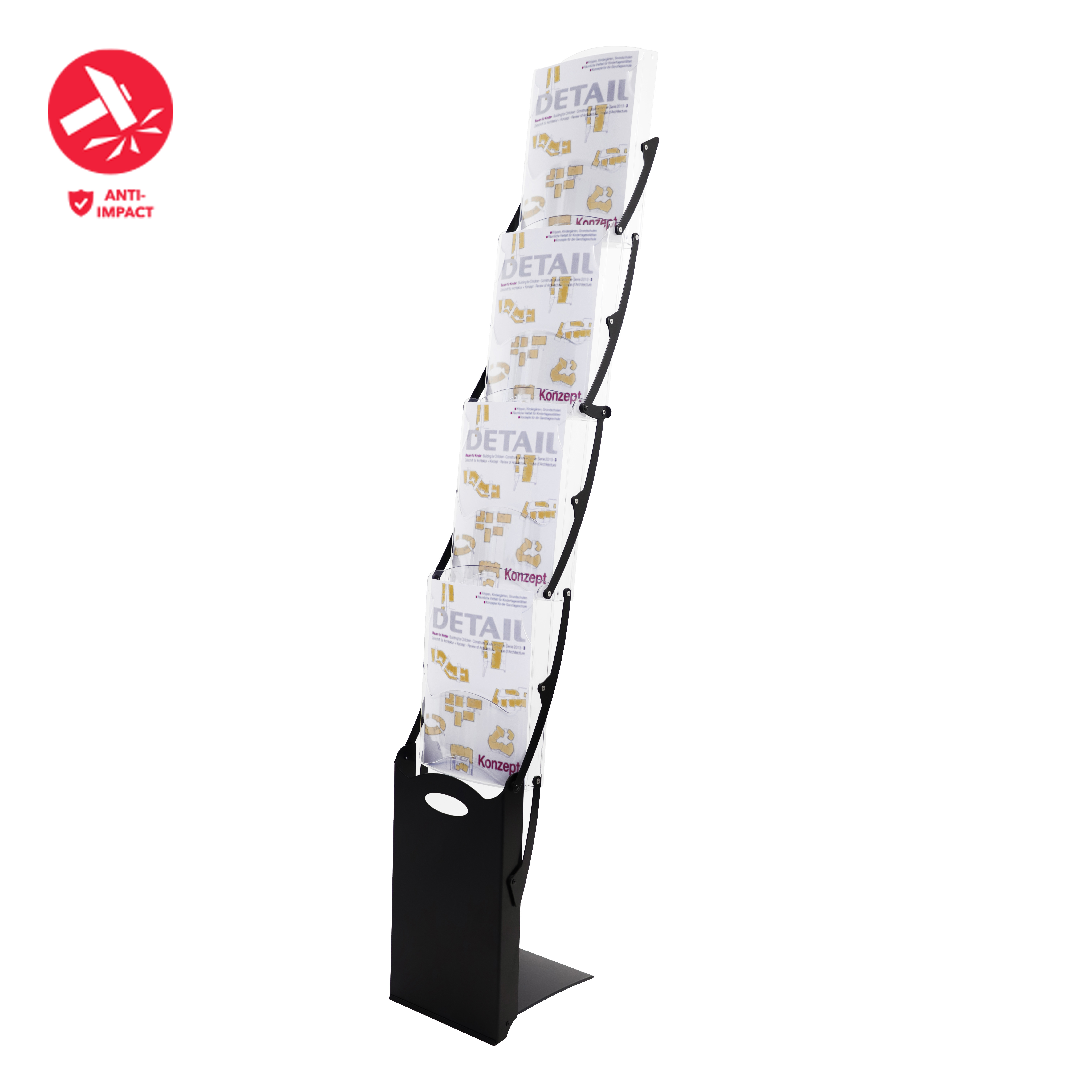 Foldable brochure stand in black, four impact and scratch-resistant polycarbonate pockets for A4 format, metal struts and stable base powder-coated, with integrated carrying handle.