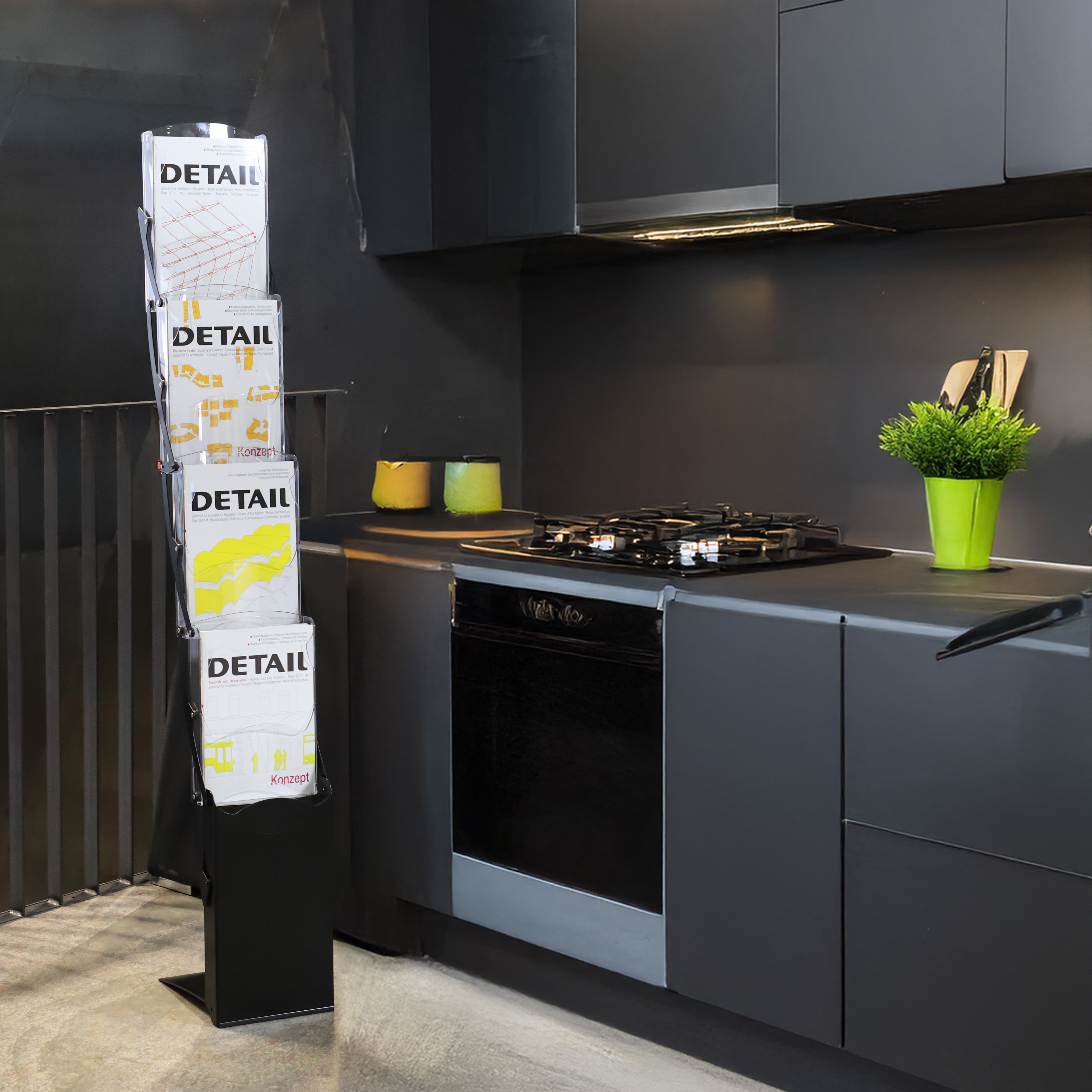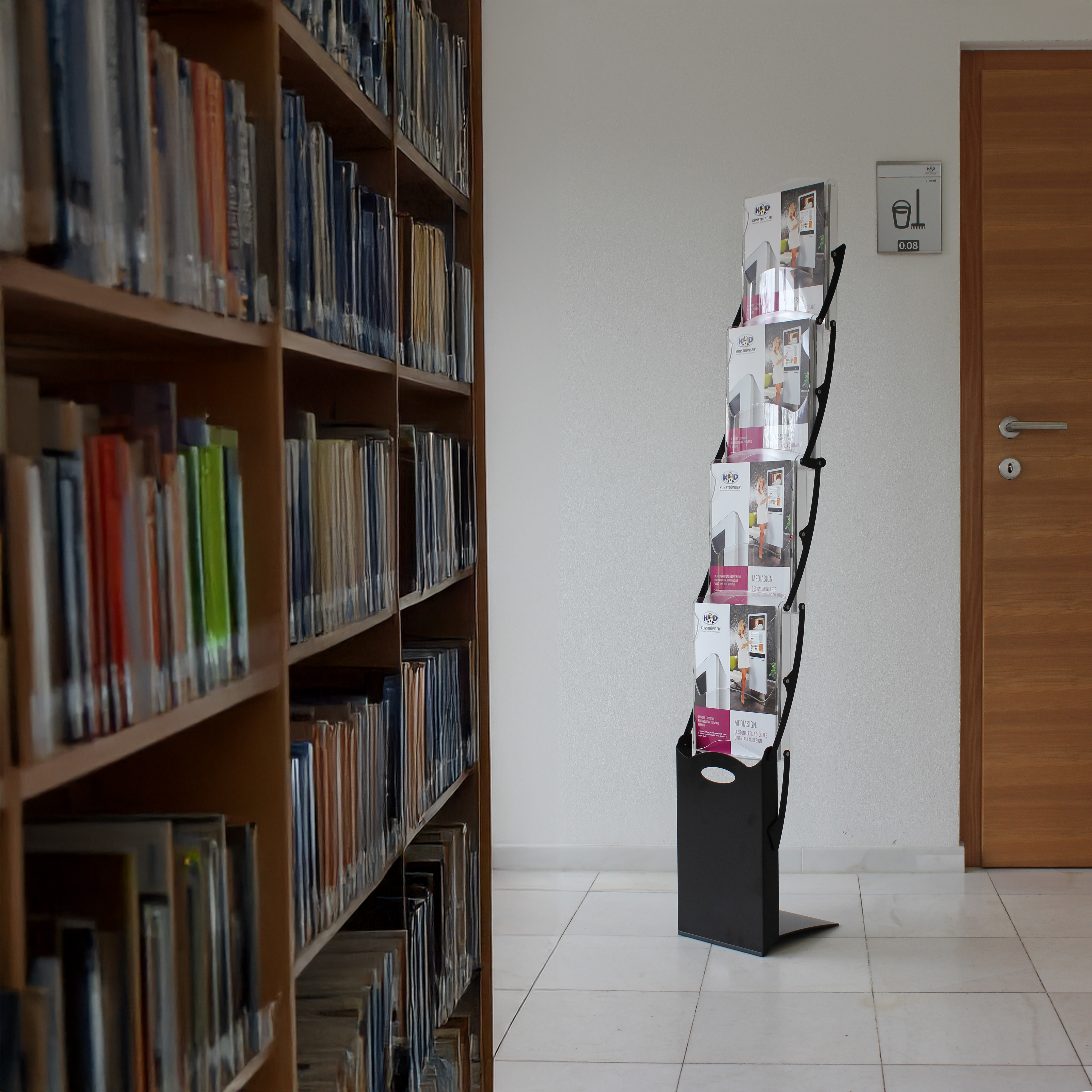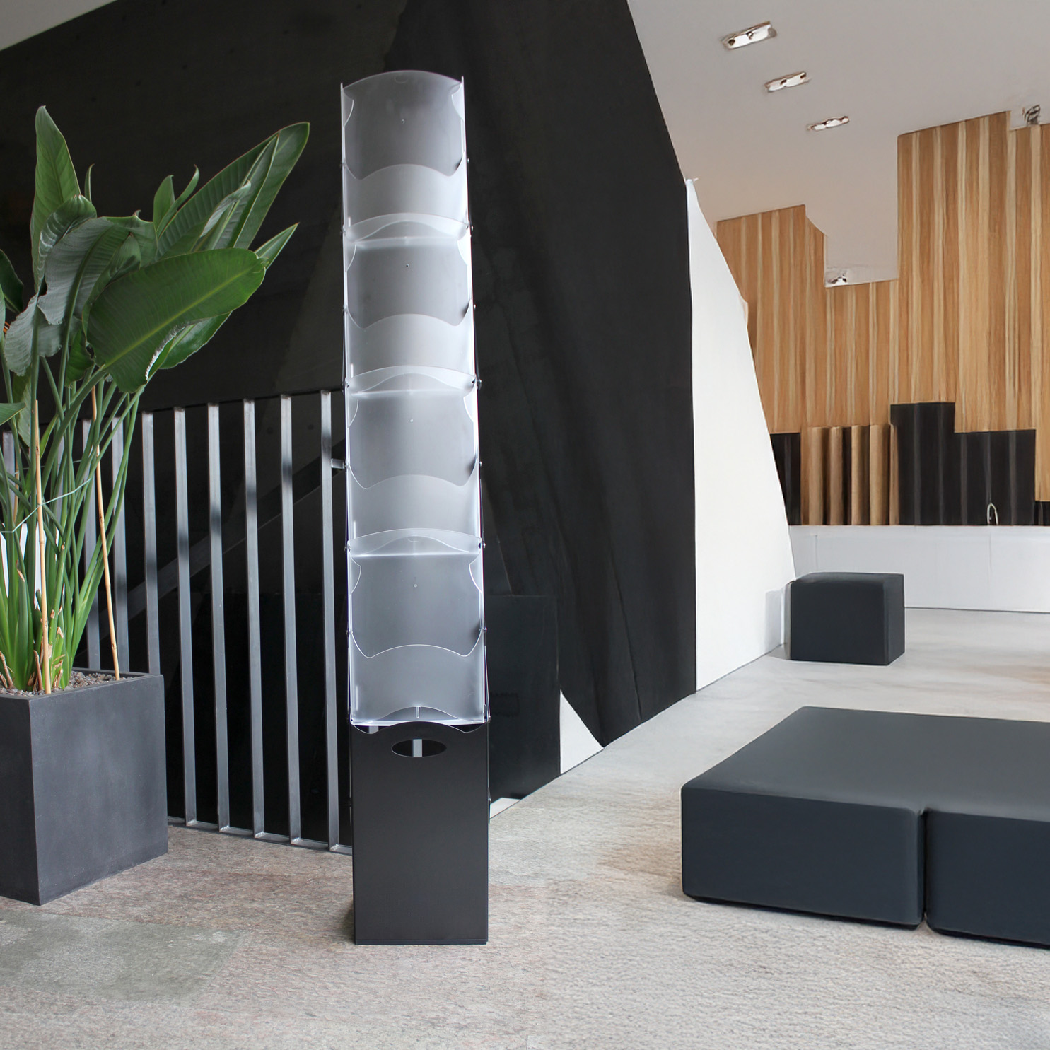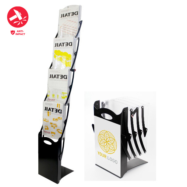 Foldable brochure stand in black, four impact and scratch-resistant polycarbonate pockets for A4 format, metal struts and stable base powder-coated, with integrated carrying handle.