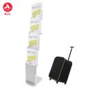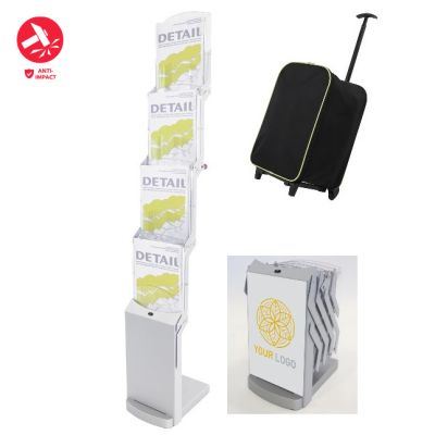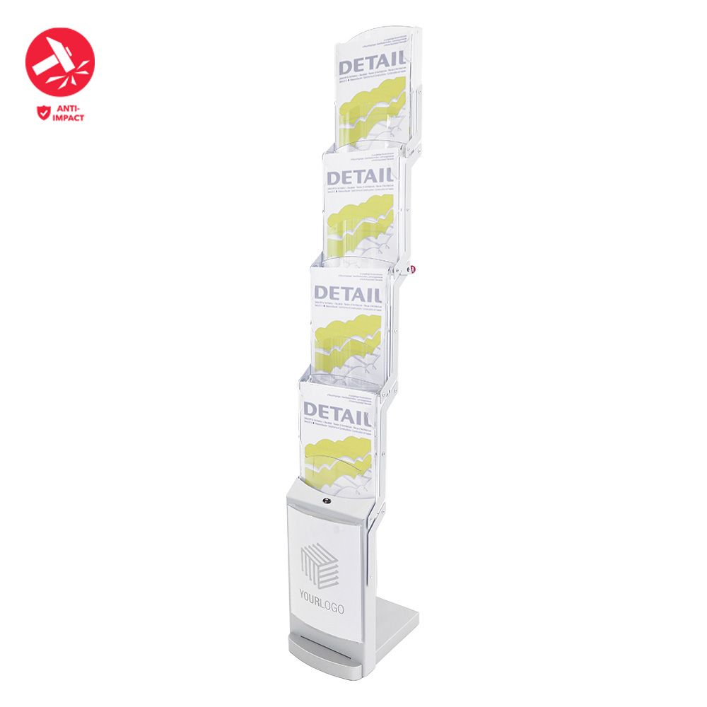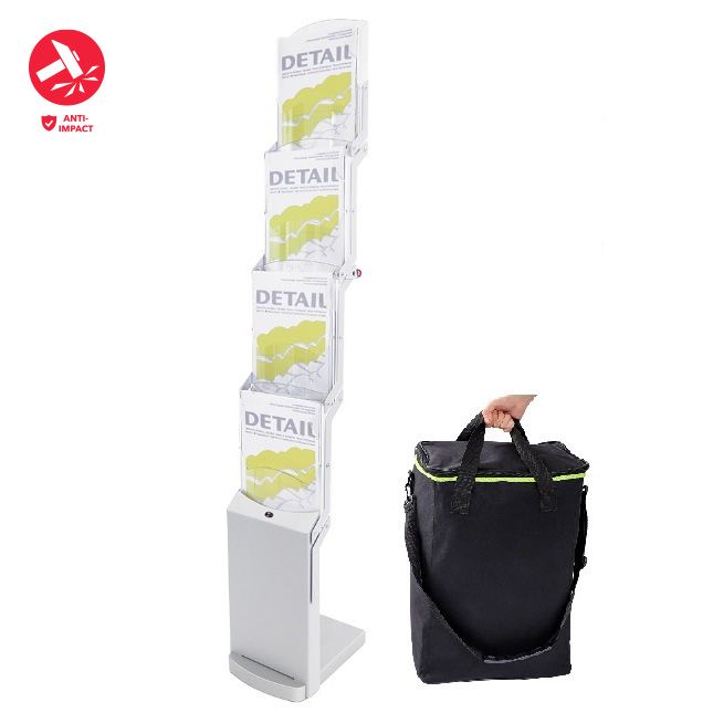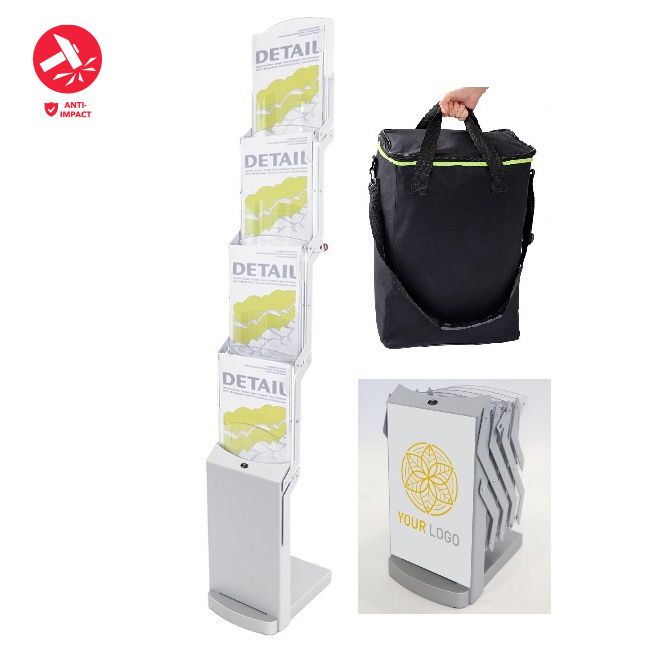 Foldable brochure stand in silvermatt, four impact- and scratch-resistant polycarbonate pockets for A4 format, powder-coated metal struts, sturdy base made of lacquered MDF.
