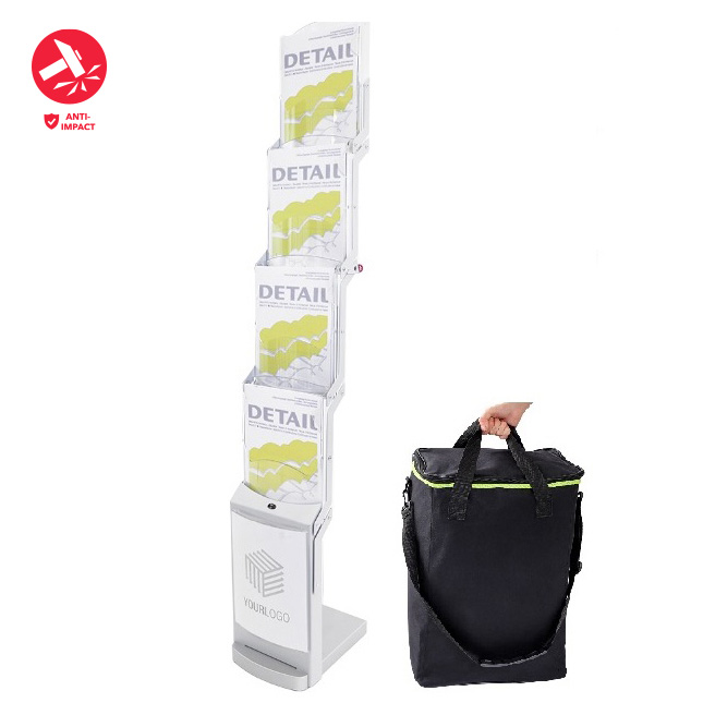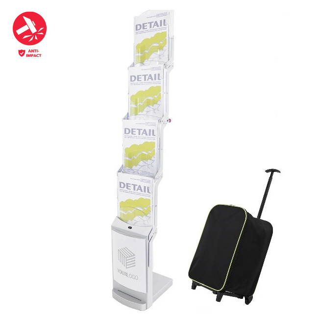 Foldable brochure stand in silvermatt, four impact- and scratch-resistant polycarbonate pockets for A4 format, powder-coated metal struts, sturdy base made of lacquered MDF.