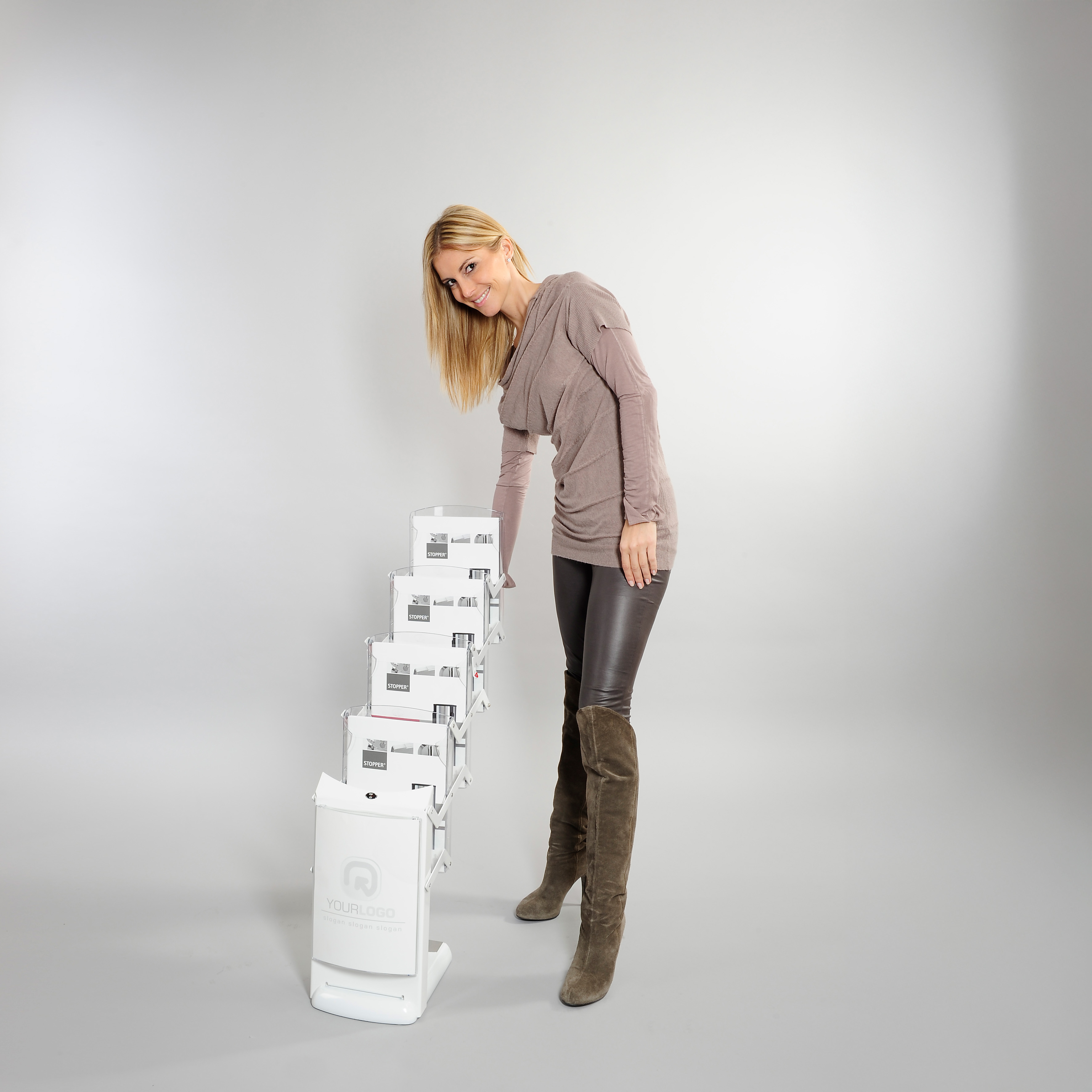 Only from us: single-sheet tilt protection for perfect presentation of even thin flyers.