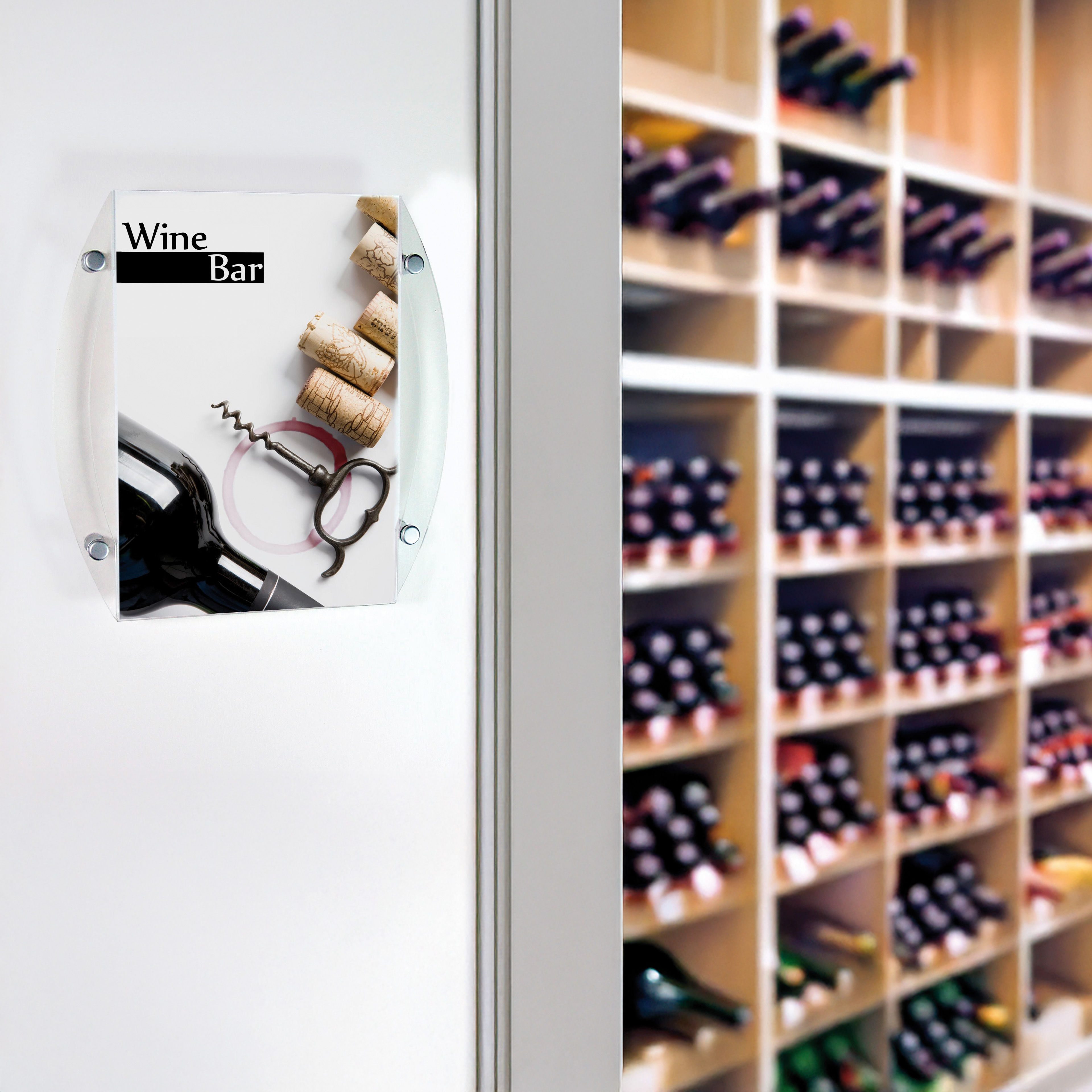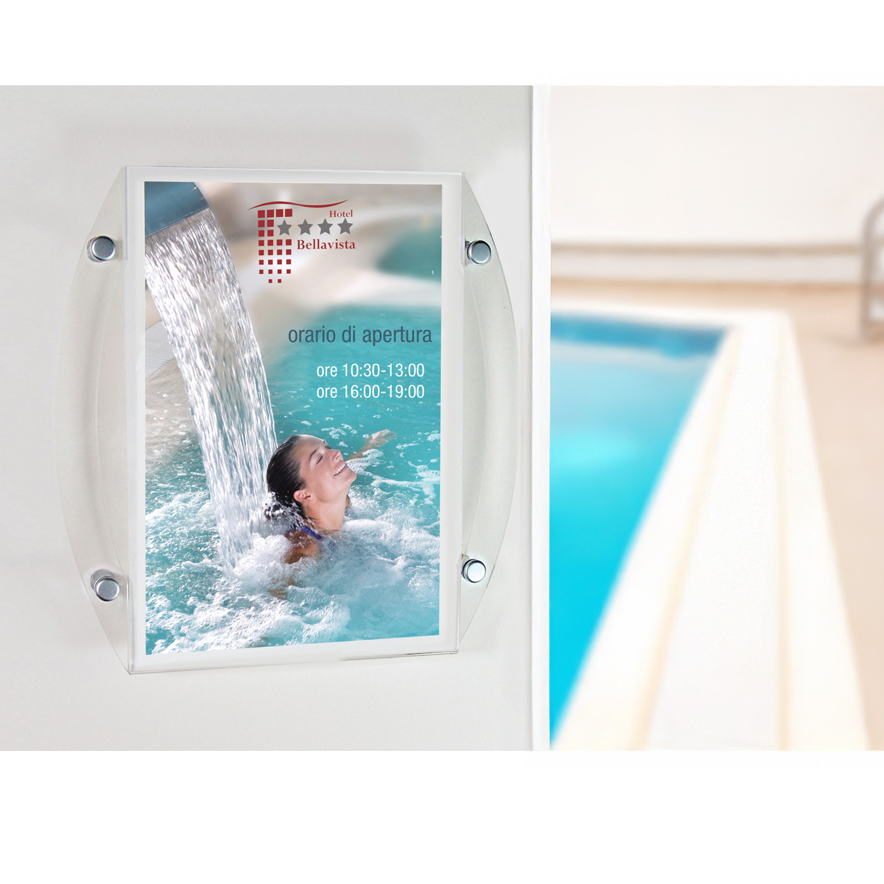 The sign frame made of curved acrylic glass can be easily opened and closed with the opening on the back. The information frame is ideal for places where it is frequently consulted: menus in restaurants, event information in hotels, conference and seminar rooms, room occupancy in offices or hospitals, daily specials in retail stores or travel agencies, stock prices in banks, notices in government offices and insurance companies.
