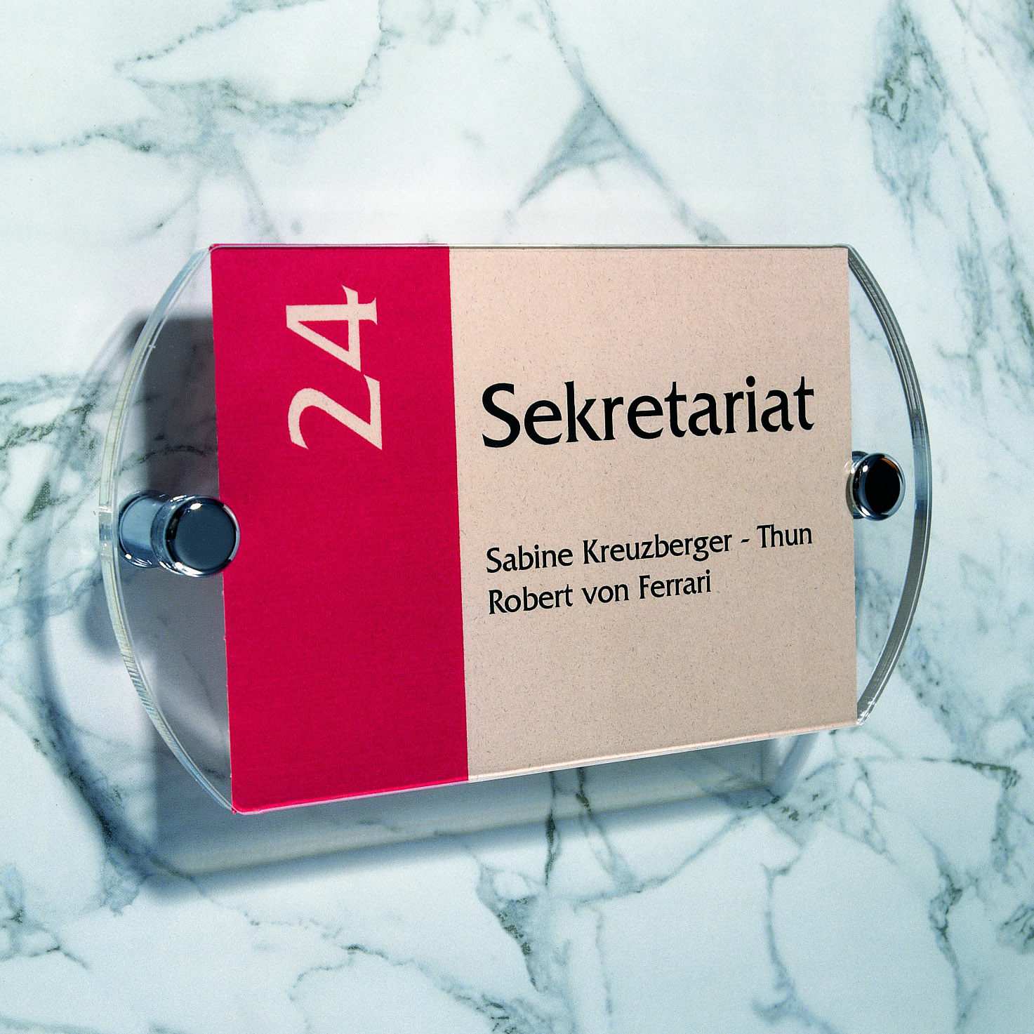 Information and door sign with quick-change function made of transparent, impact-resistant acrylic glass: