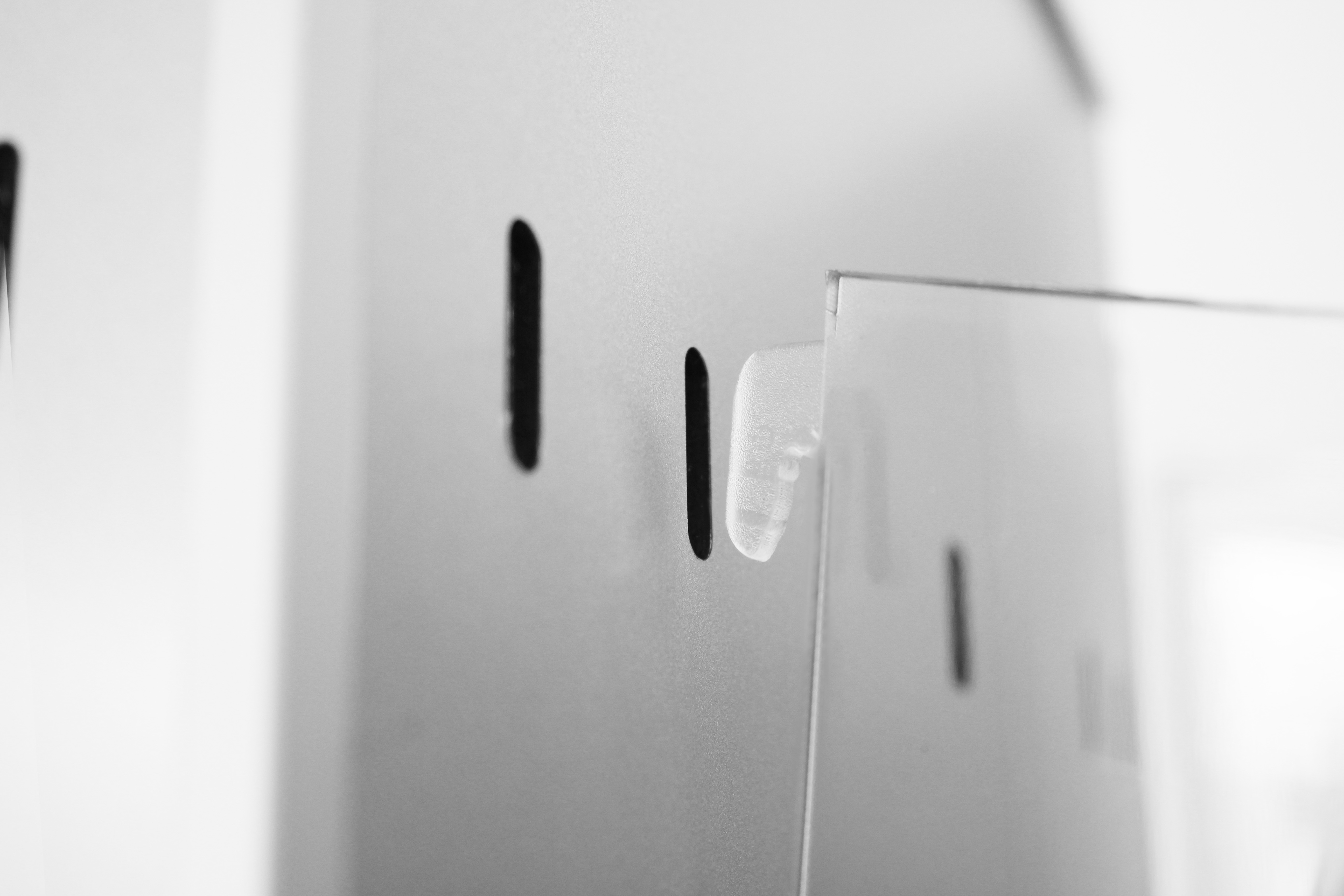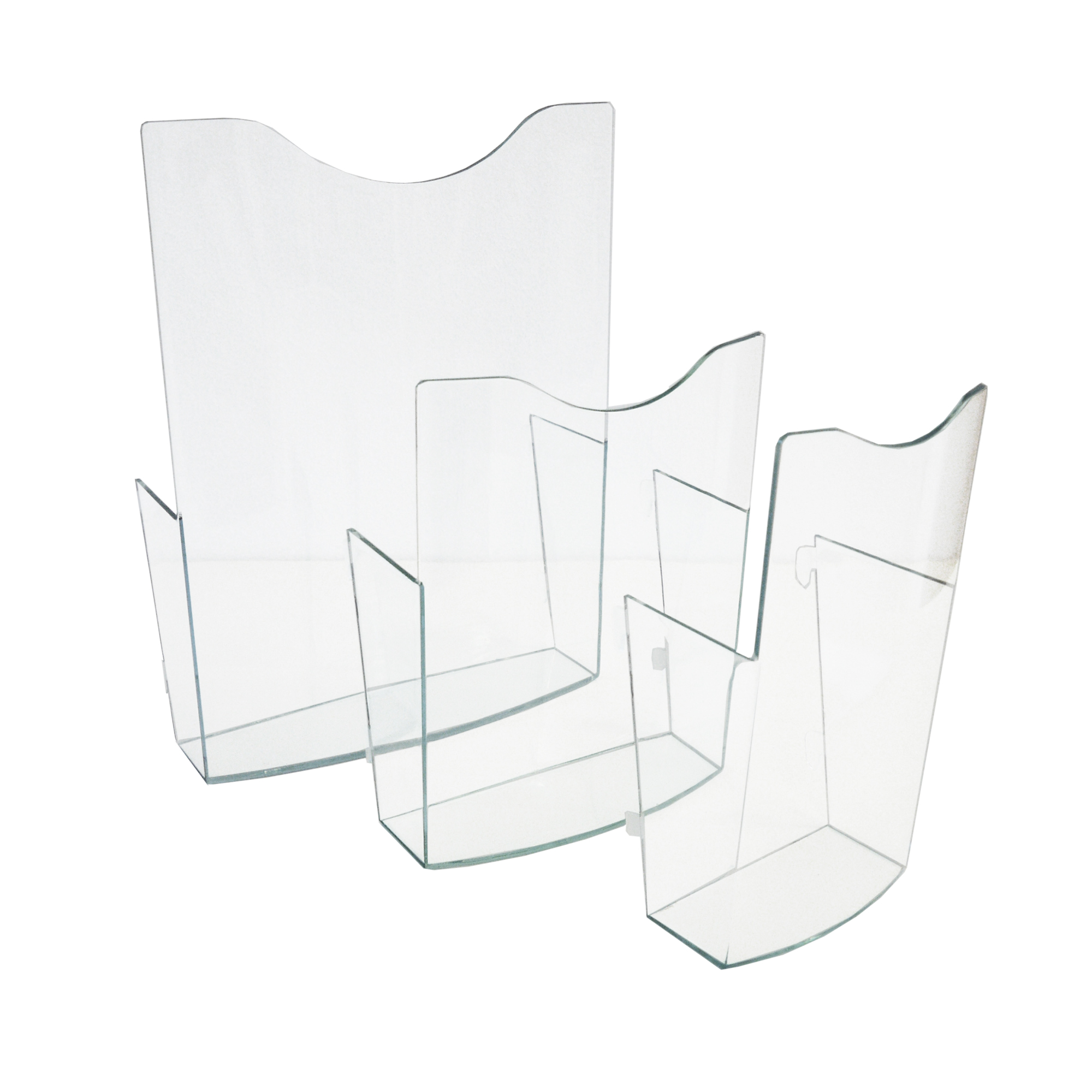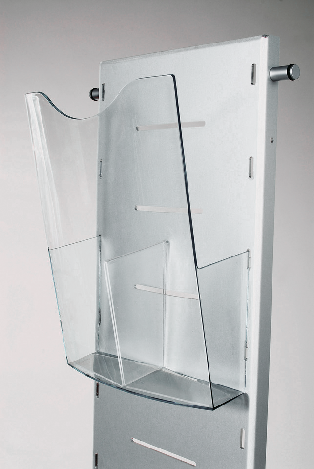 Brochure holder to hook on, UV- and shock-resistant polycarbonate.