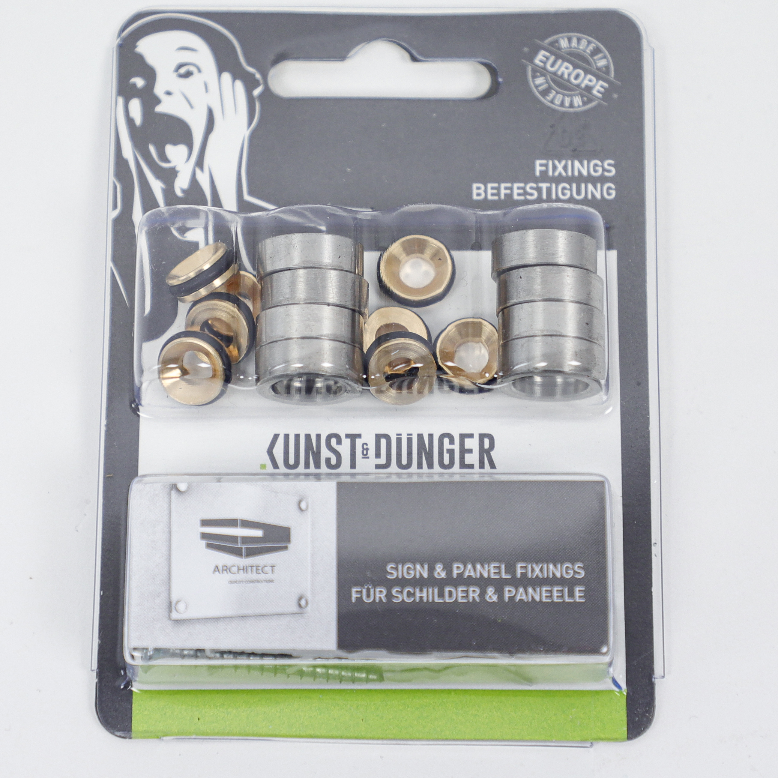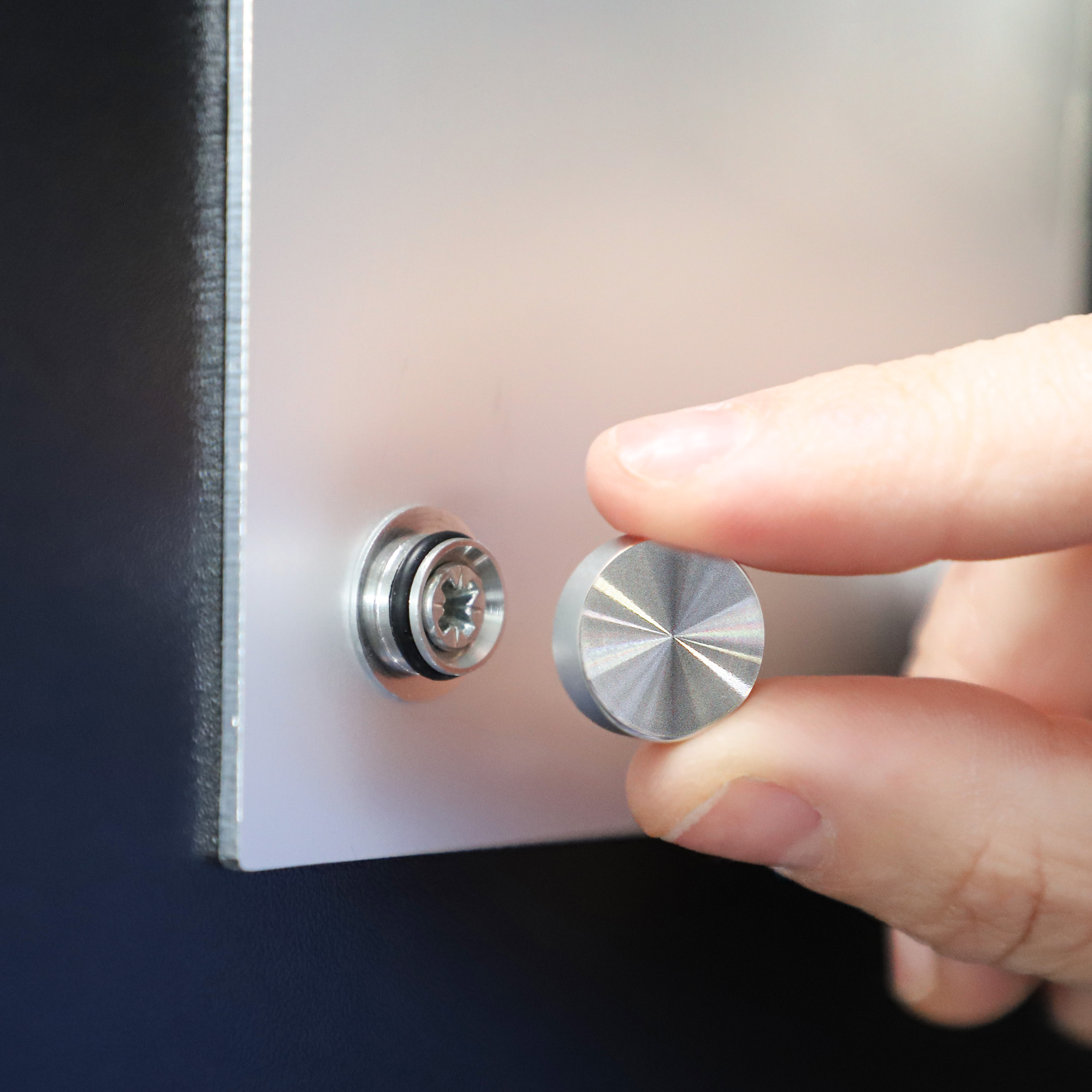Panel fixing for direct wallmounting of signs and panels with high-quality stainless steel decorative cap to click on.