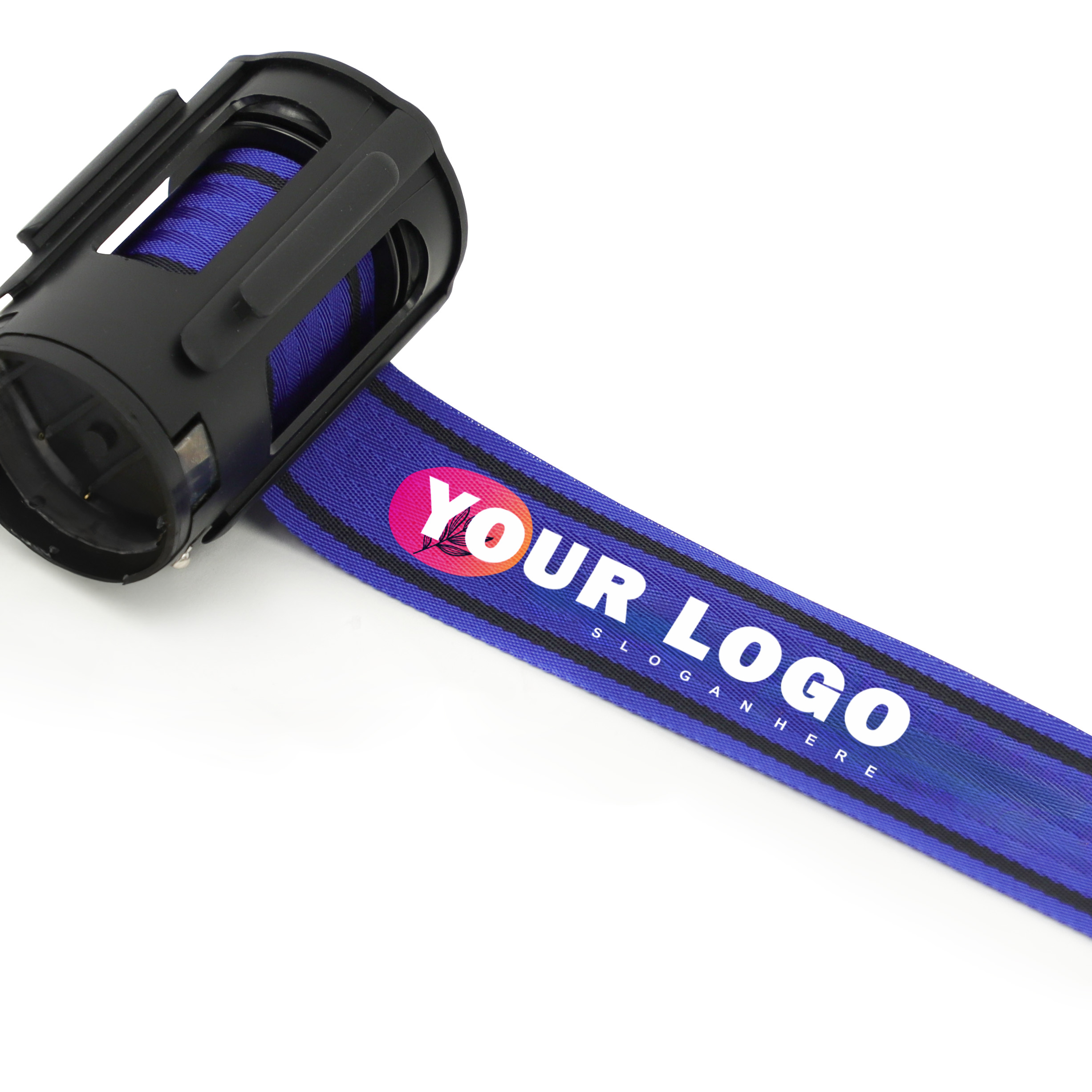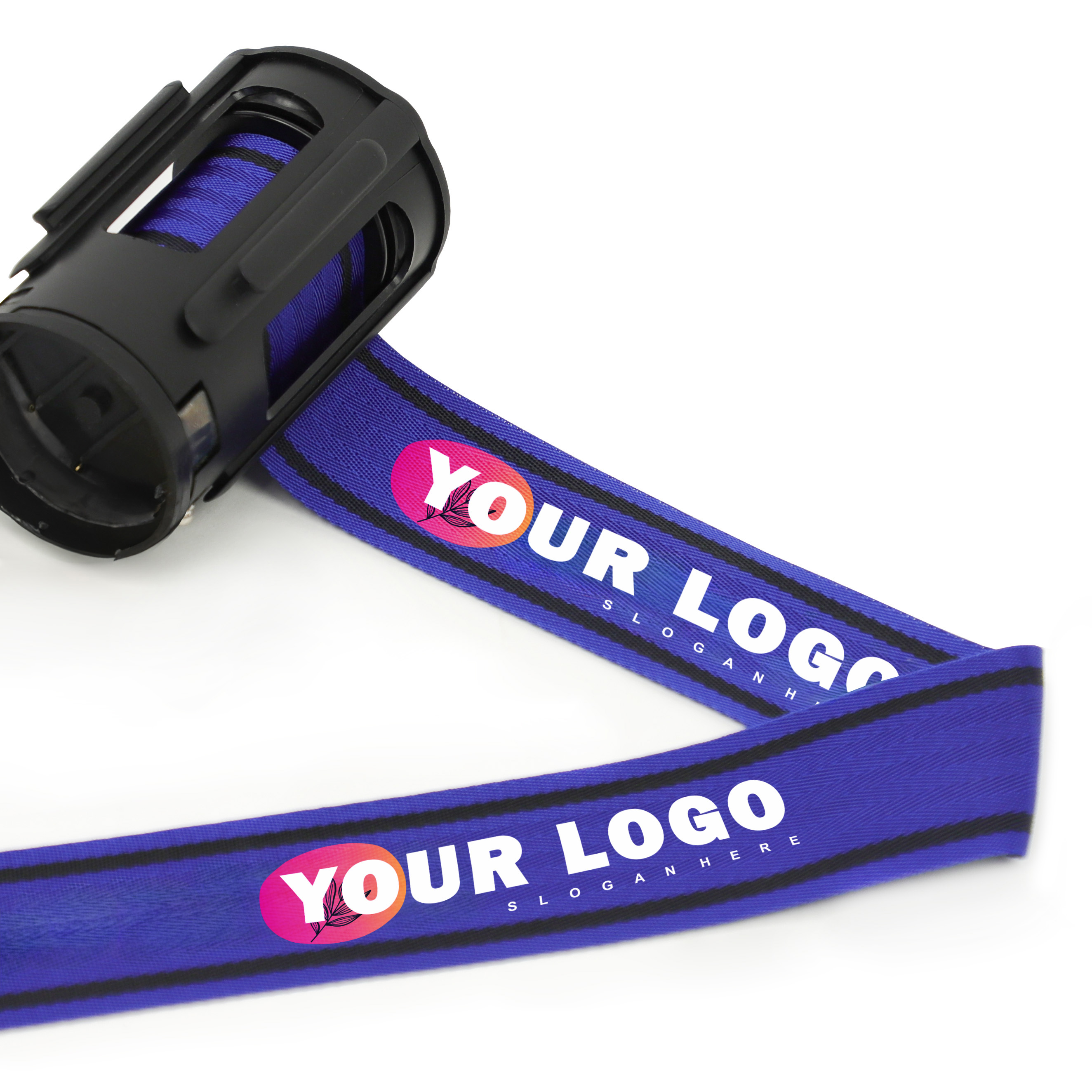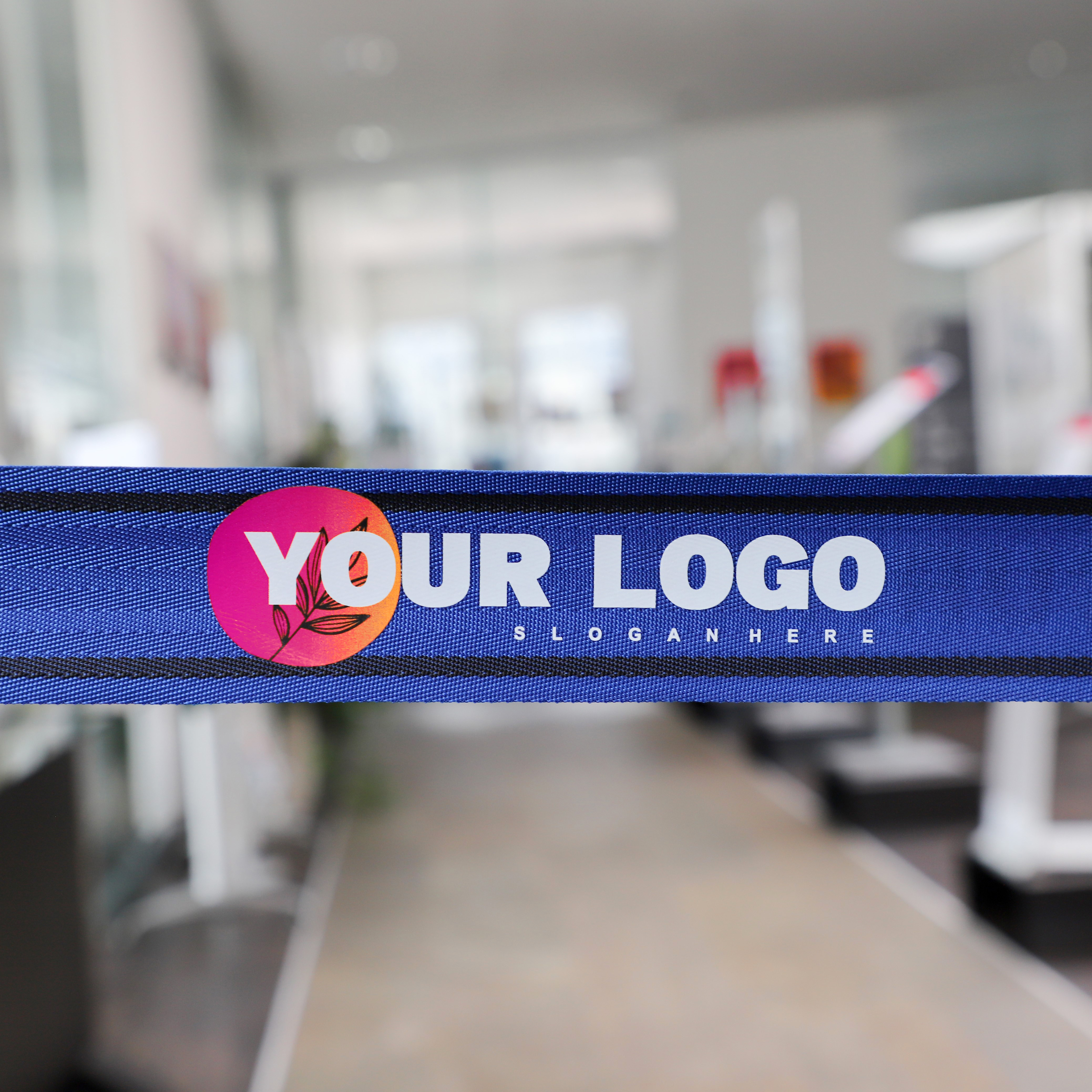 Personnalisez vos systèmes de guidage de personnes avec des sangles, des poteaux de délimitation, des supports de délimitation, des colonnes de délimitation avec ruban : nous imprimons le logo ou le texte de votre choix sur les sangles de tous les poteaux de délimitation de notre gamme de systèmes de guidage de personnes.