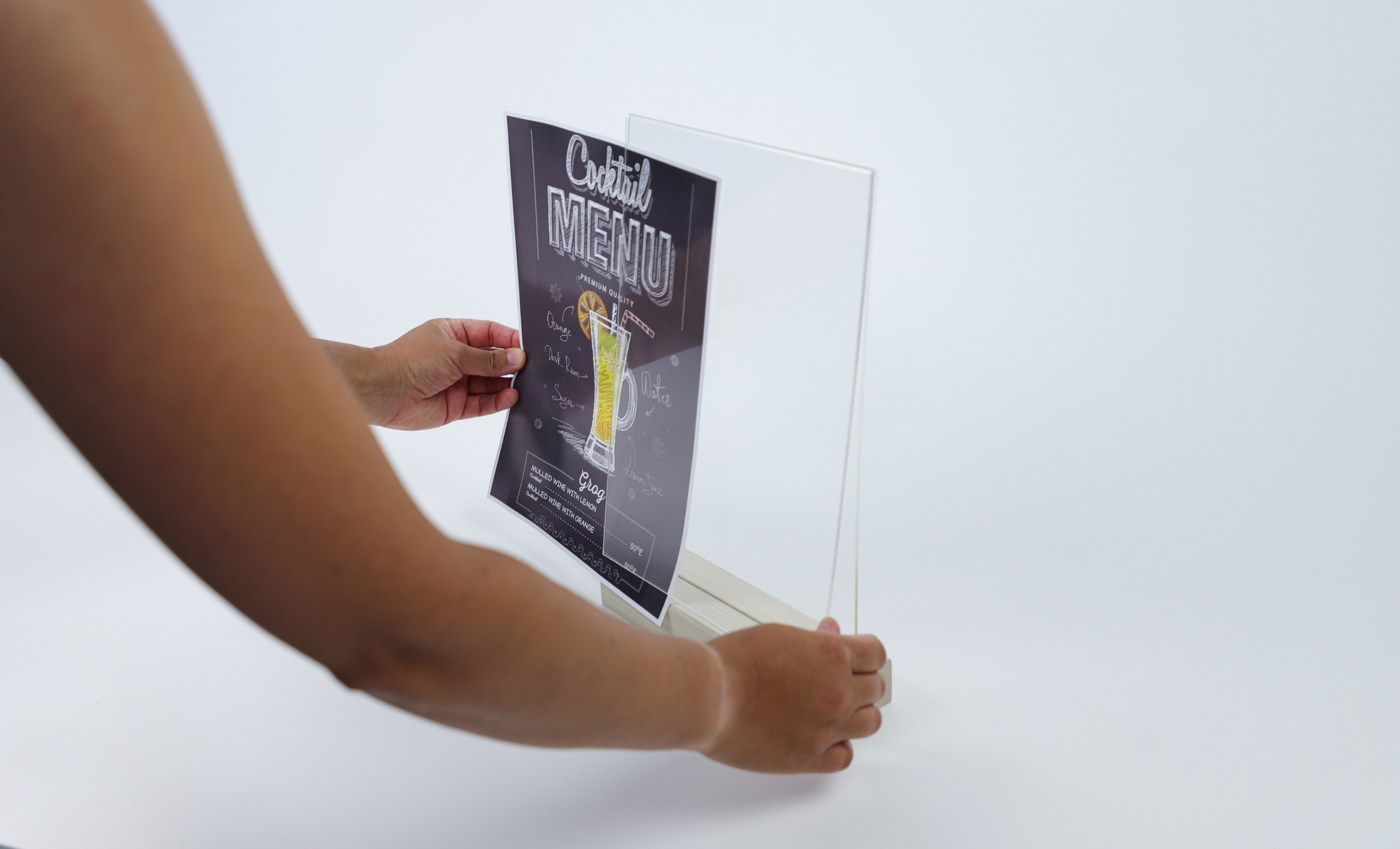 Pochettes info pour présentation info double face à insérer en acrylique, pour table et comptoir avec la base wood menu. Le présentoir wood menu pour table et comptoir est le support idéal, naturel et durable pour les informations, les menus et les étiquettes de prix dans les hôtels, restaurants, magasins et showrooms. La base doit être commandée séparément.