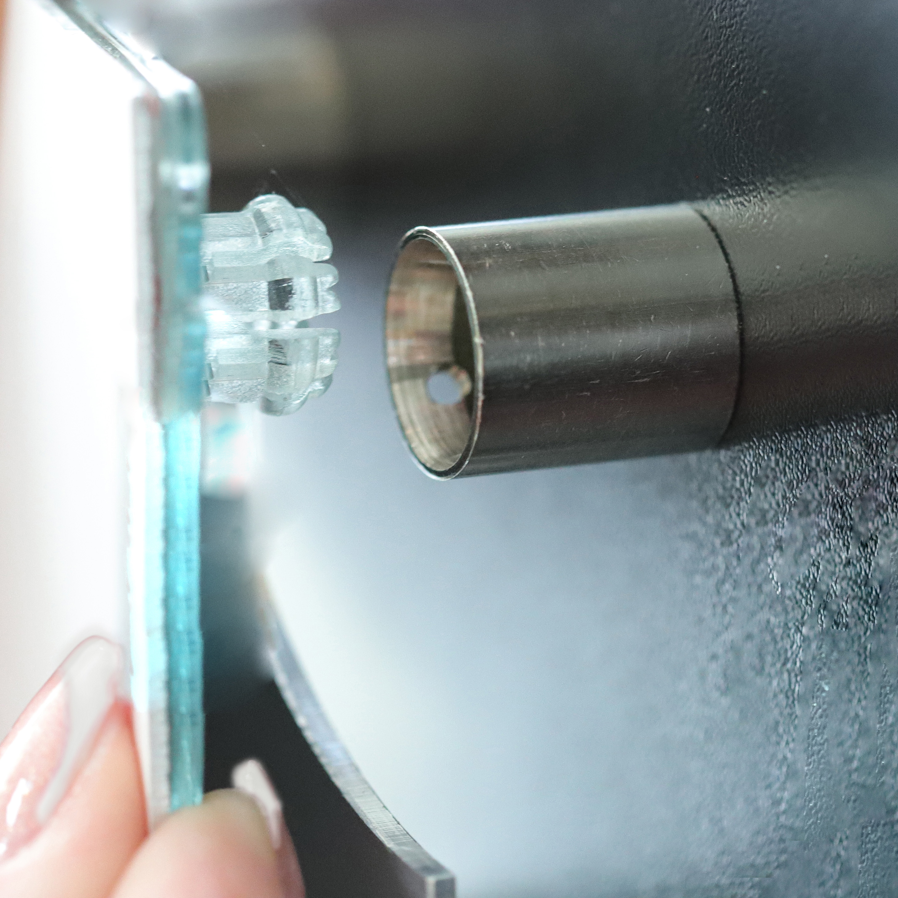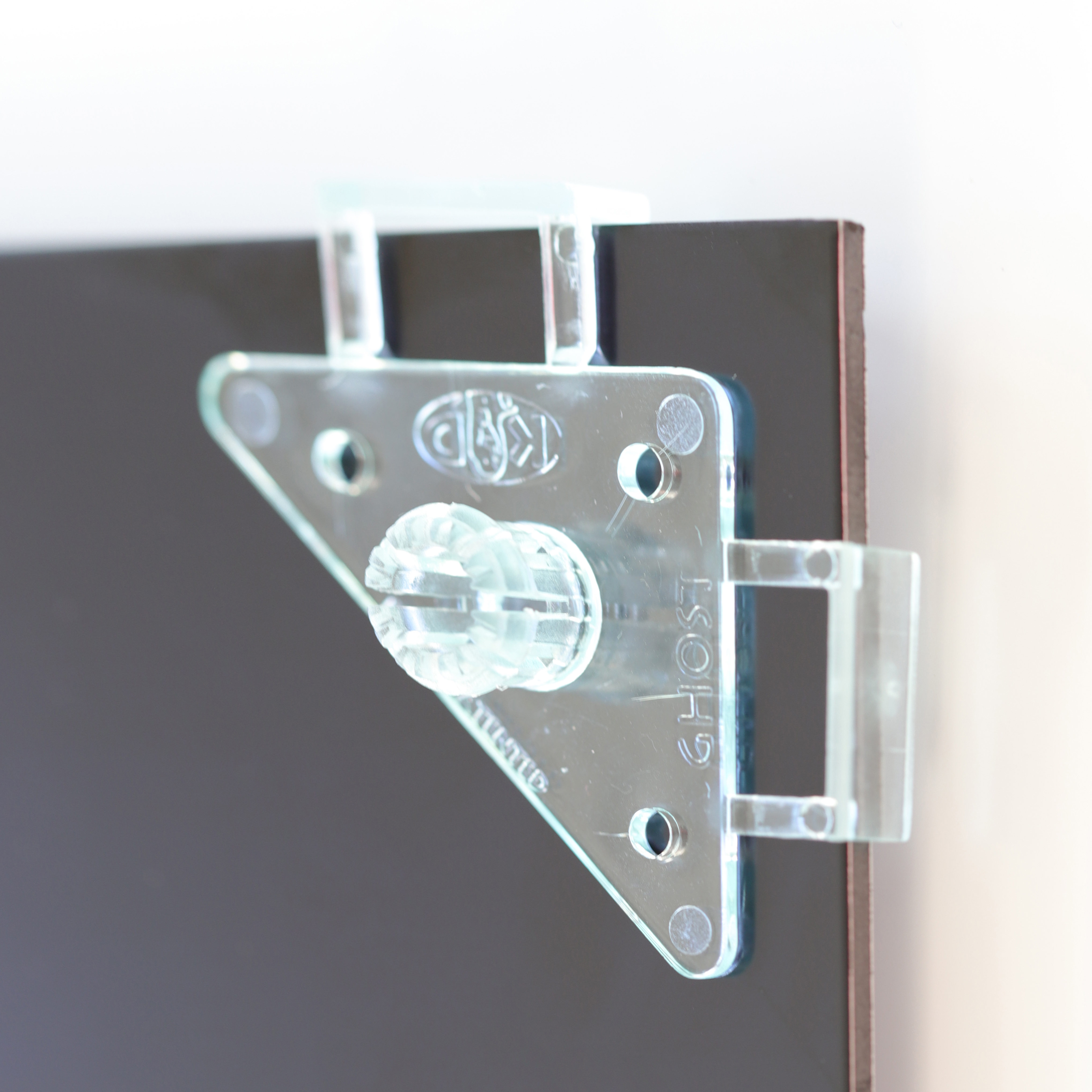 Écarteurs cachés Fisso Ghost : positionner les coins en plastique transparent au dos du panneau à fixer à l'aide des étriers d'écartement et les coller. Déchirer ensuite les étriers d'écartement. Coller les autocollants doubles pratiques pour marquer les trous de perçage sur les têtes en plastique et presser brièvement le panneau contre le mur de sorte que les autocollants restent sur le mur et indiquent la position exacte pour les trous. Monter les douilles métalliques au mur exactement aux endroits indiqués, encliqueter le panneau avec les têtes en plastique et le fixer avec une vis sans tête.