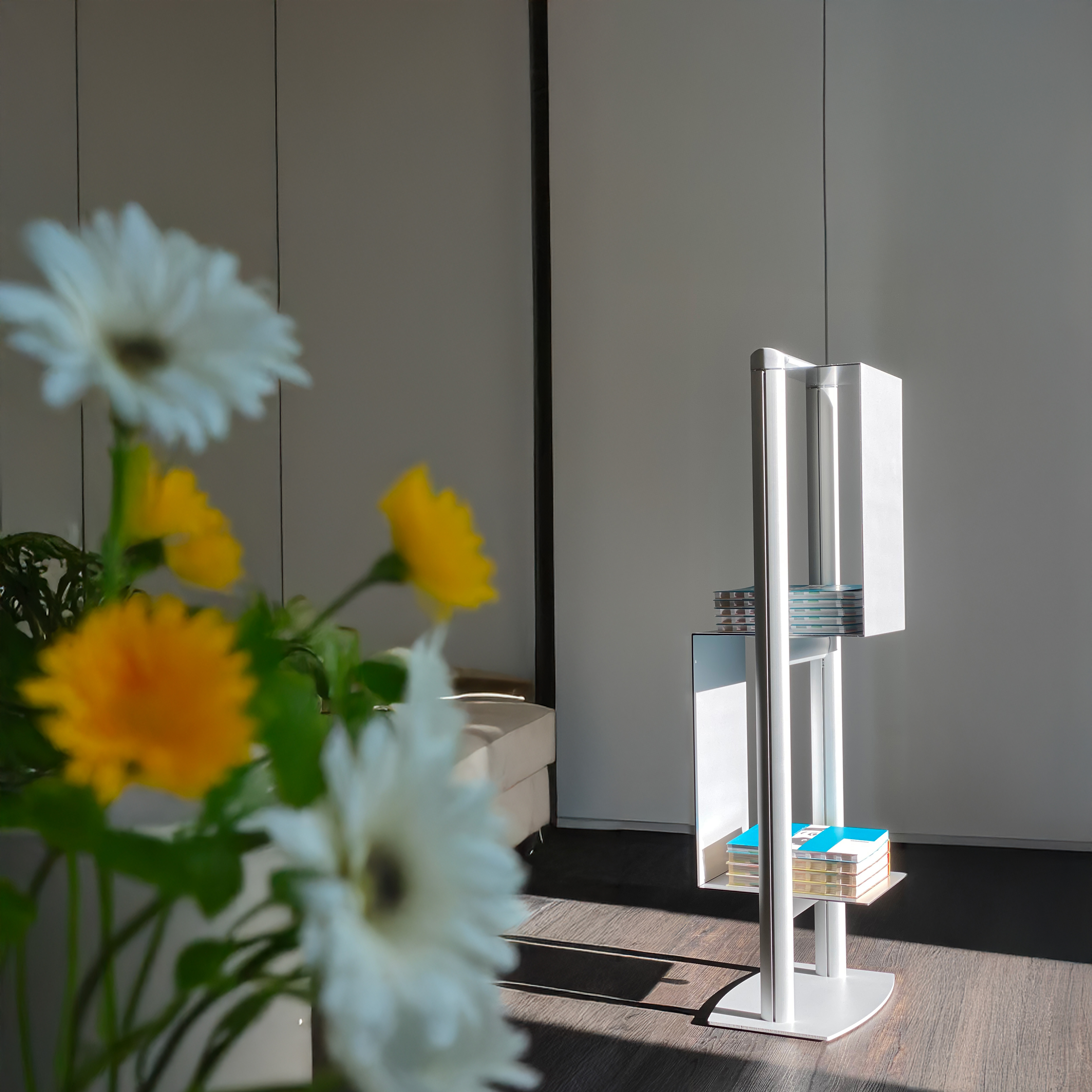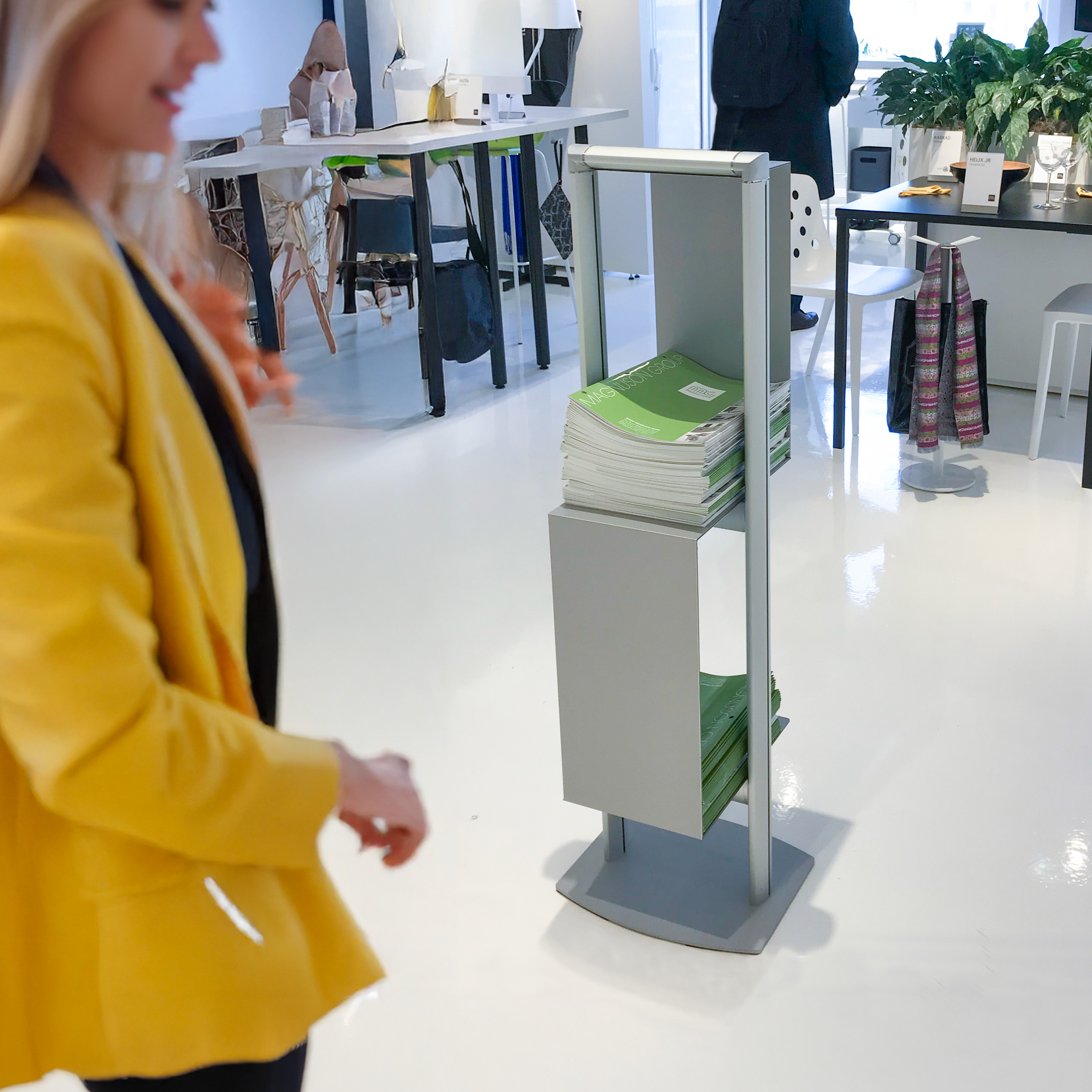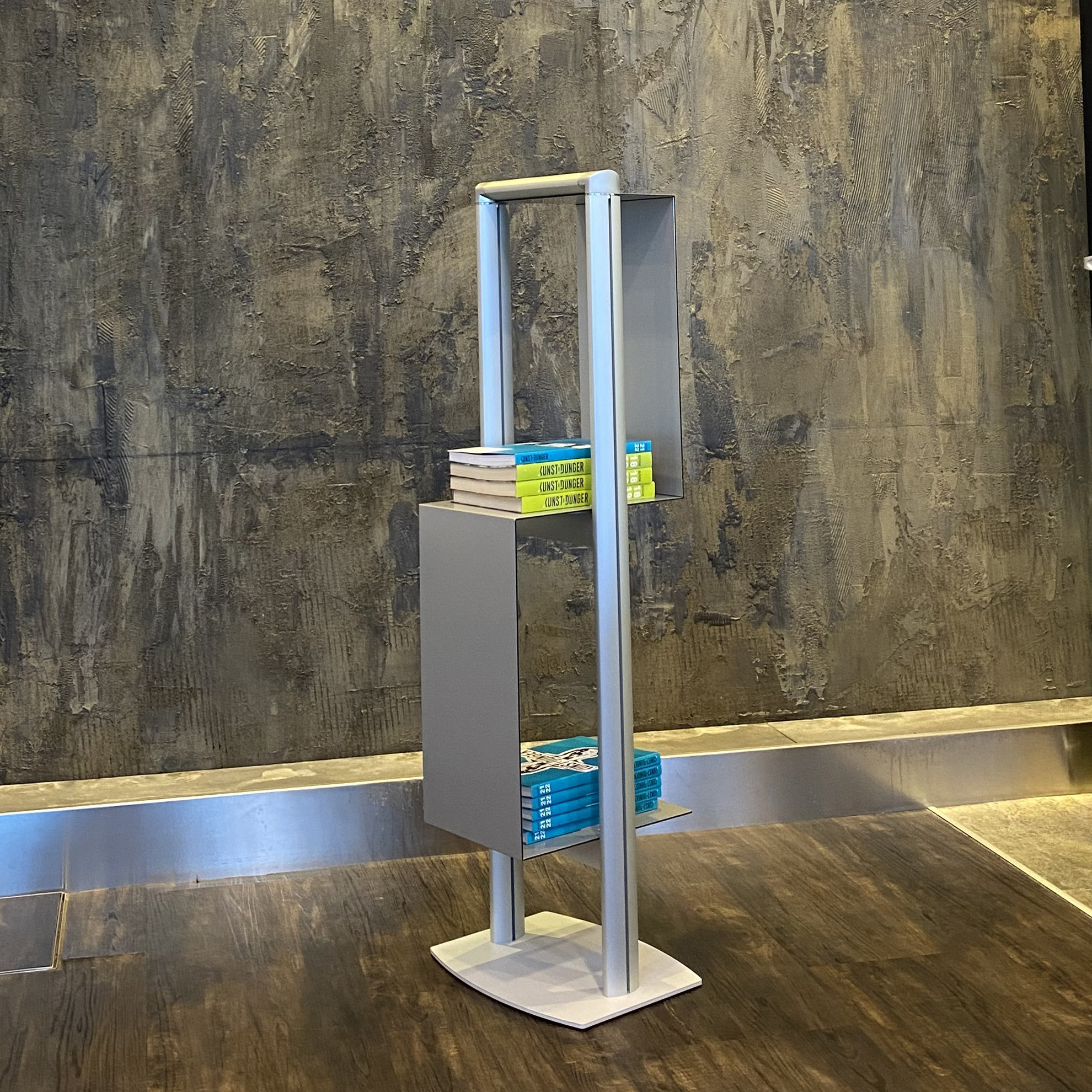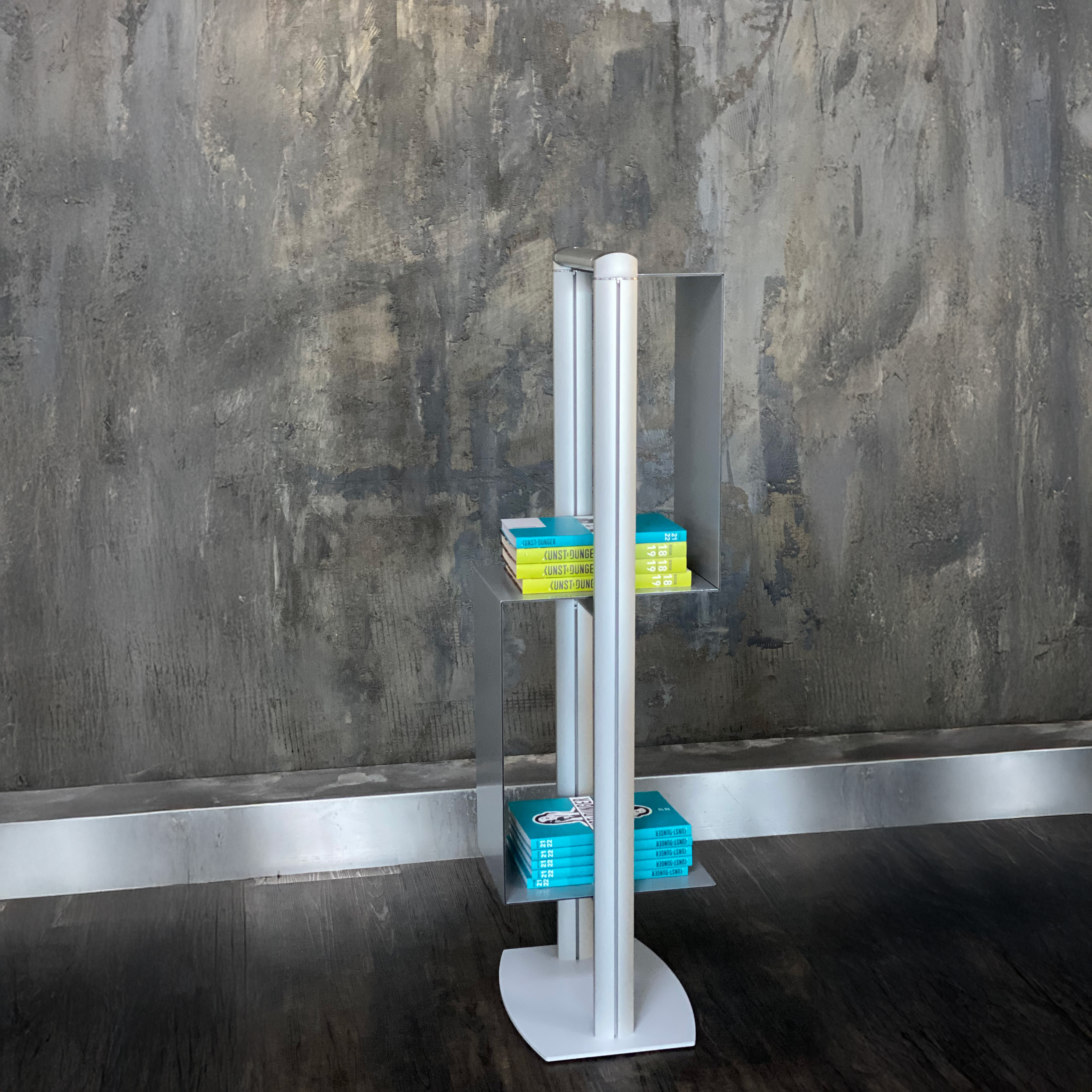 Avec cubic, vous avez de l'espace à gogo pour du matériel publicitaire de tout genre. Le compartiment en forme de "s", en panneau aluminium composite de couleur argent métallisé et la base lacquée de la même couleur, combinés avec les profils en aluminium anodisé de couleur argentée sont bien stables et ont un look d'enfer!