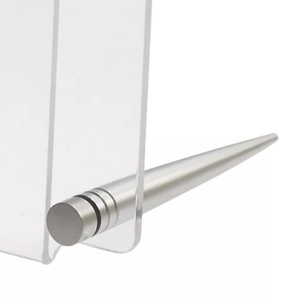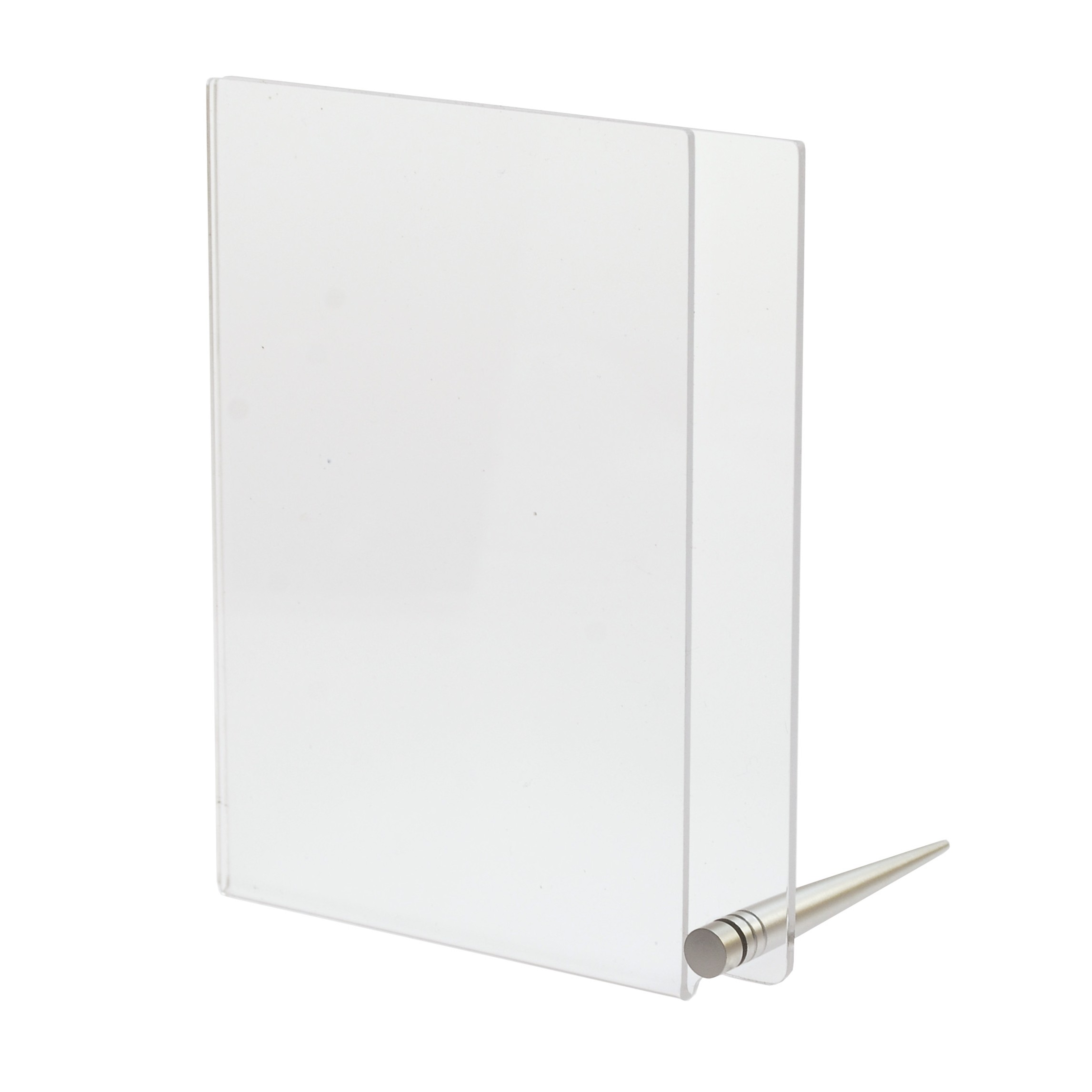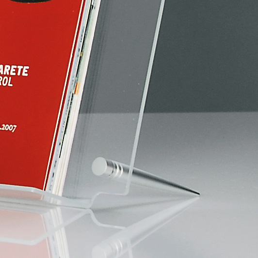 Supporto da tavolo variabile con sistema a brugola. Desk, elegante e variabile, è la soluzione ideale per le vostre informazioni da tavolo e da banco. Inserire il pannello nella brugola e fissarlo con la testina anteriore. Grazie alla posizione del foro da praticare, si pu scegliere e definire l'inclinazione del pannello: più in alto è il foro, maggiore sarà l'inclinazione del pannello. Per pannelli singoli come anche per sistemi a sandwich delle stesse dimensioni. Fissaggio: sistema a brugola, variabile. Materiale: ottone cromato color argento satinato o cromo lucido. Spessore del pannello: variabile fino ad un massimo di 10mm. Foro del pannello: Ø4mm aluminio argento