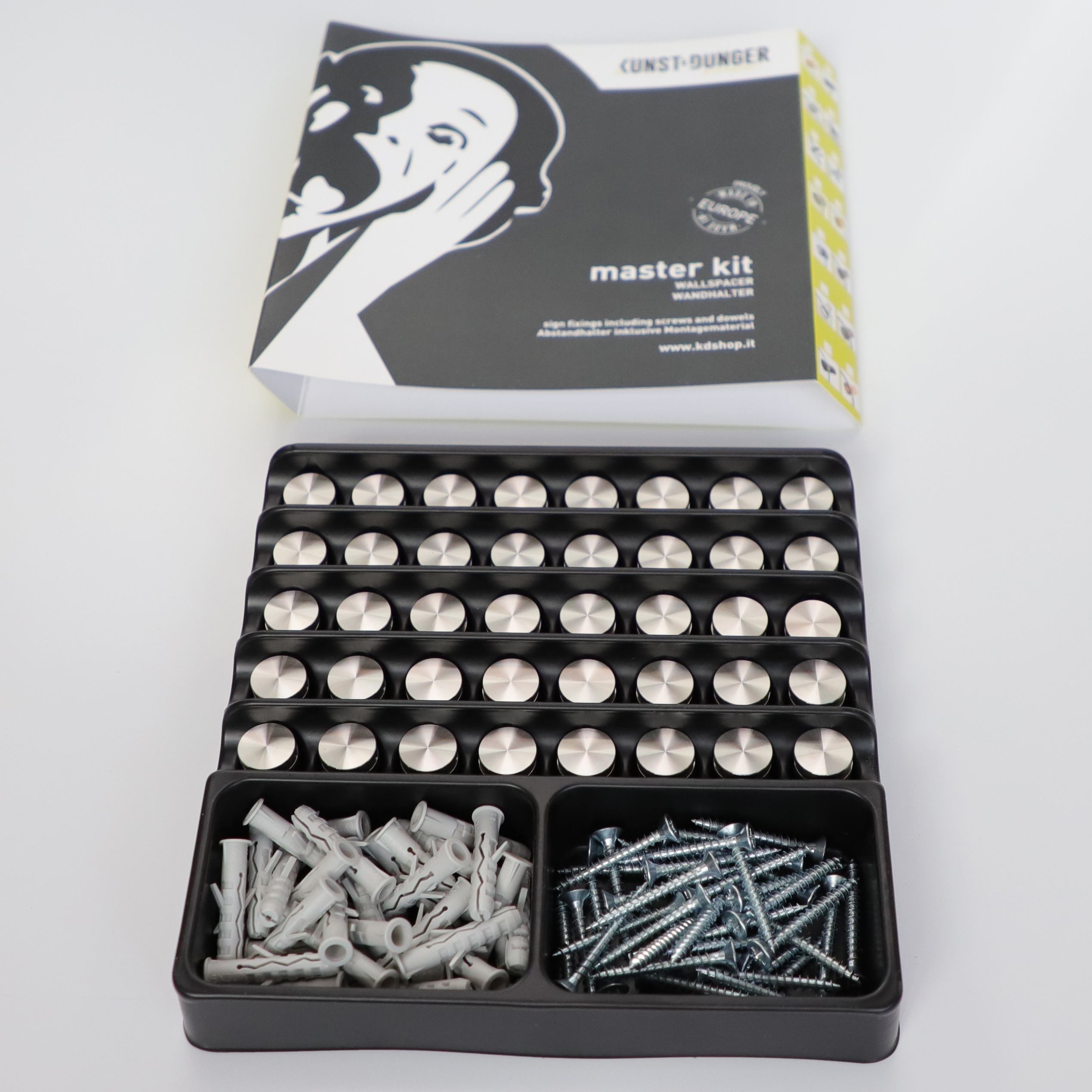Il sistema a innesto a prova di manomissione con bloccaggio tramite vite senza testa per il fissaggio di targhe in vetro, stampe su pannelli, targhe per porte e targhe aziendali: fissare il supporto alla parete, posizionare il pannello, inserire la testa attraverso il pannello nel supporto e fissarla con la vite senza testa laterale nel supporto per impedirne la manomissione.