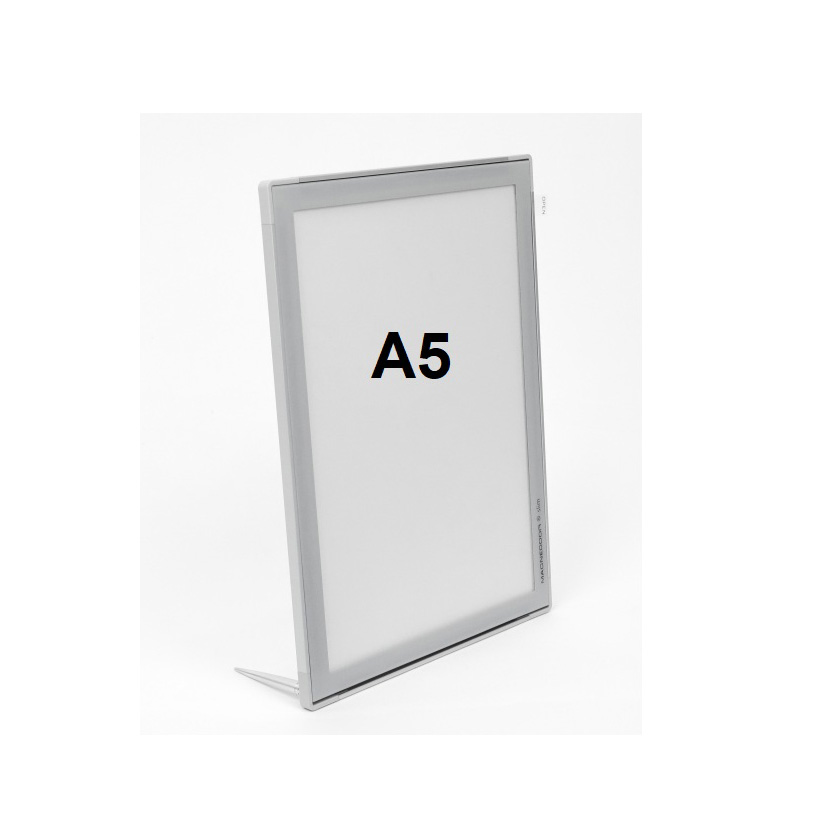 Cornice a cambio rapido con tecnologia magnetica: basta rimuovere la pellicola di copertura con stampa passe-partout e bande magnetiche, inserire il poster, mettere la copertura e il gioco è fatto. La copertura in plastica antiriflesso con stampa passe-partout presenta perfettamente le vostre immagini, stampe, foto, pubblicità o altre informazioni. Cambio delle informazioni facile e veloce grazie alla tecnologia magnetica. I due piedini in alluminio anodizzato argento opaco sono avvitati ai connettori angolari e possono essere posizionati sia in formato verticale che orizzontale.
