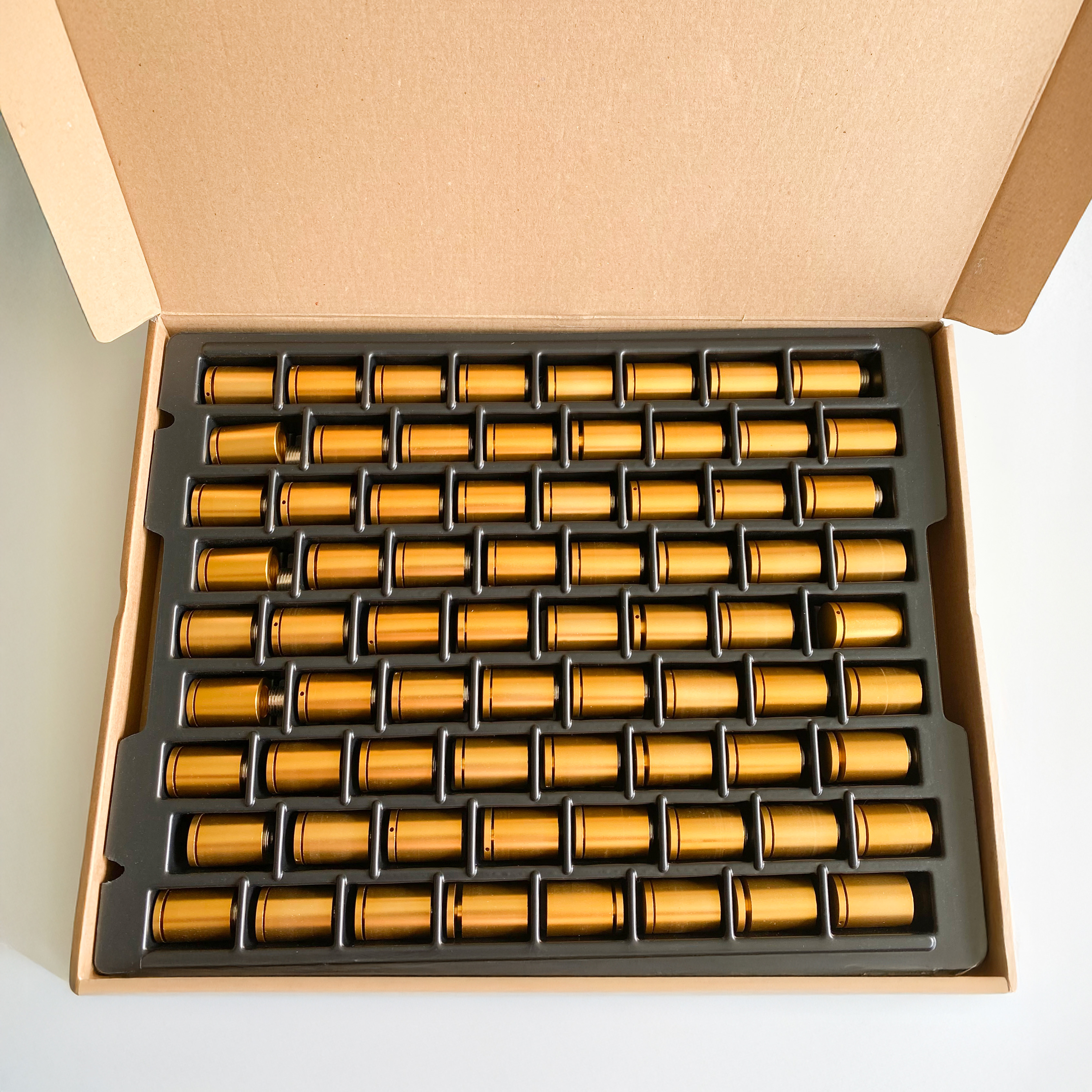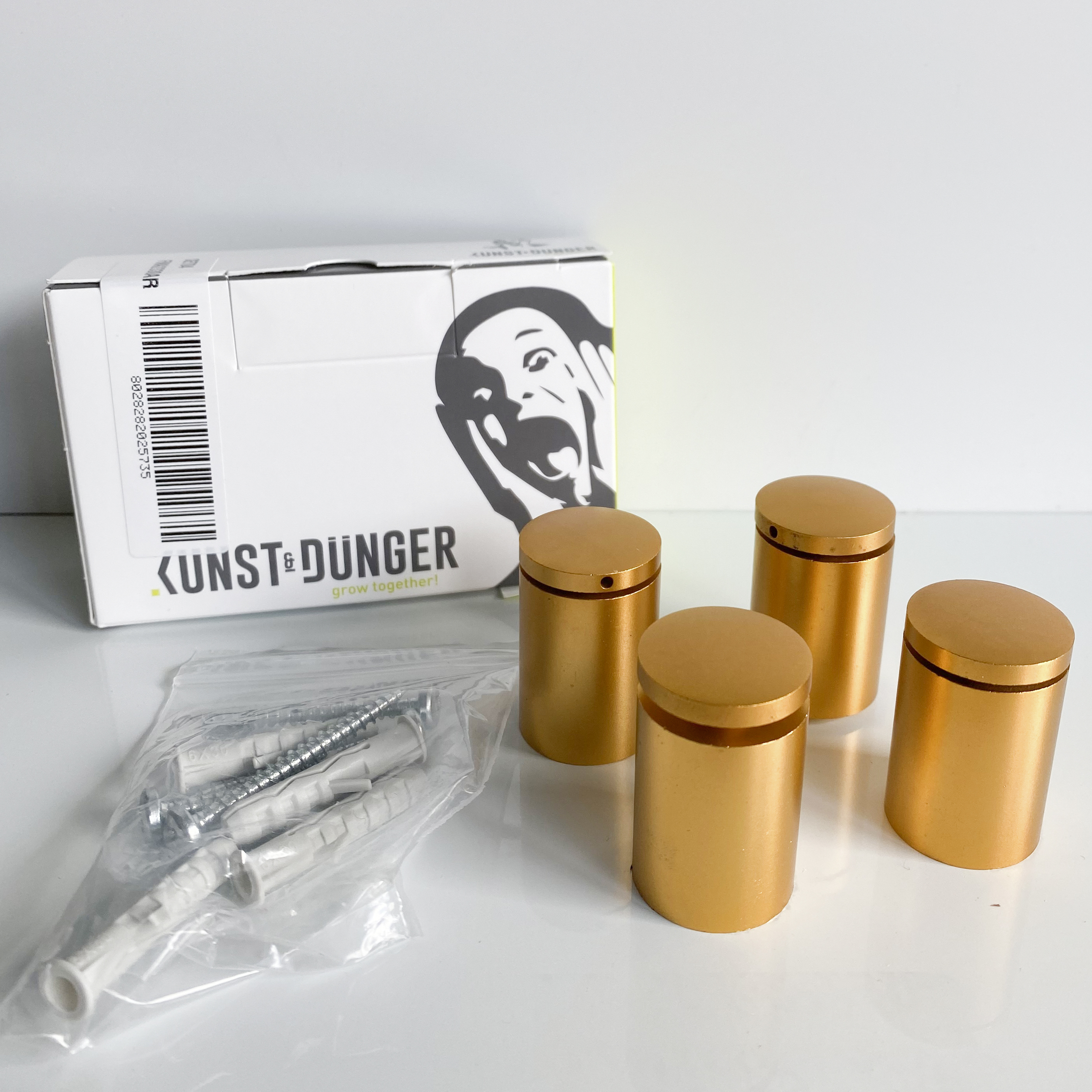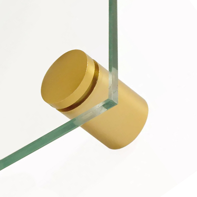 Distanziatore in tre parti con sistema a vite in alluminio, parti anodizzate oro opaco a vista. Montare il manicotto filettato sulla parete, avvitare il manicotto distanziatore, posizionare il pannello da fissare sopra e avvitare e fissare con le teste della staffa. I manicotti distanziatori hanno un bordo rialzato che si inserisce nel foro praticato nei pannelli e facilita il posizionamento del pannello. Consigliamo quindi questo sistema soprattutto per insegne e pannelli di grande formato. La testa del supporto è fissata nel manicotto distanziatore con una filettatura sinistra. Sul bordo della testa è presente un piccolo foro che consente di serrare la testa nel manicotto distanziatore con un attrezzo appropriato o un perno metallico. Questo e la filettatura sinistra rendono il supporto affidabile e a prova di manomissione.