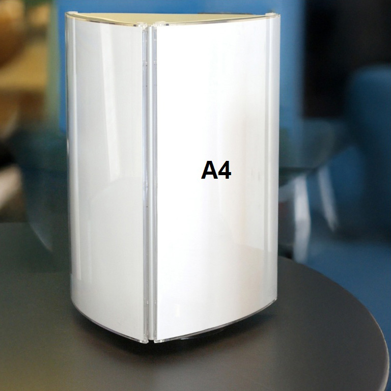 Espositore da banco girevole in entrambe le direzioni con tre tasche Pixquick in policarbonato stampato a iniezione, su una base in plastica nera con cuscinetti a sfera.