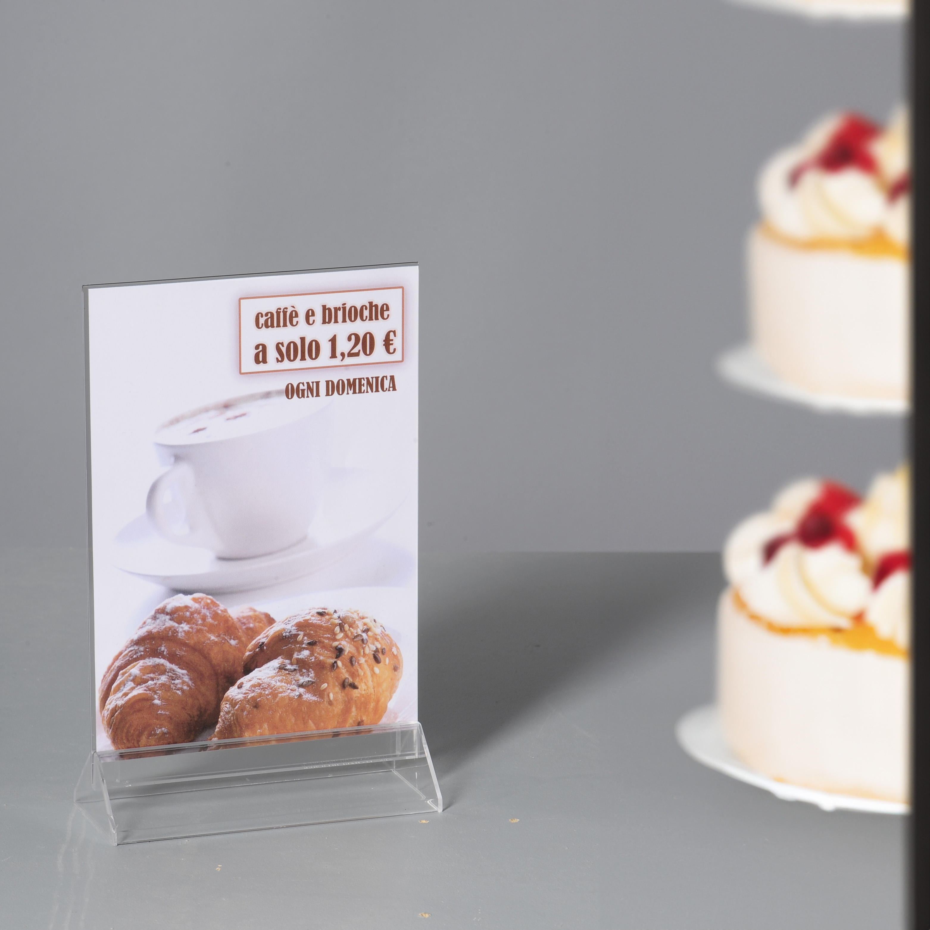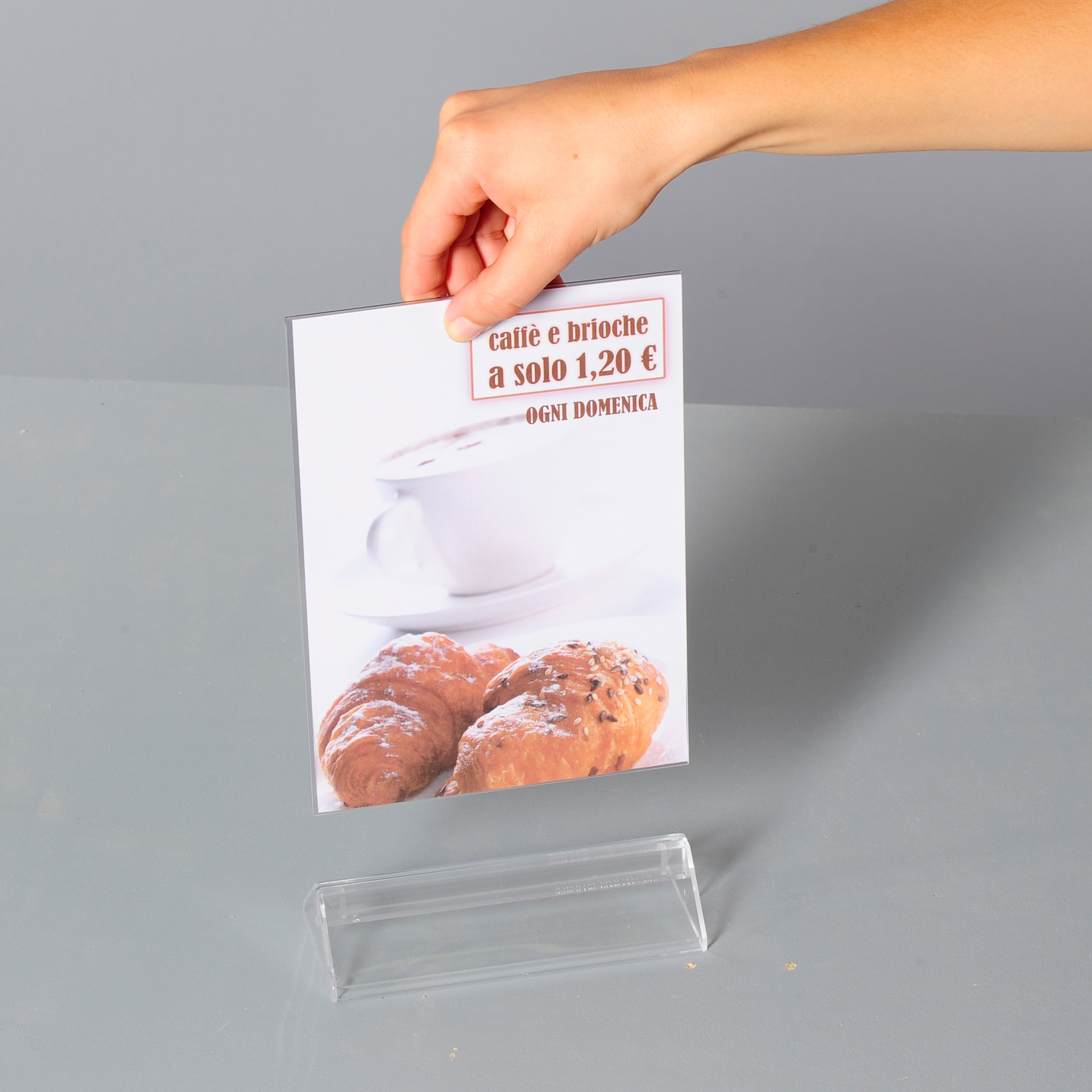 Supporto per banchi e banconi in polistirene trasparente stampato a iniezione per la presentazione bifacciale di stampe con spessore di 1 mm (100 mm e 150 mm) o 2 mm (210 mm)