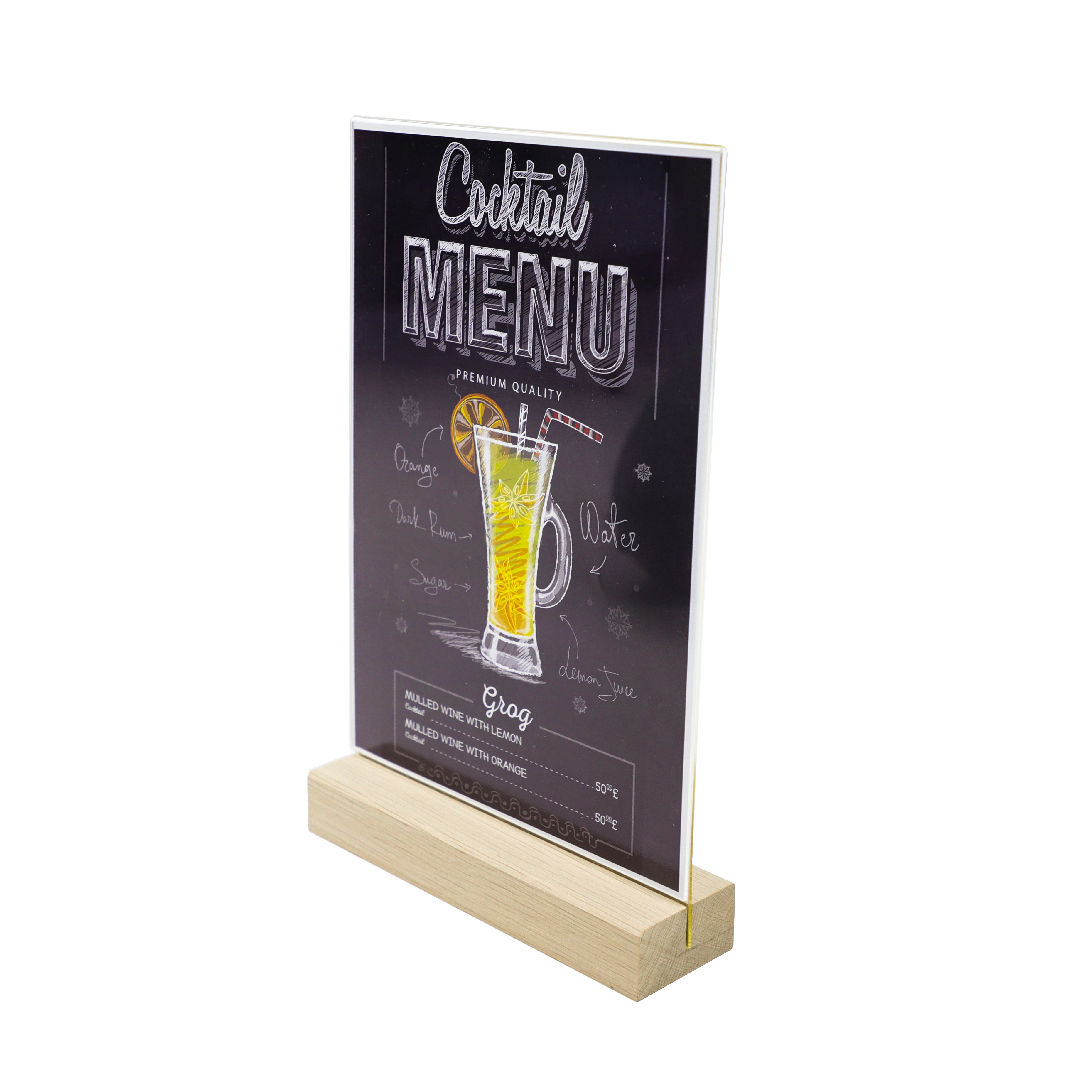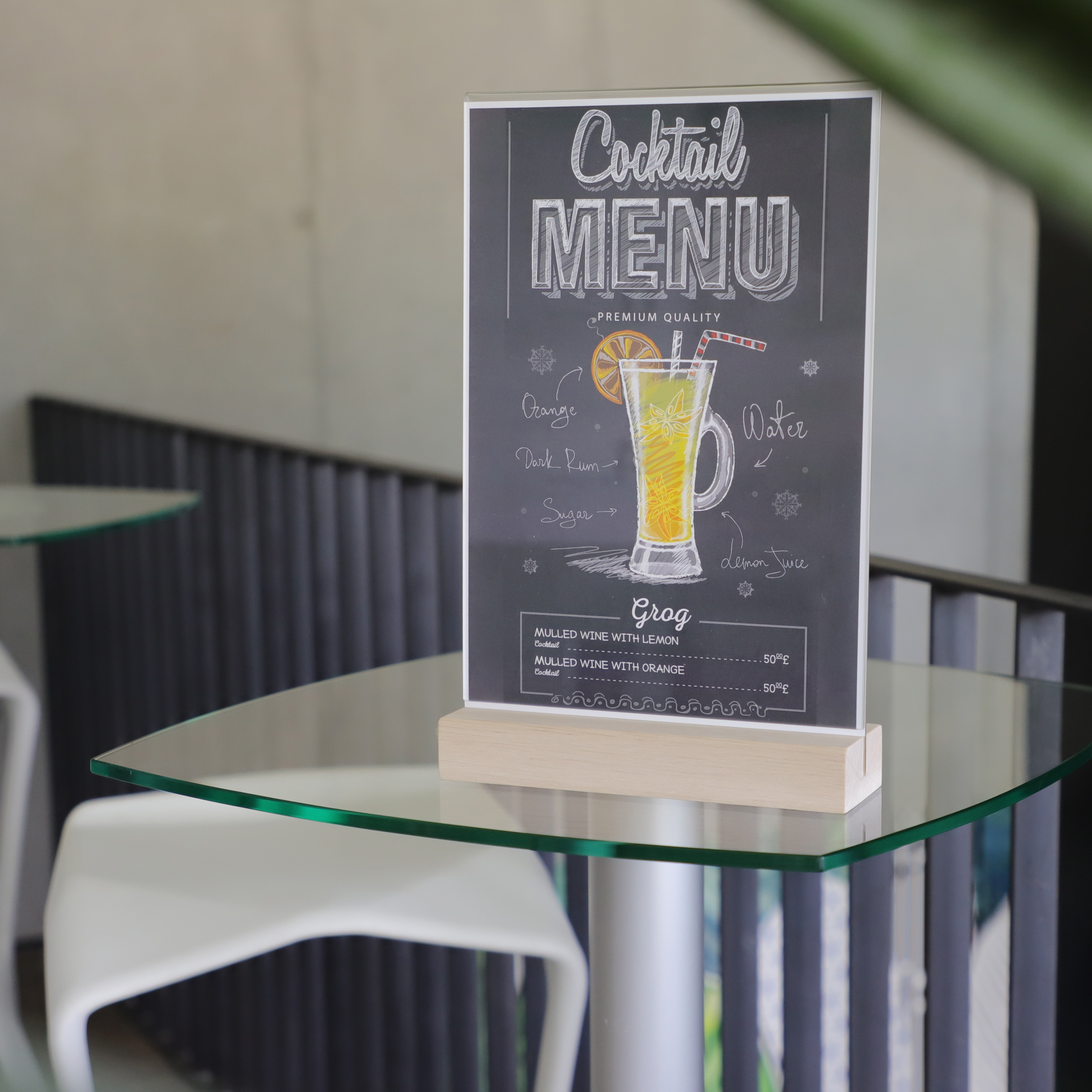 Insieme alla tasca in acrilico per la presentazione delle informazioni su entrambi i lati, è l'espositore ideale per il tavolo e il bancone, per informazioni naturali e sostenibili, per i menu e i cartellini dei prezzi in hotel, ristoranti e negozi.