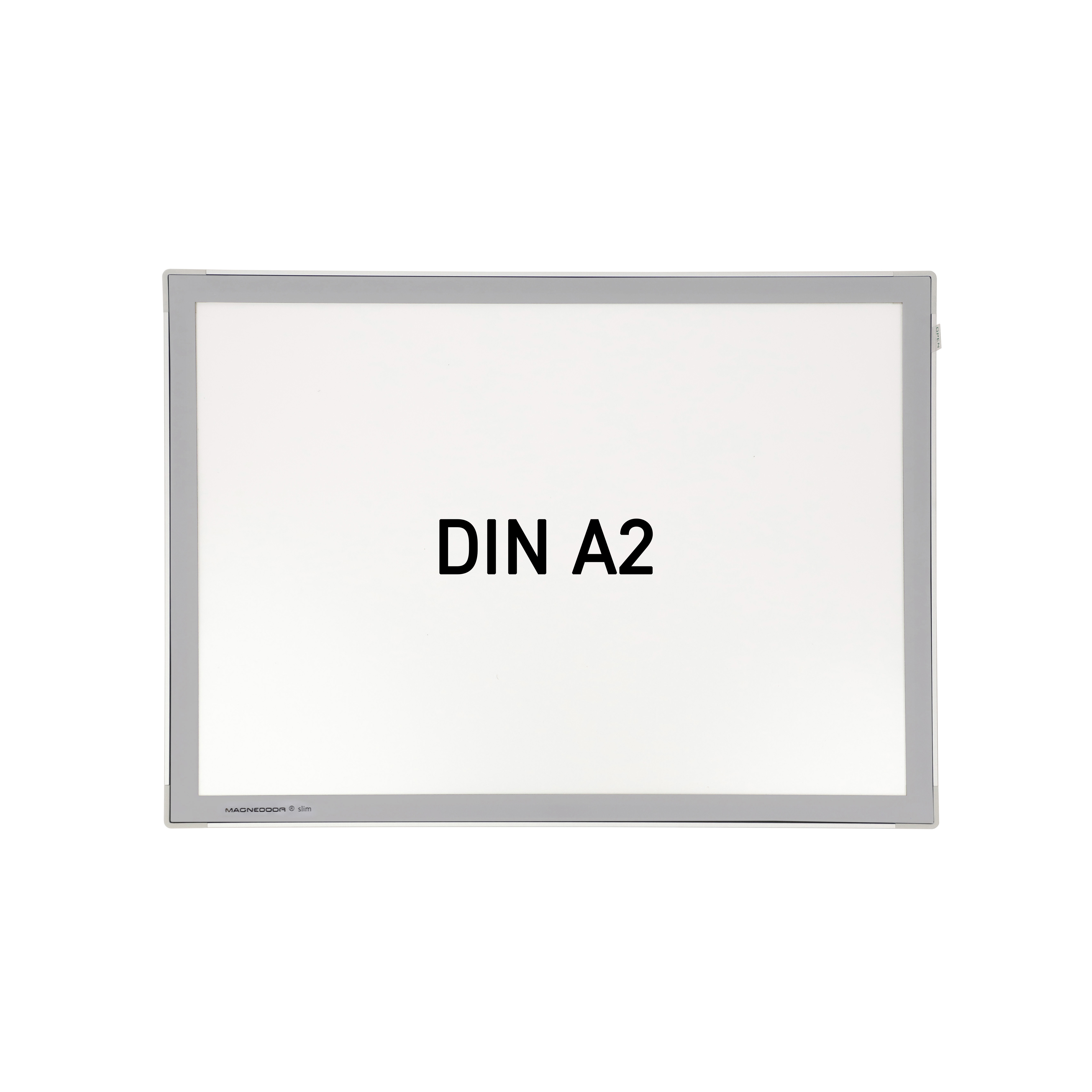 Cornice per il cambio veloce di poster e banner con chiusura magnetica, aspetto snello e leggero. Alluminio anodizzato, robusto retro in materiale plastico, bordi stampati di color grigio-argento, foglio protettivo in PVC flessibile anti-riflesso completamente rimovibile. Un robusto listello magnetico rende possibile il fissaggio del foglio protettivo alla struttura. Cambiare informazioni è quindi facile e veloce adatto a montaggio orizzontale e verticale. Ideale per poster pubblicitari, affissioni, manifesti, cartelli, menù, listini prezzi e fogli informativi.